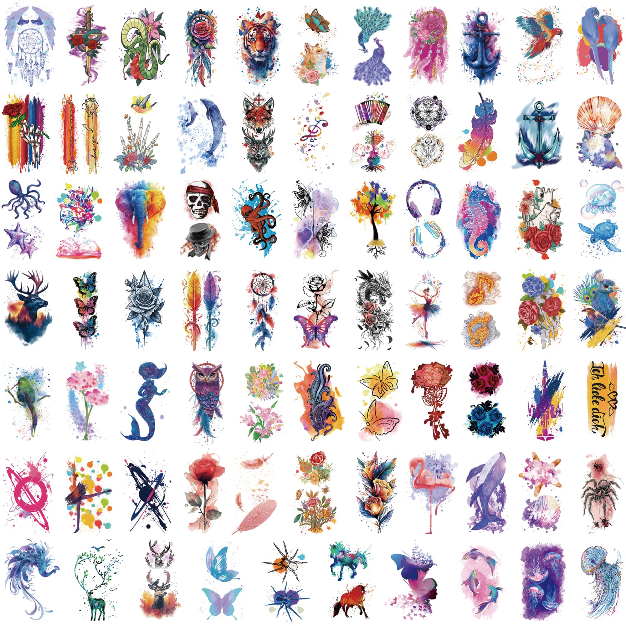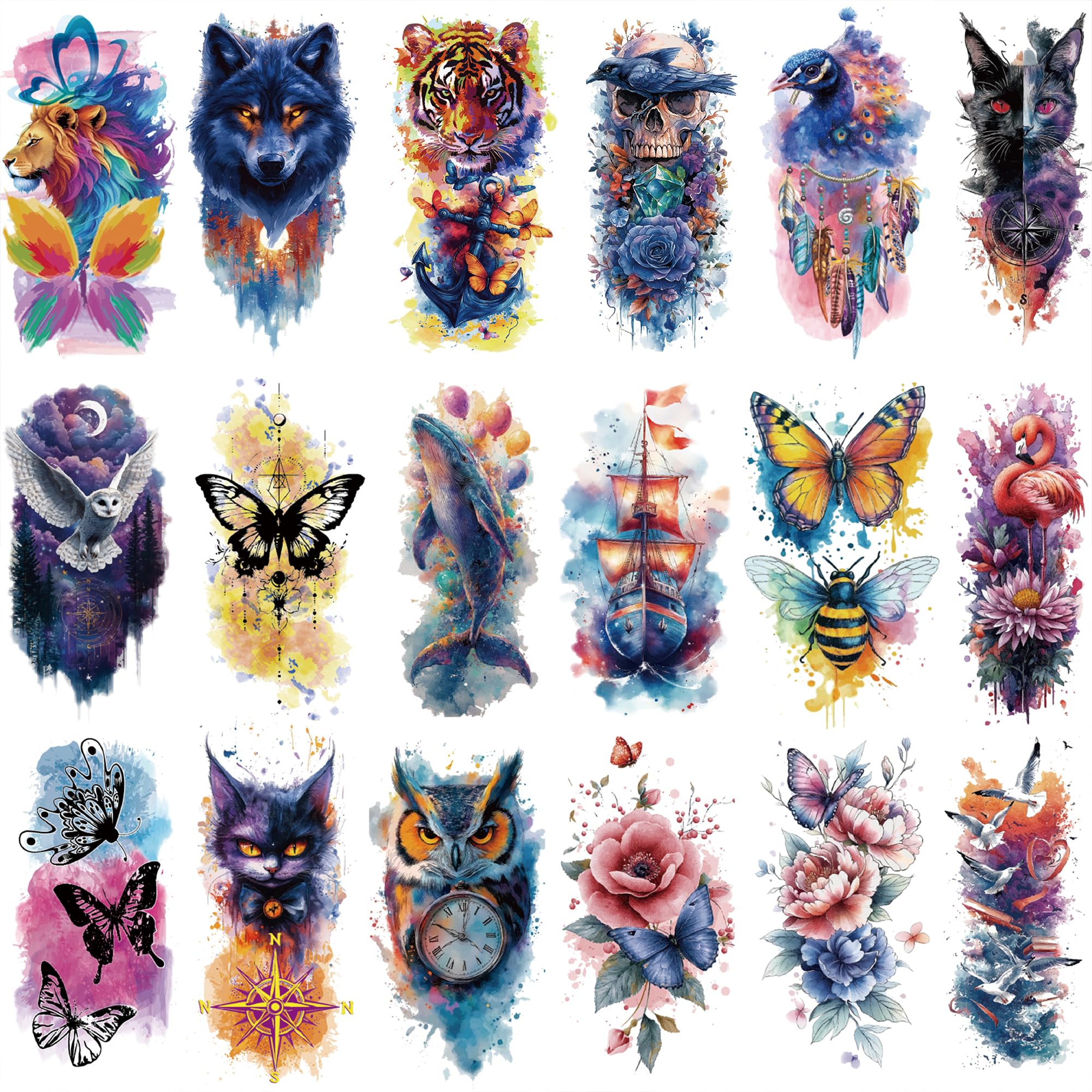 đ¸ăVibrant & Diverse Designsă â This set includes 96 sheets of watercolor temporary tattoos, featuring stunning animal, flower, and nature-inspired patterns. It contains 18 large designs (19 cm x 9 cm) and 78 smaller designs (10 cm x 6 cm), offering a variety of options for adults and women.