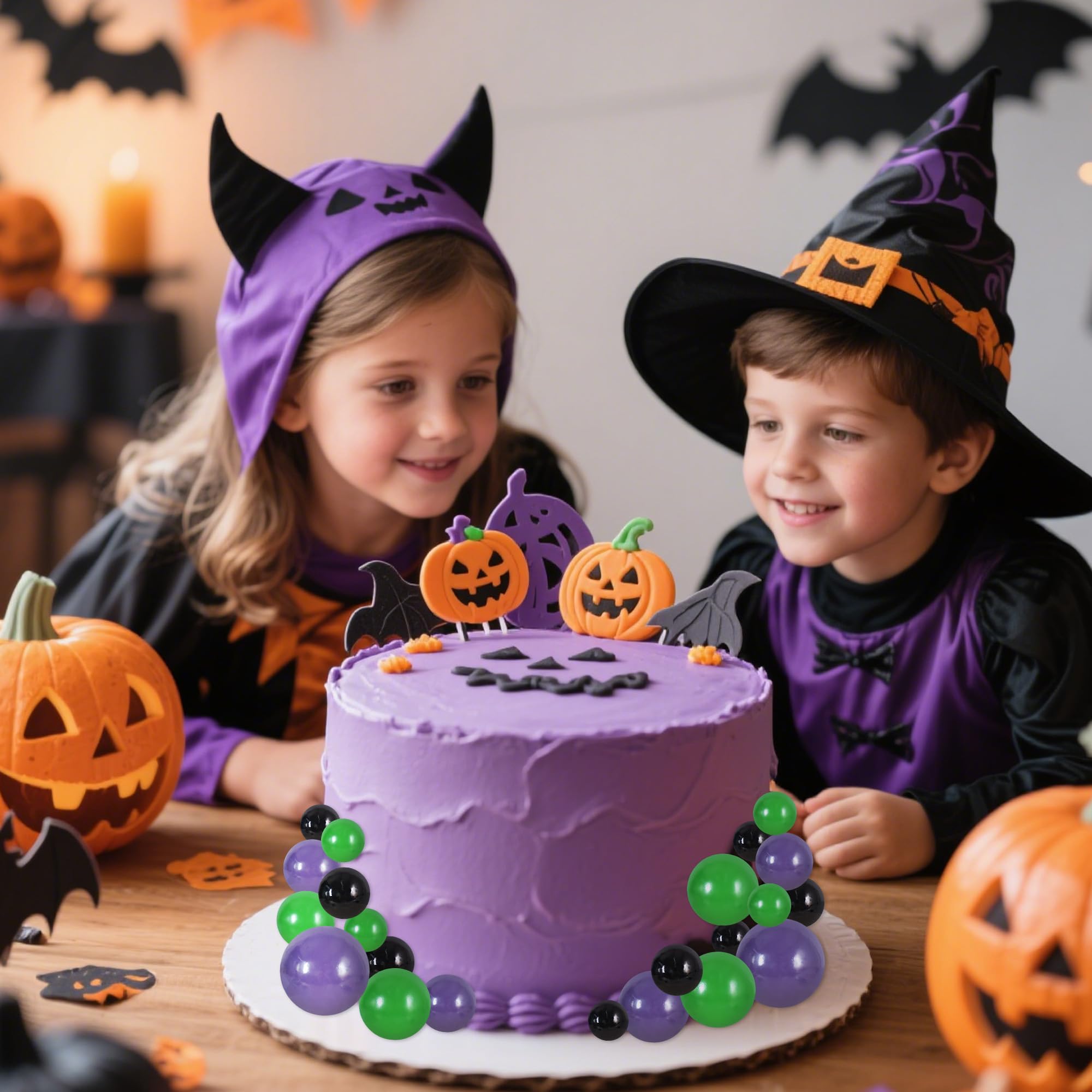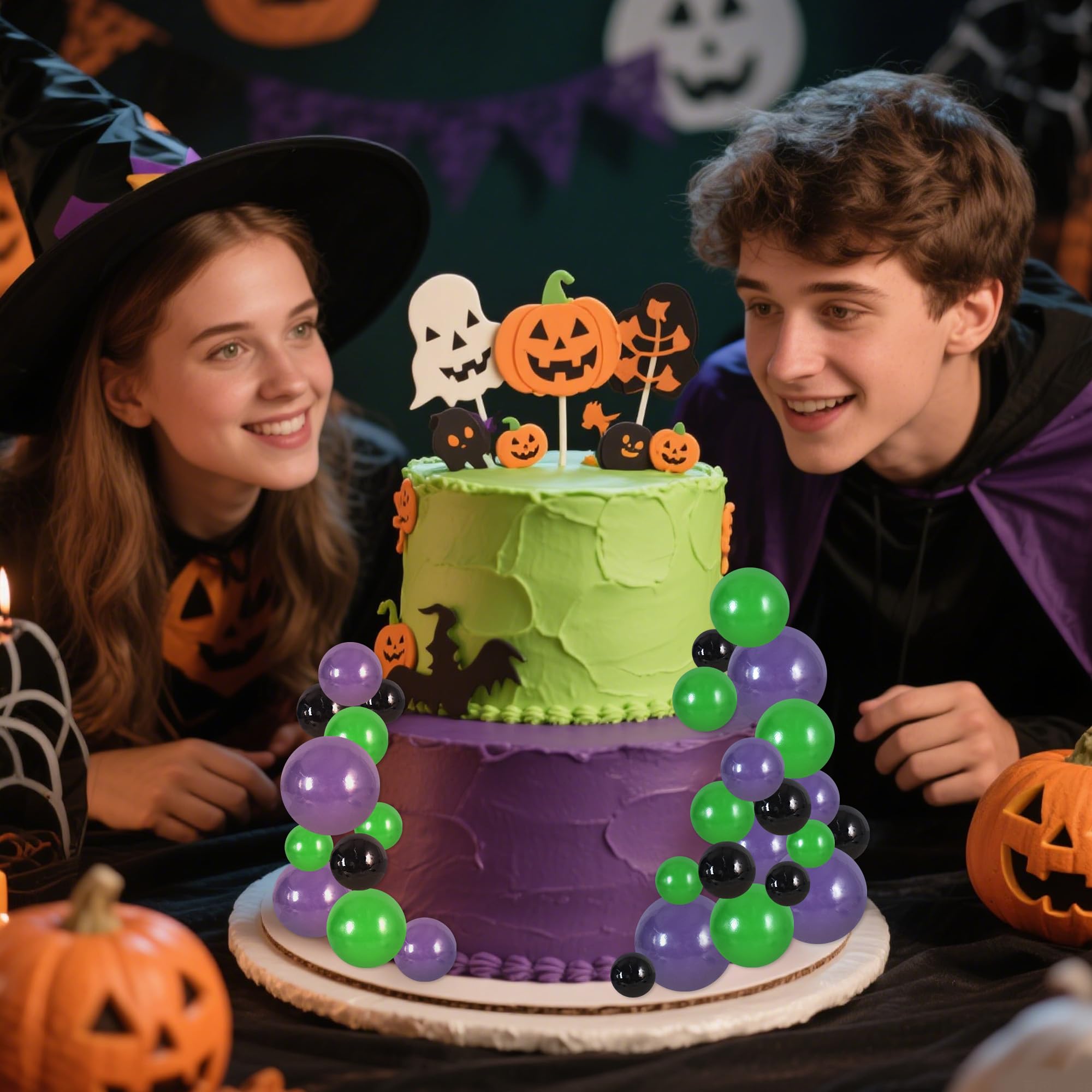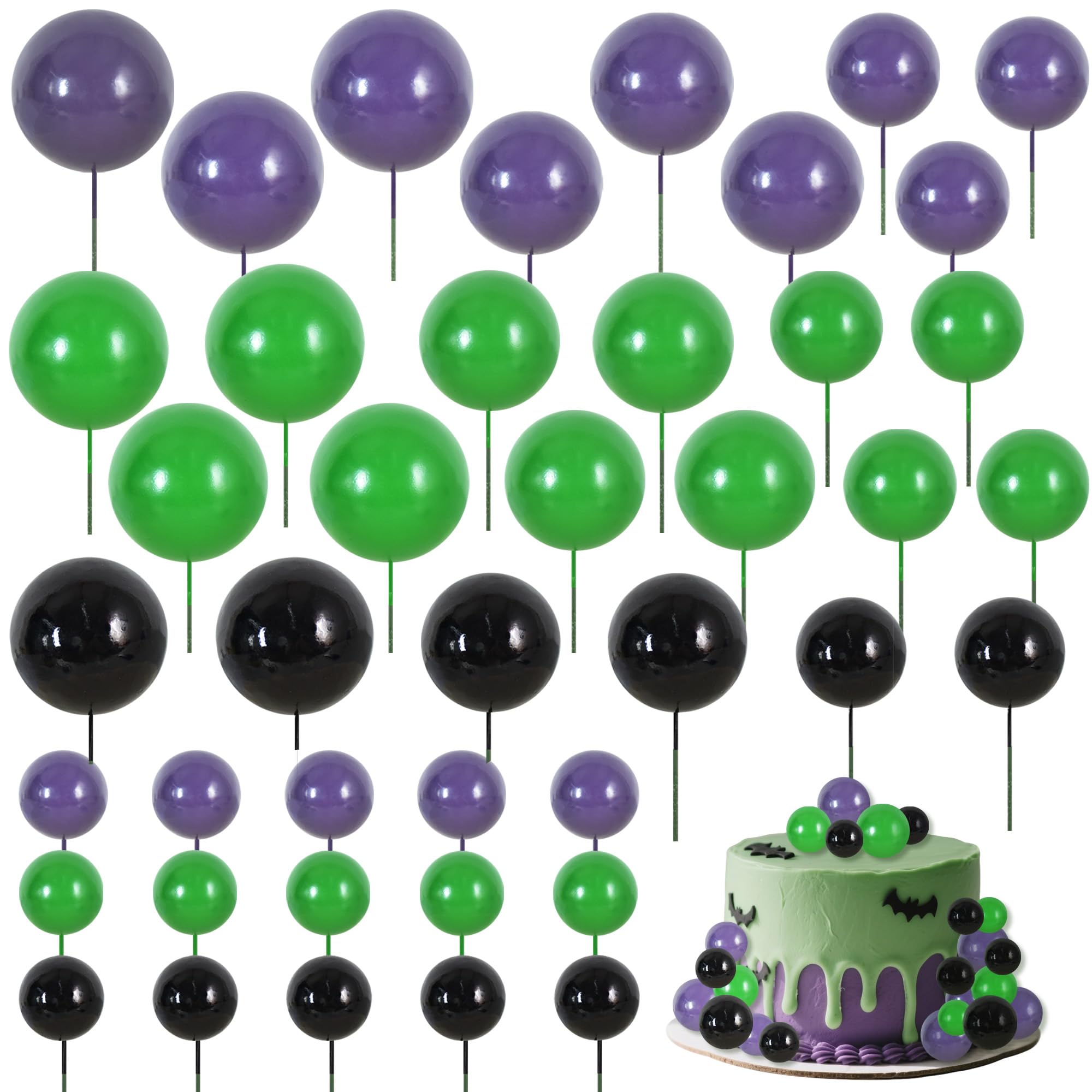 【Package include】40 pieces plastic foam balls cake toppers in 3 colors:black, green, purple. Size:including 0.79 inch x10, 0.98 inch x10, 1.18 inch x10, 1.57 inch x10.
