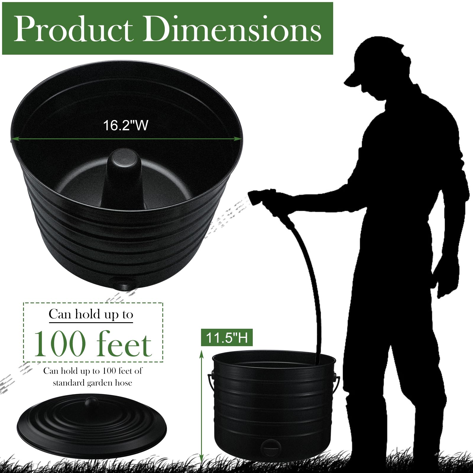 Large Storage Space: This water hose pot measures 16.2"W x 11.5"H, the pot can hold up to 100 feet of standard garden hose, making it suitable for most common hose sizes. Also it to store outdoor essentials such as gardening tools, watering cans, or even outdoor decorations