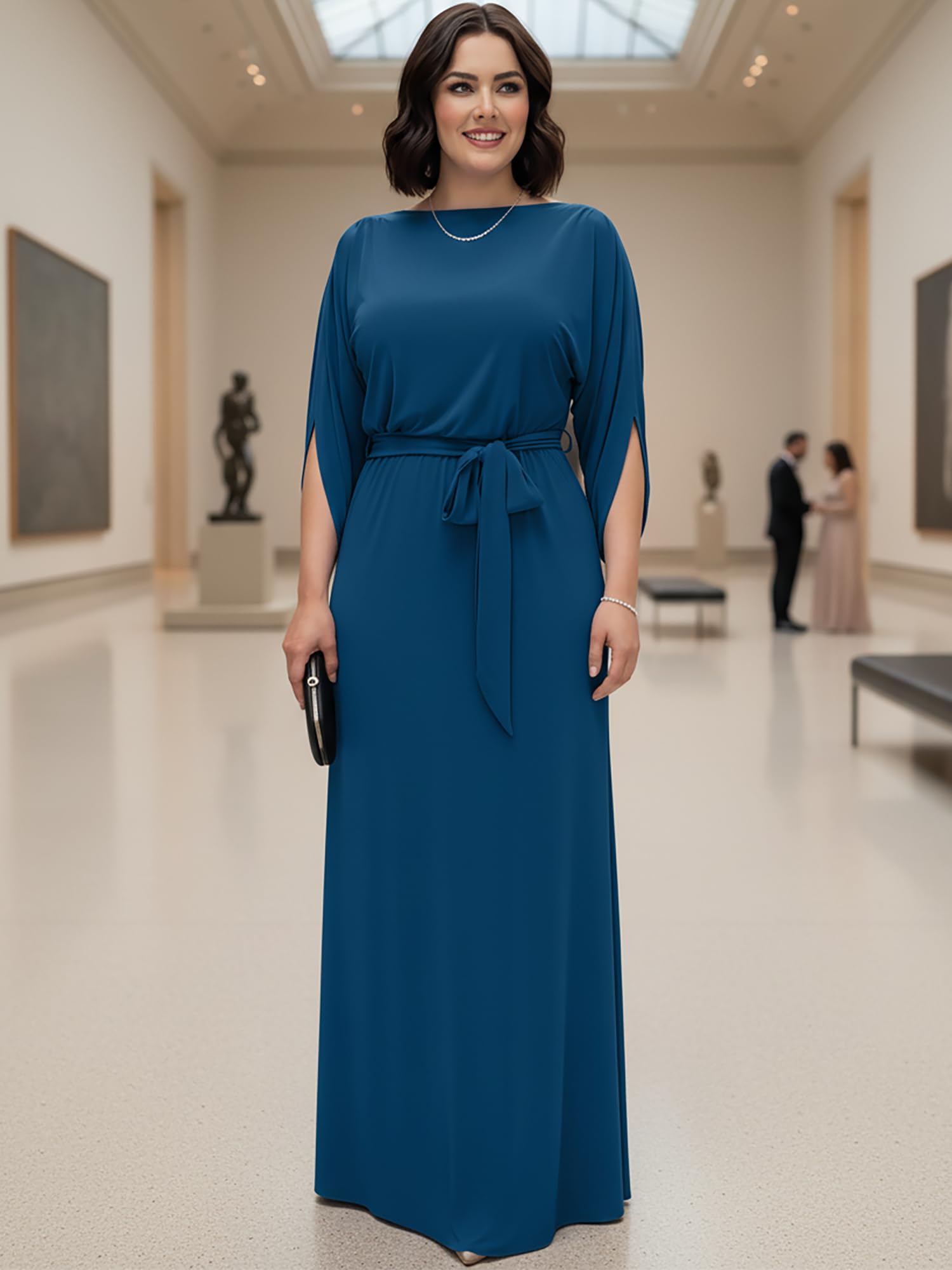 Boat neck short sleeve Capri Blue maxi dresses; womans long flowy empire waist maxi dresses; simple elegant maxi dresses; flattering maxi dresses; stretchy elastic comfortable full figure slimming maxi dresses; ladies curvy comfy frocks