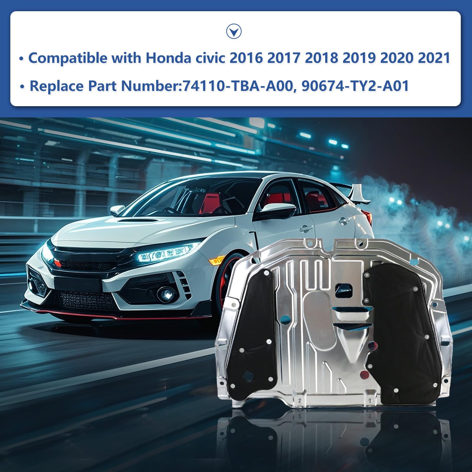 [Compatible With] : this engine splash shield Fit for Honda Civic 2016 2017 2018 2019 2020 2021 Replace OEM Number 74110-TBA-A00, 90674-TY2-A01.