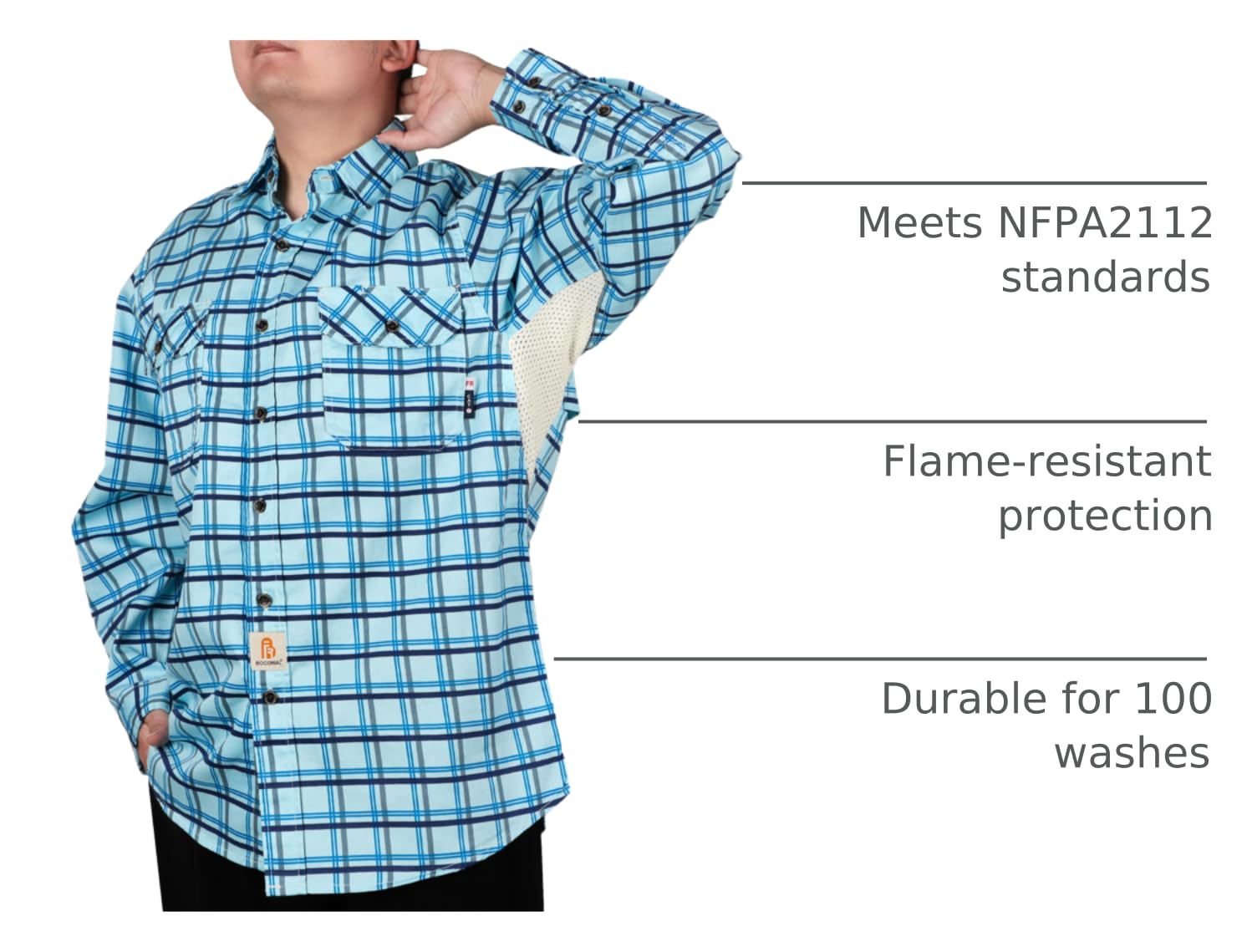 Water and Oil Repellent Finish 6.5oz lightweight cotton twill FR treated,Flame resistant Modacrylic/Cotton Blend mesh.FR buttons,FR aramid sewing threads! clearly FR tag on pocket.Prewashed Preshrunk and Wrinkle-Free.