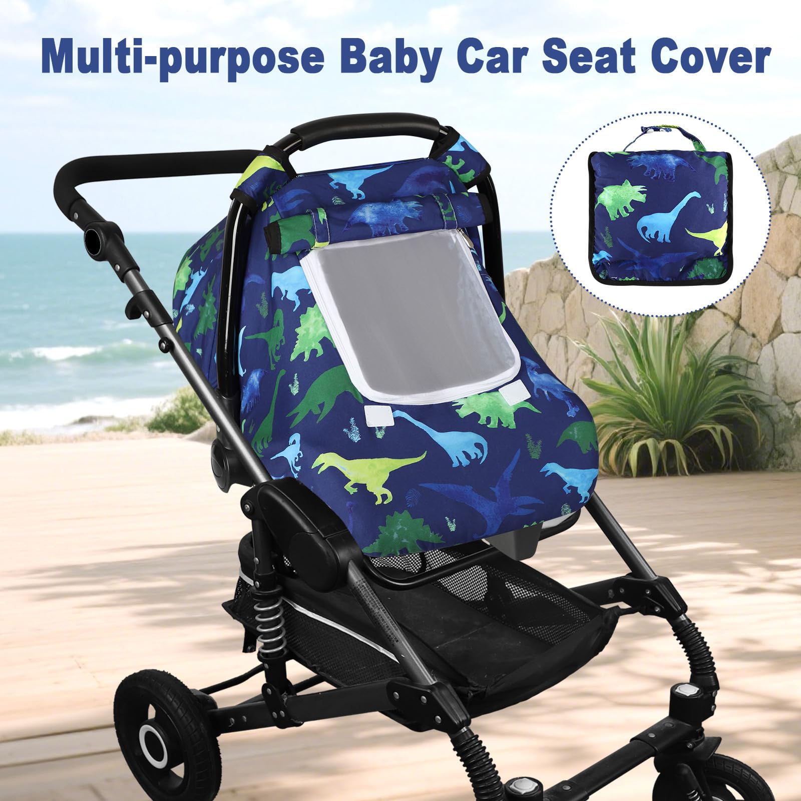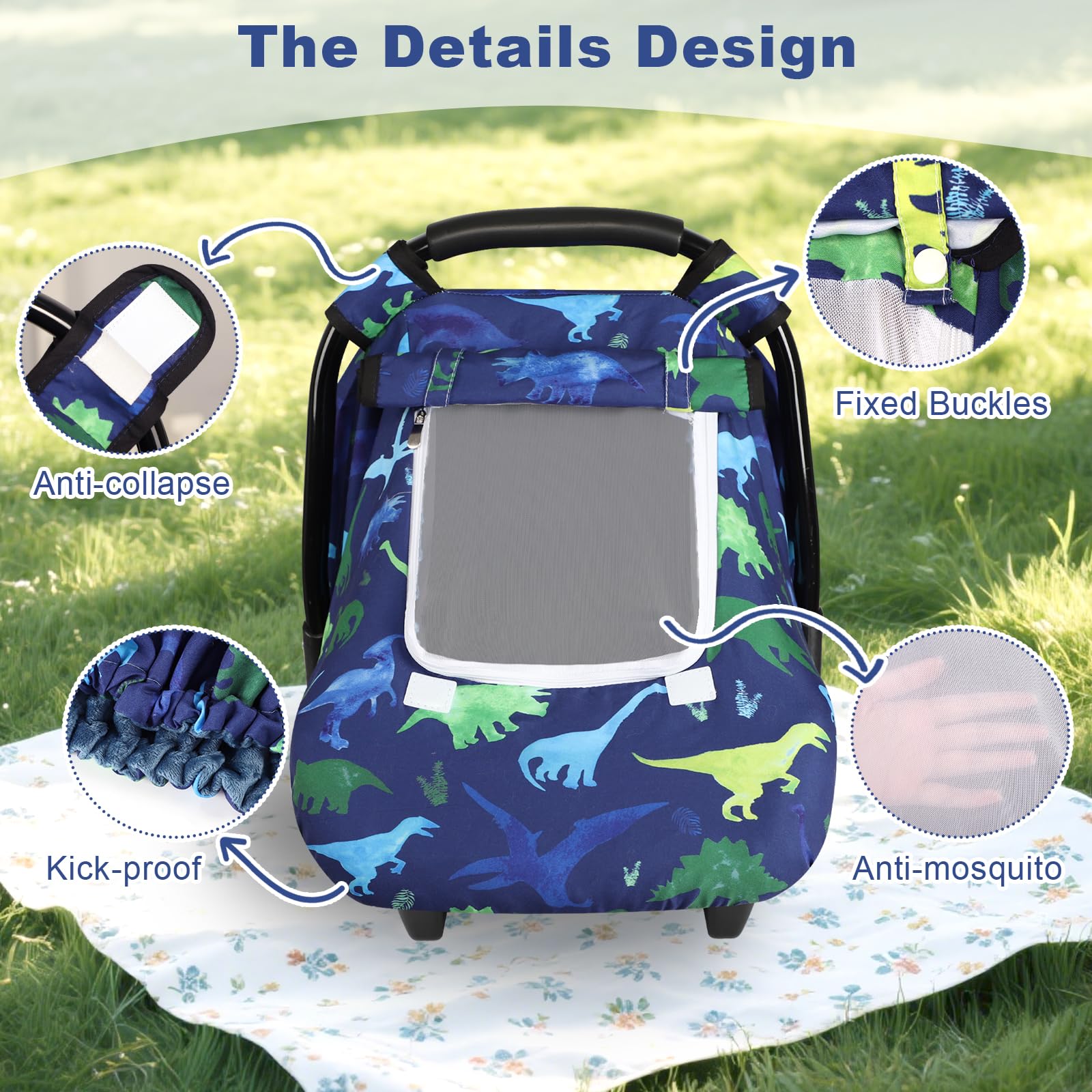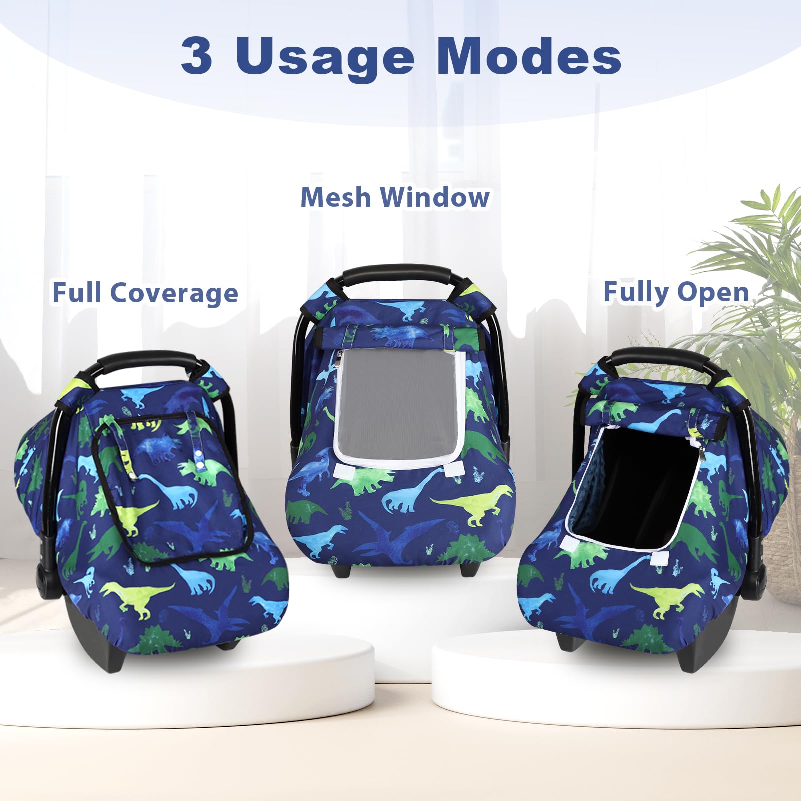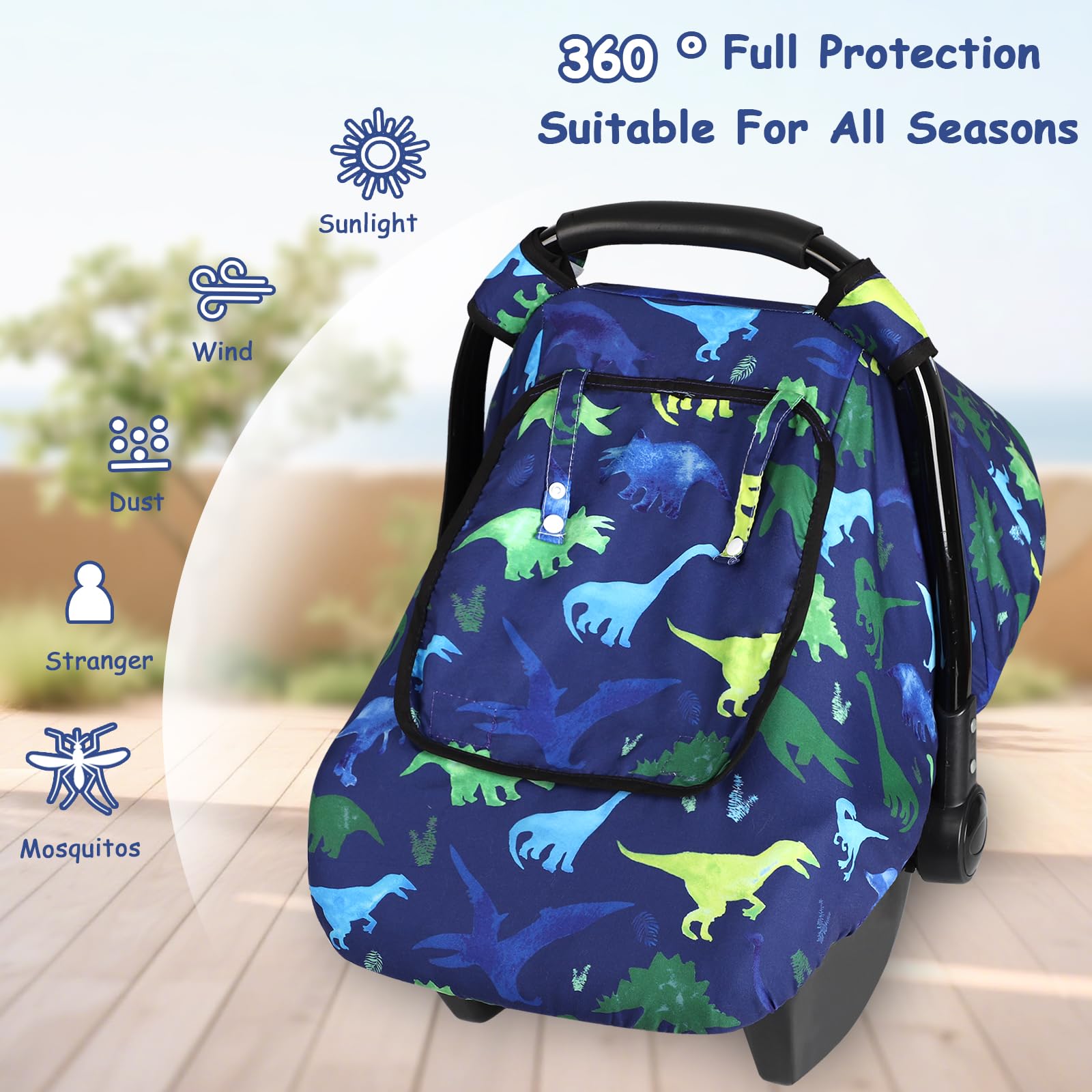 Windproof Baby Car Seat Cover, 3D Mink Dot Infant Car Seat Canopy with Breathable Mesh Window, Baby Carrier Cover for All Seasons, Easy Access Carseat Carrie Snug Fit Stroller, (Dinosaur)