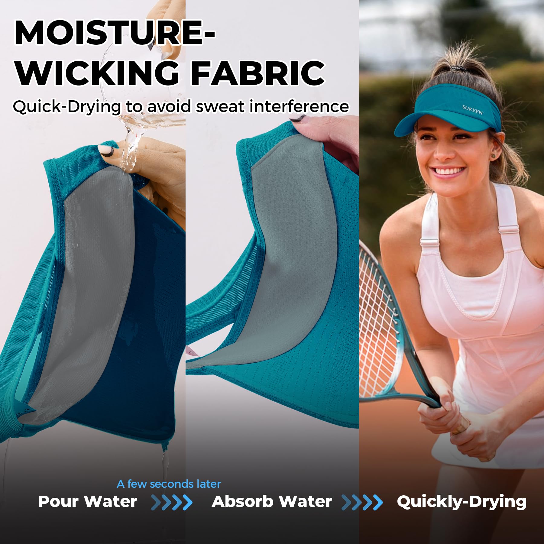 QUICK-DRYING & SWEAT-ABSORBING: This visor is designed to provide quick drying during the summer. The built-in sweatband is made of quick-drying fabric, which can quickly absorb sweat, guide moisture to the outer layer to keep you cool and dry even during intense workouts or hot summer days.
