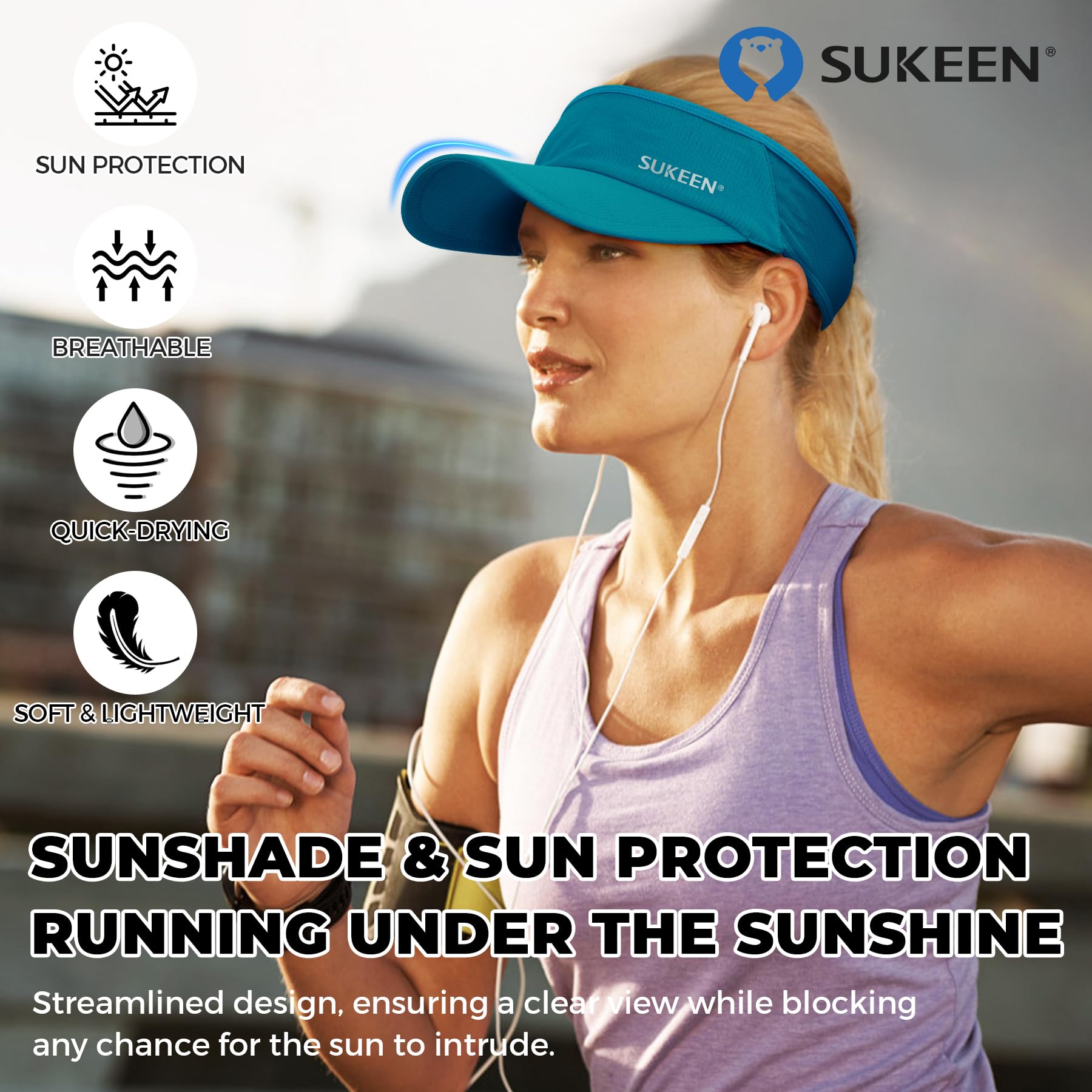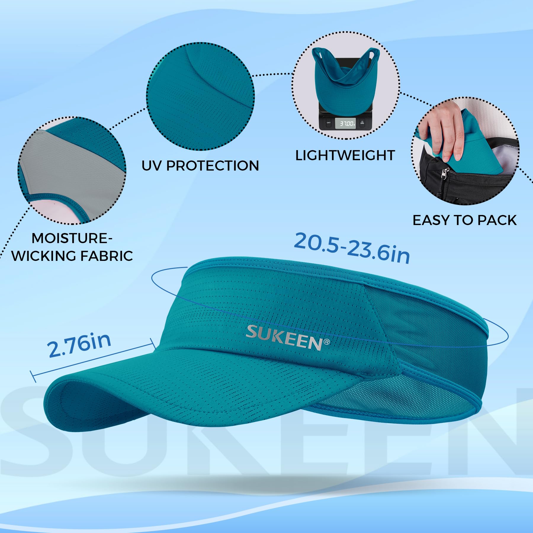 LIGHTWEIGHT & PACKABLE: The Sukeen Lightweight Sports Sun Visor is made with lightweight materials, including a superior HDPE material for the brim board. With a weight of only 37g, this visor provides long-lasting comfort without any head pressure. Additionally, its soft fabric allows for easy storage in a bag or pocket, making it an ideal choice for on-the-go outdoor activities.