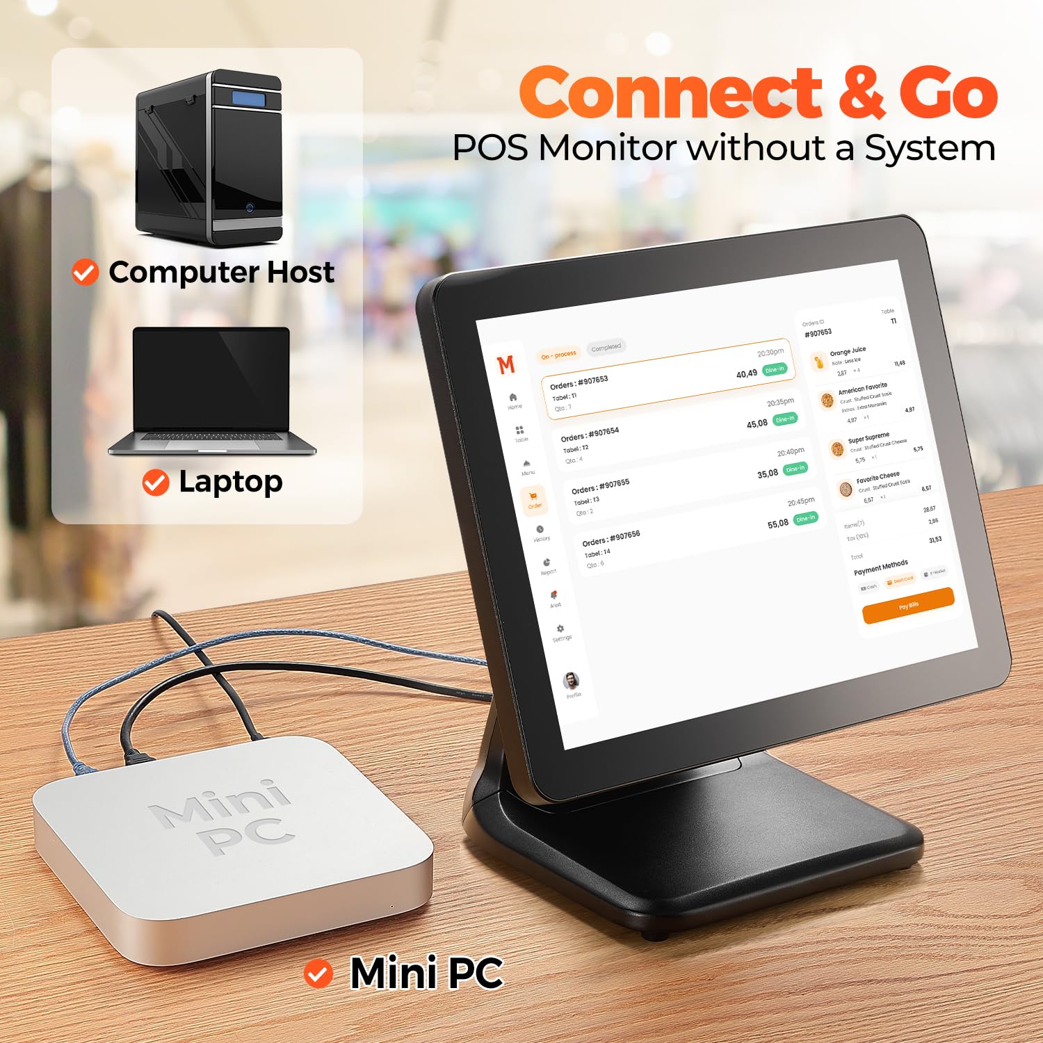 [Connect & Go] Designed for seamless integration, the MUNBYN touch screen monitor effortlessly connects to a computer host, laptop, or mini PC, ensuring you can incorporate it into your existing setup with ease. Note that this POS screen does not come with a built-in operating system, giving you the flexibility to pair it with your own device.