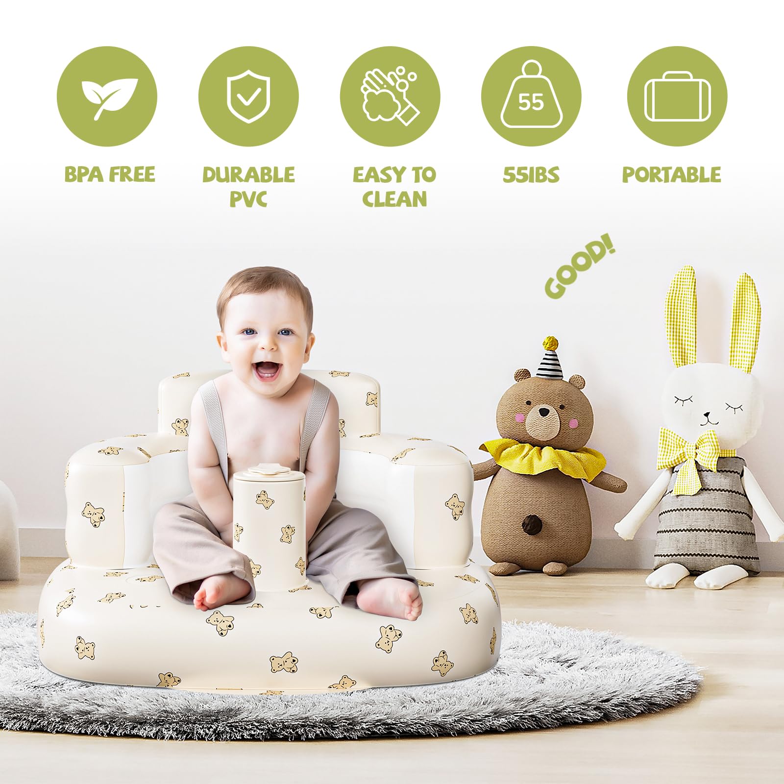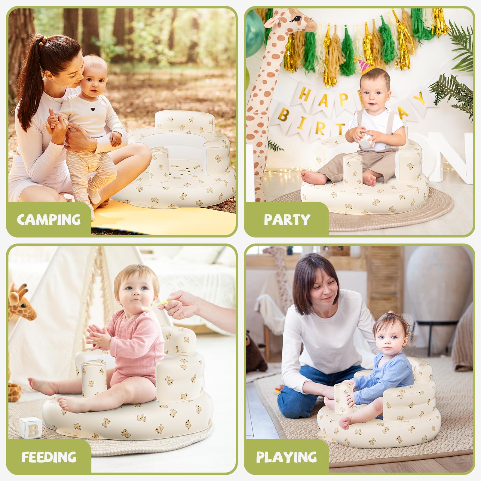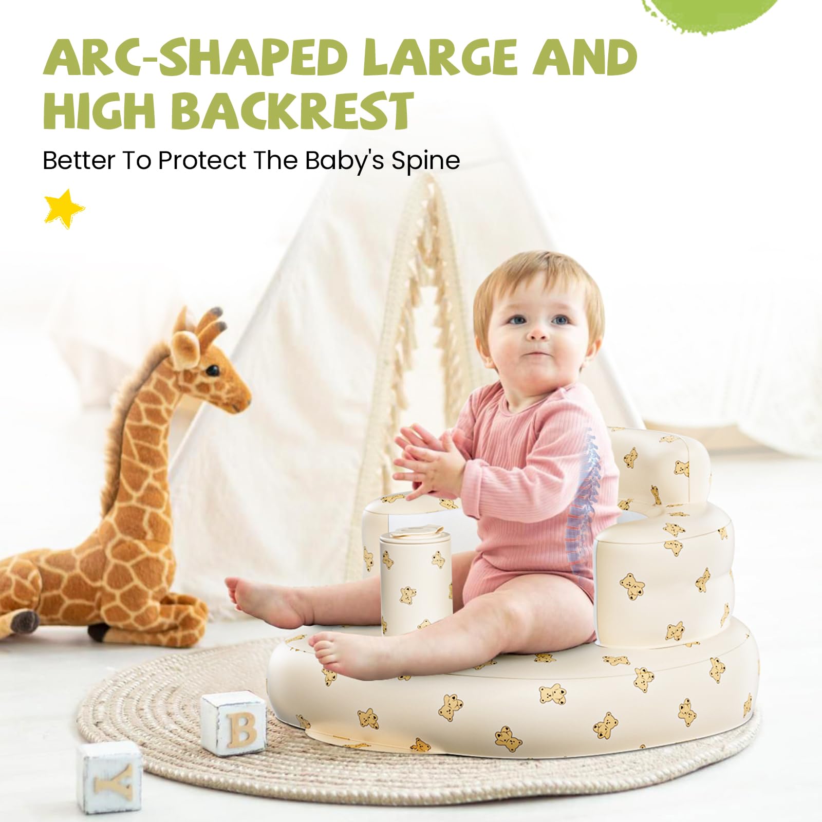 【Multifunctional】Baby floor seat can be used for feeding, sitting up, playing at home, learning training, and as a fun inflatable sit up chair for baby, it could also be a beach seat or camping seat when traveling. Parents can use the baby sit up chair for supervision, cuddling, lounging, tummy time, playtime, and diaper changes. With this baby portable seat, your child can safely explore the world around them, while you enjoy peace of mind