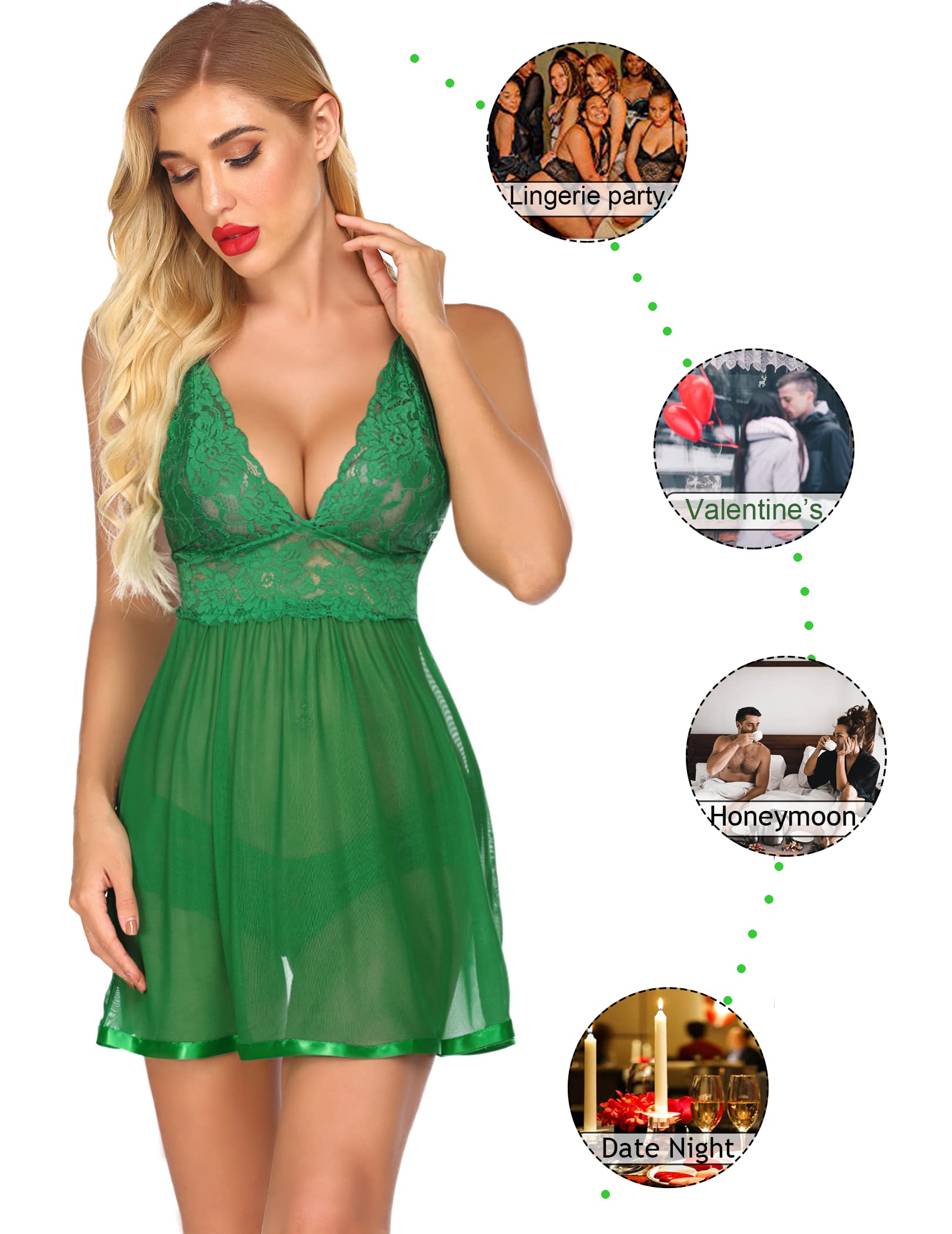 【Unique Design】This lace babydoll lingerie features deep V-neck lace cups and open back design that beautifully contours feminine silhouette.Practical V-shaped adjustable straps ensure perfect fit and all-day comfort.Luxurious satin hem trim adds elegant detail.Sexy lace panty can be worn as a set or alone,2-in-1 design is more convenience for your trip