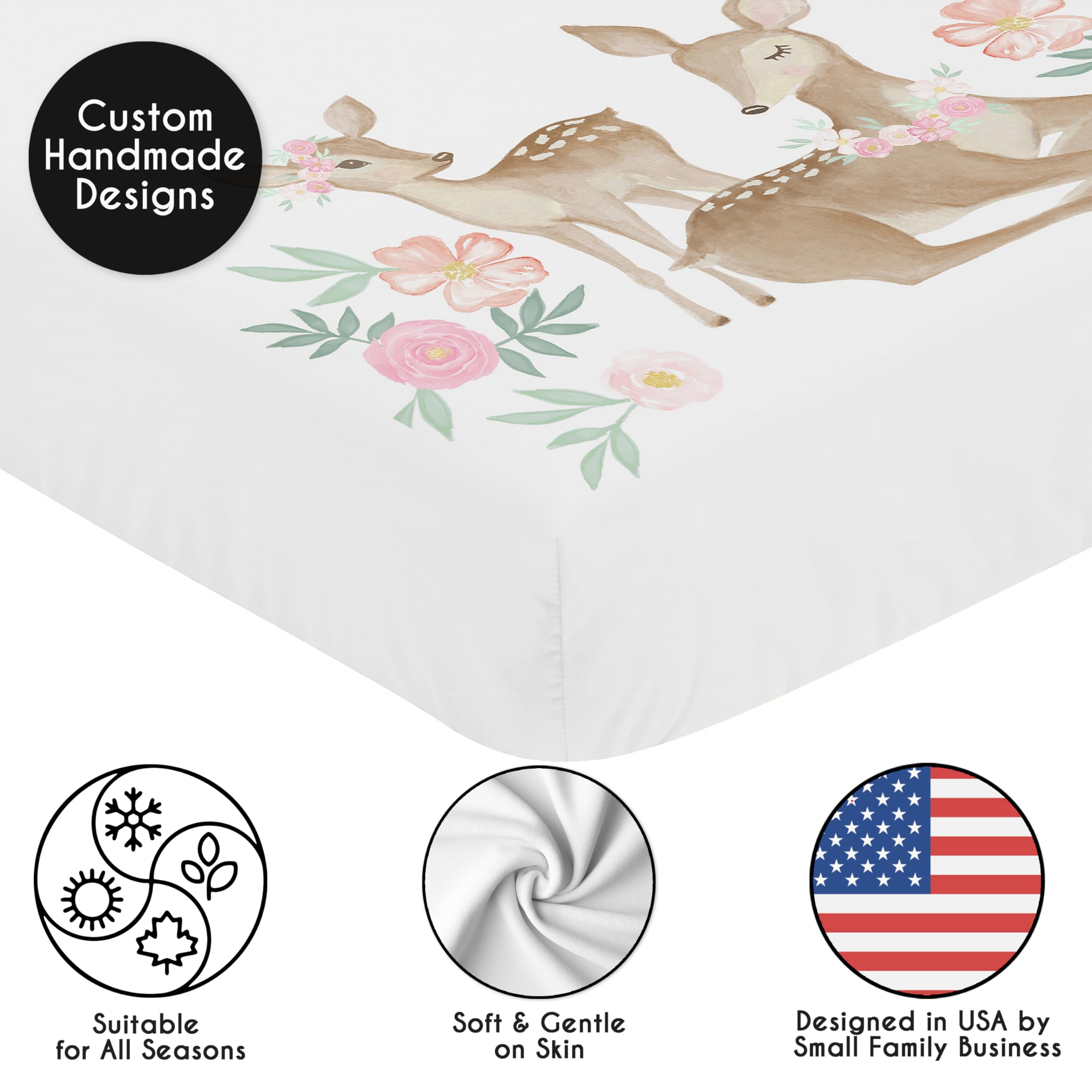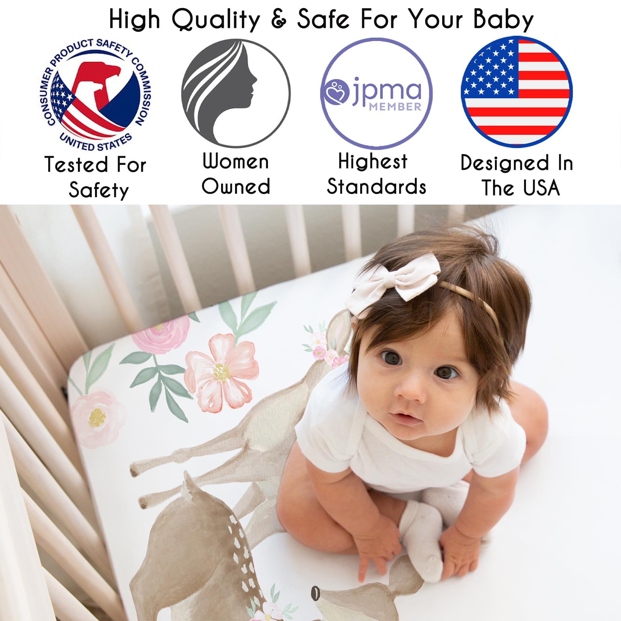 SNUG FIT: Includes (1) Fitted Crib Sheet 52in. x 28in. x 8in. Our newborn standard crib sheets fit snugly, with premium elastic sewn around the entire bottom edge for a secure fit on most standard sized cribs and toddler beds, to reduce shifting and bunching. This brushed microfiber crib sheet features an exclusive design of a blush pink, mint green & white bohemian, forest animal "Love You Deerly" shabby chic deer floral print & is gentle on delicate skin to foster a soothing sleep environment.