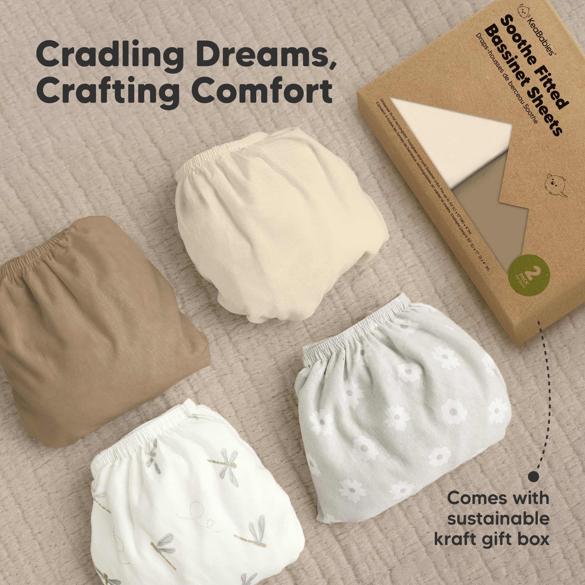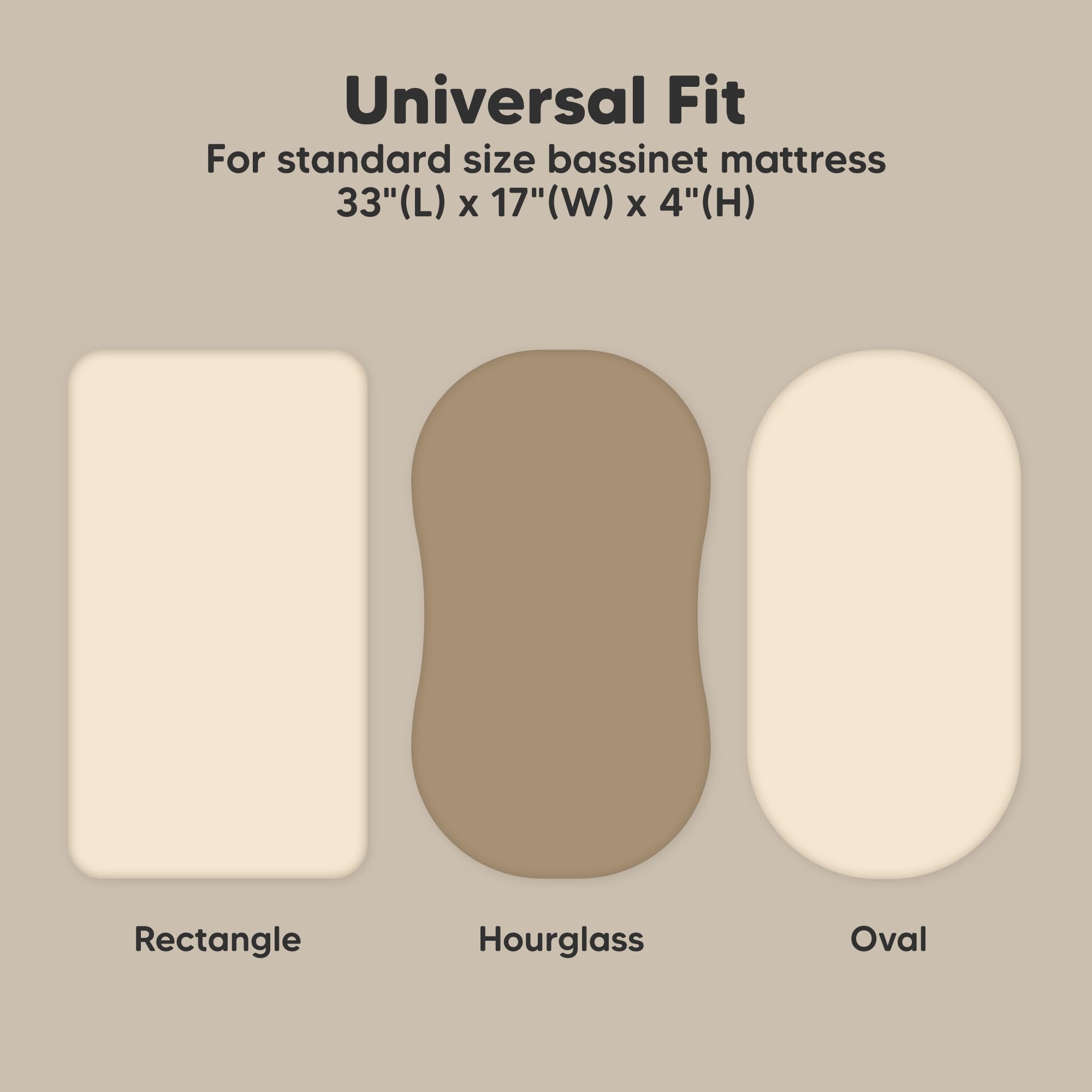 2-Pack Bassinet Fitted Sheets - KeaBabies Soothe Bassinet Mattress Sheets, sized at 33" x 17" with a depth of up to 4", provide a universal fit for all bassinet mattress pad types. They can be used as hourglass, oval, rectangle bassinet sheets.