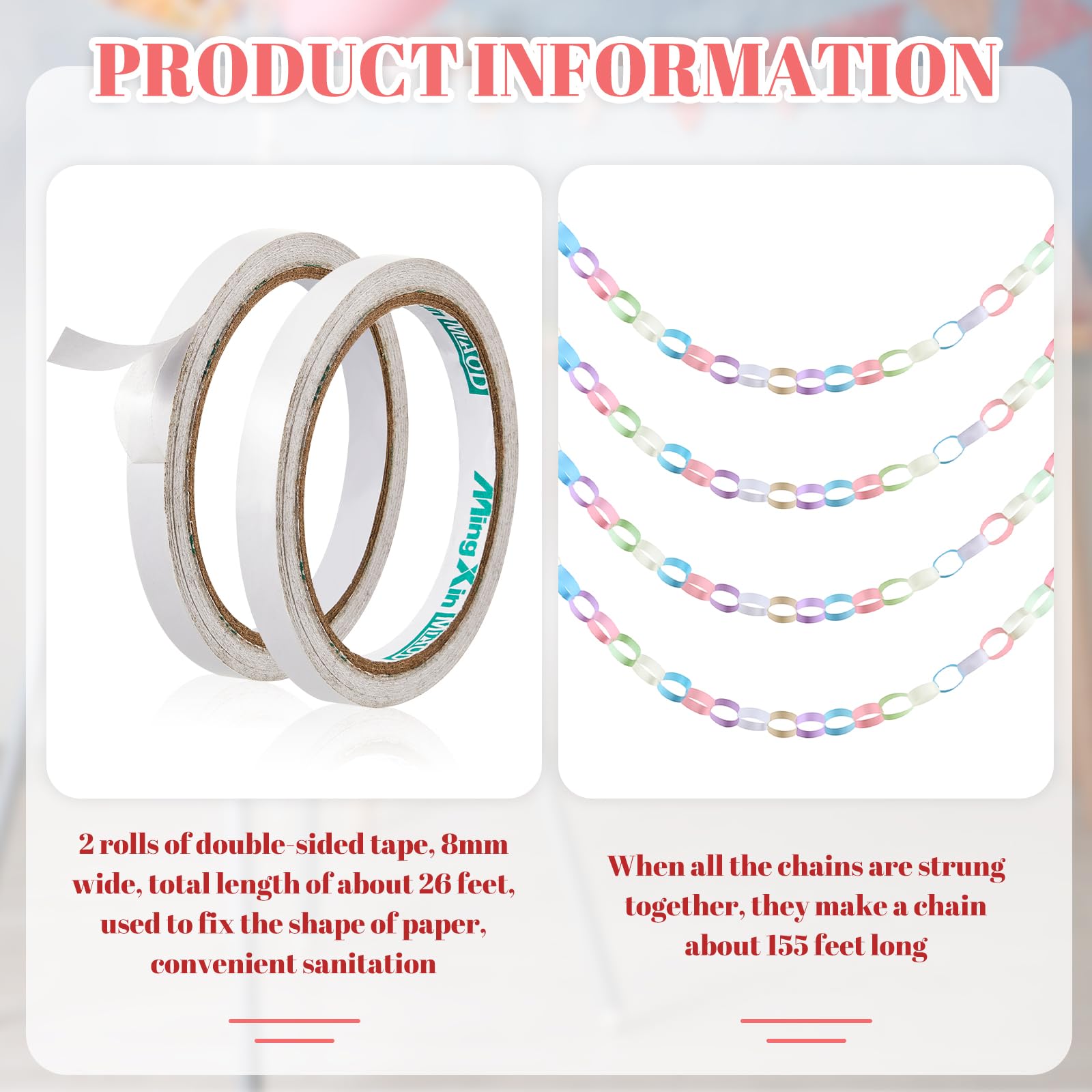 Abundant Quantity and Rich Colors: you will get 2 rolls of double sided tape and 600 pieces of paper chain strips in 6 colors, each color accounts for 100 pieces, which make all the paper chains of about 114 feet long, portable for you to make various handicrafts according to your decorative needs