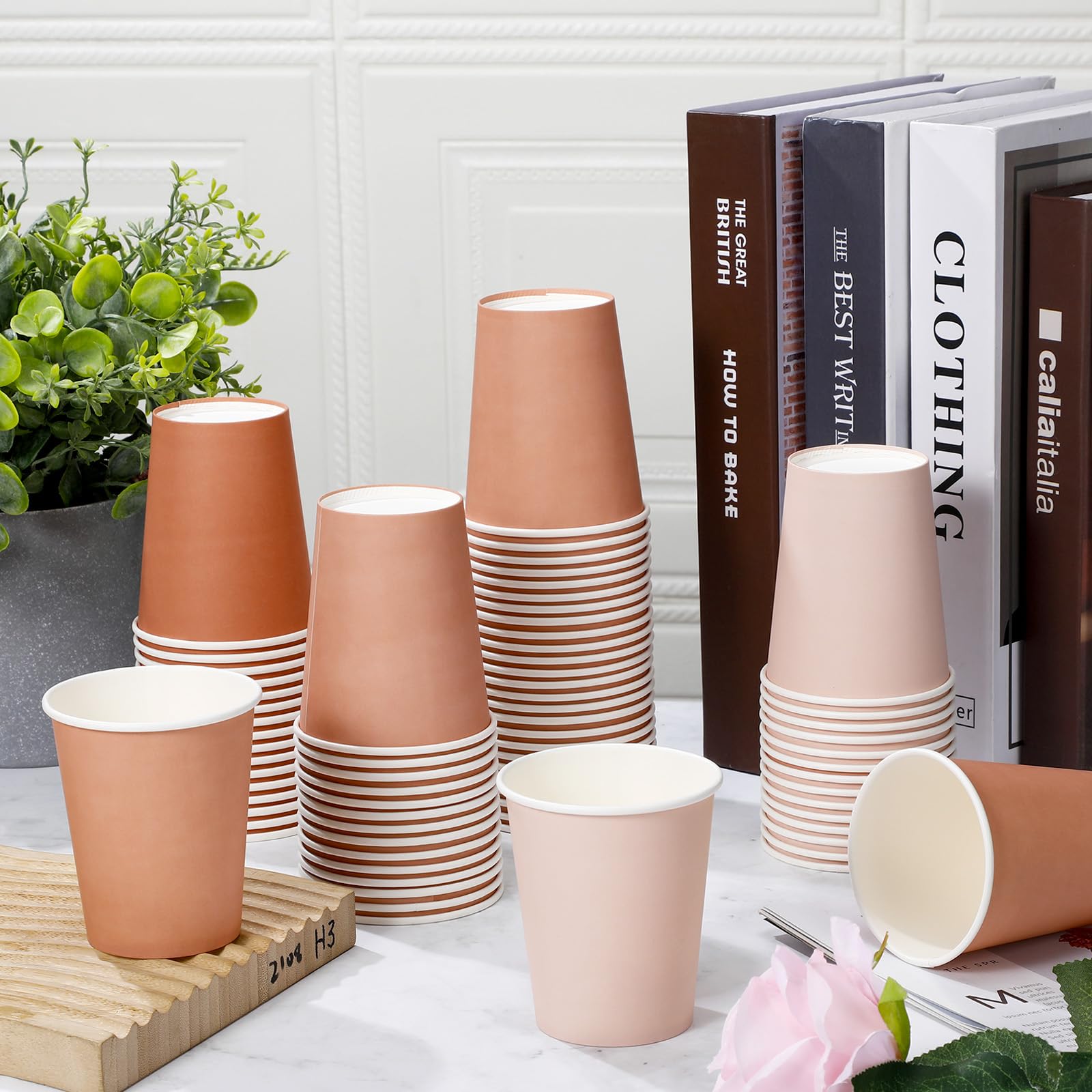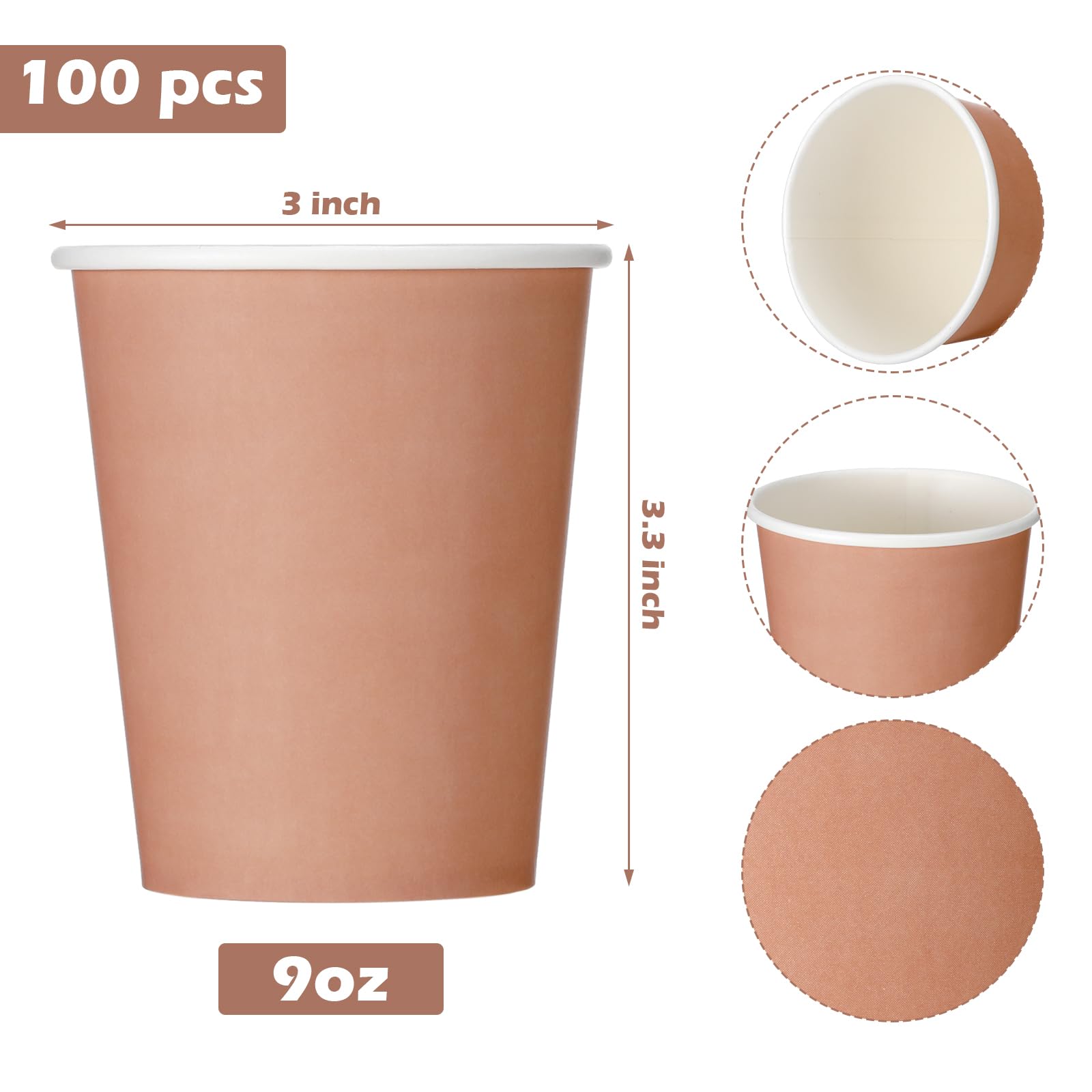 Generous Quantity: our offering includes a whopping supply of 100 pcs 9 oz paper cups; Quantity can meet the daily requirements; Tips: if you put hot drinks in the cup and it gets hot, you can use multiple paper cups to insulate your hands