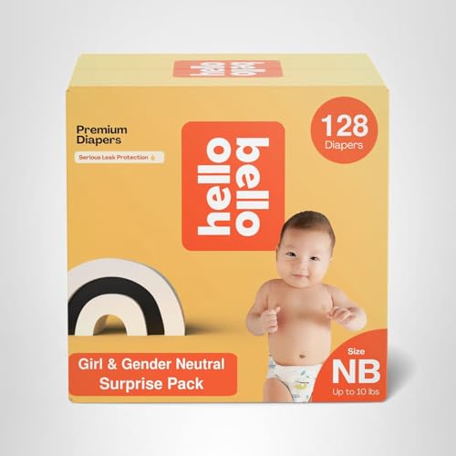 Hello Bello Premium Baby Diapers are designed by parents, so we know first-hand that preventing leaks and blowouts is a must. Been there, done that, don't want to deal with it. We also wanted to create a diaper with ingredients we could be proud of, that was soft on sensitive skin, and was made with just as much consideration for the planet we live on as the babies we love - all at an affordable price. So that's just what we did. Featuring premium, thick leg cuffs for serious leak protection and an advanced core that quickly wicks away moisture to help minimize conditions that lead to irritation. These diapers stay snug when soiled, reducing sag and keeping a secure and comfy fit. Includes (1) 128ct surprise pack of Diapers In Girl & Gender Neutral Designs for newborns and infants (Size NB)