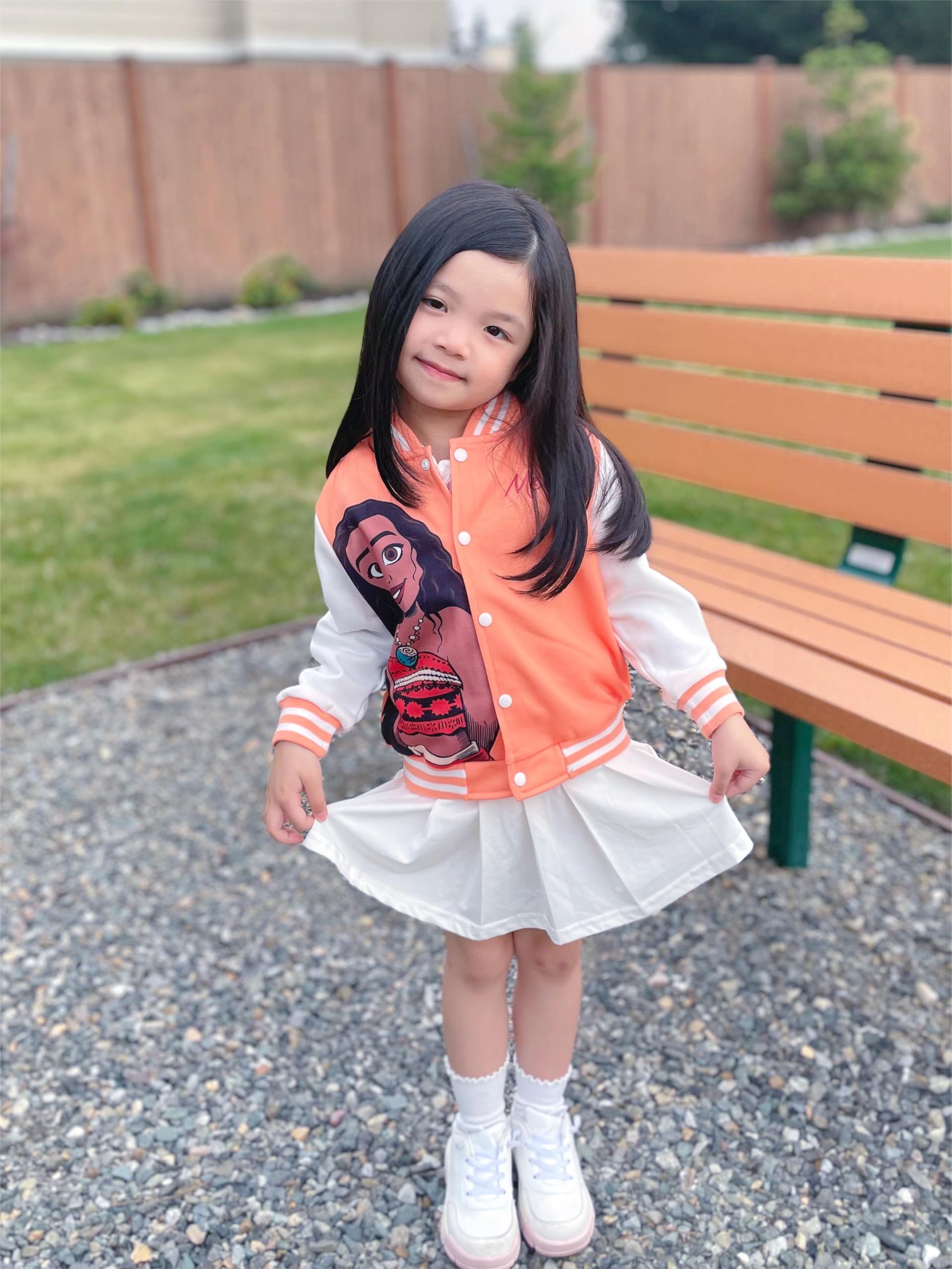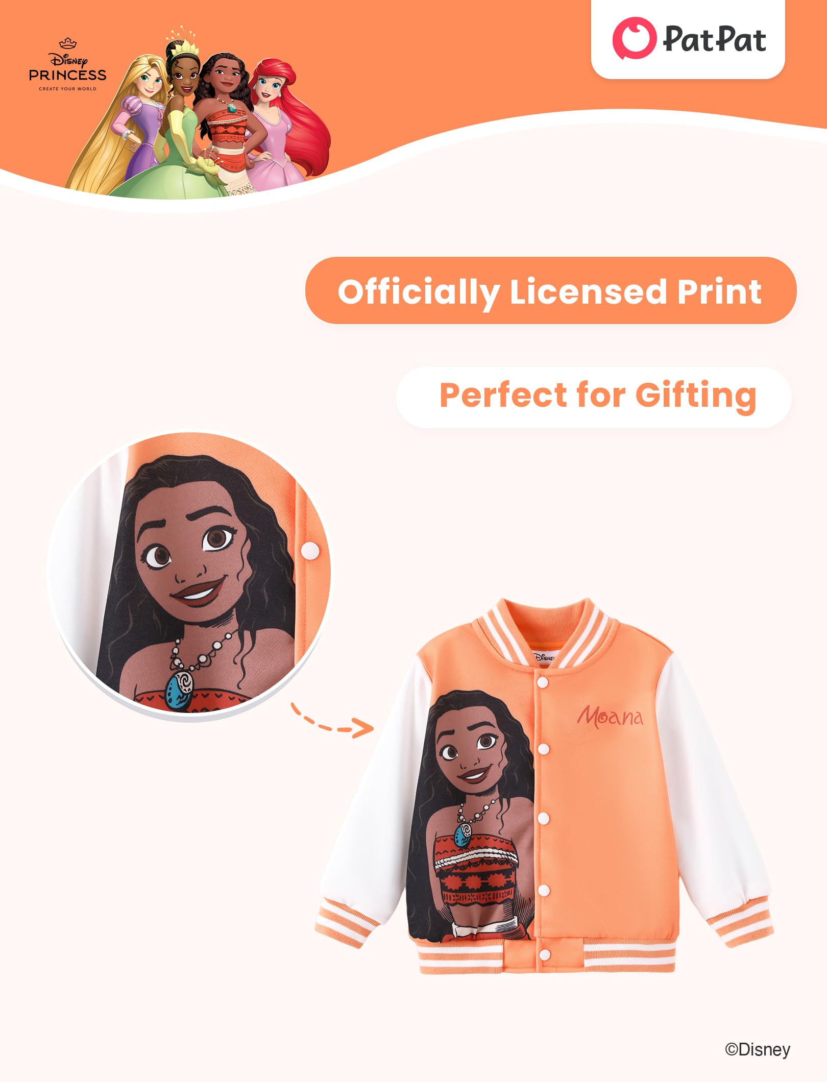 Charming & Adventurous Design: Let your little one embrace adventure with this Disney Moana varsity jacket! Featuring Moana in her iconic outfit, this vibrant orange jacket with sporty white sleeves and “Moana” lettering is both fun and stylish. Perfect for kids aged 2-6, it’s great for play, school, or outings, bringing Moana’s world to life