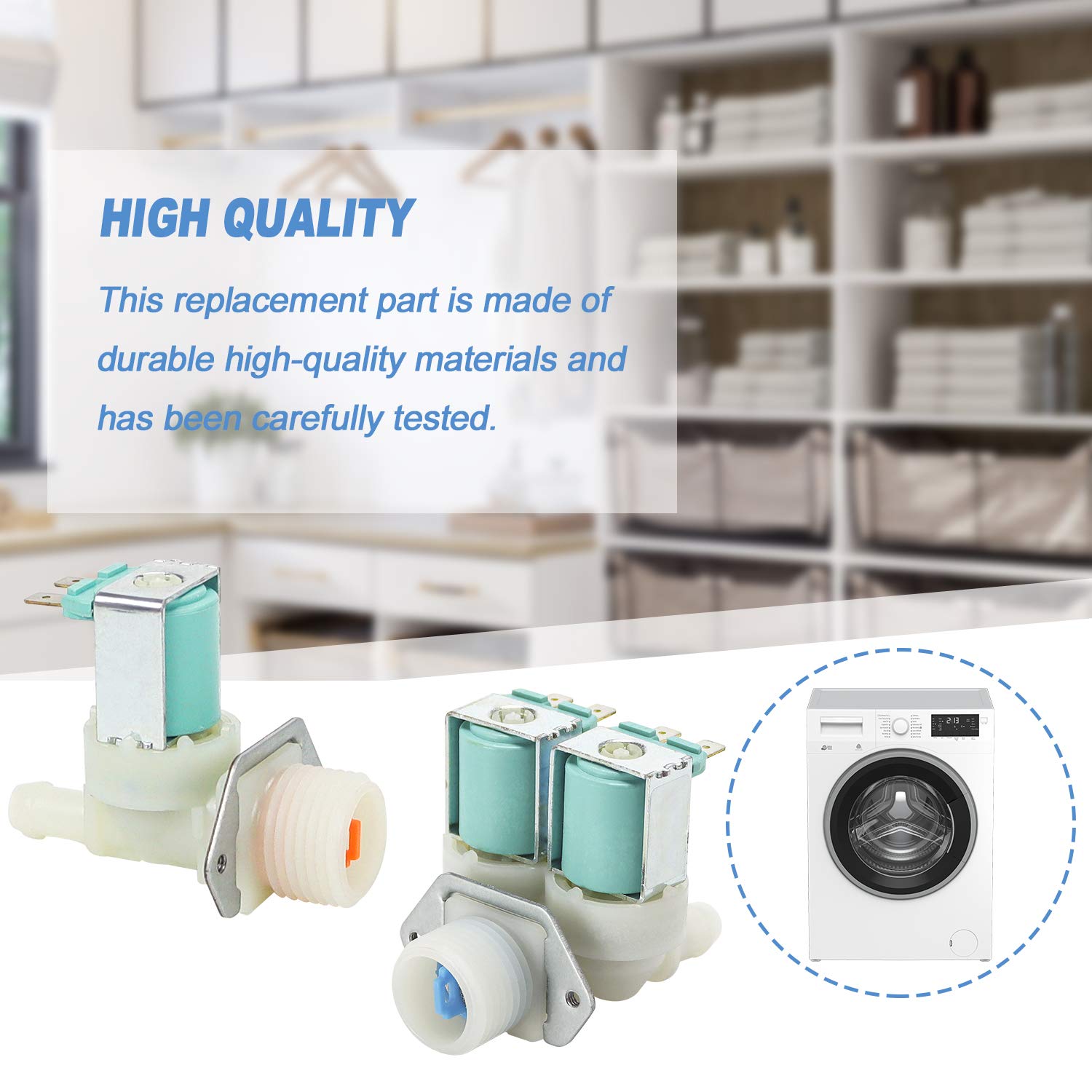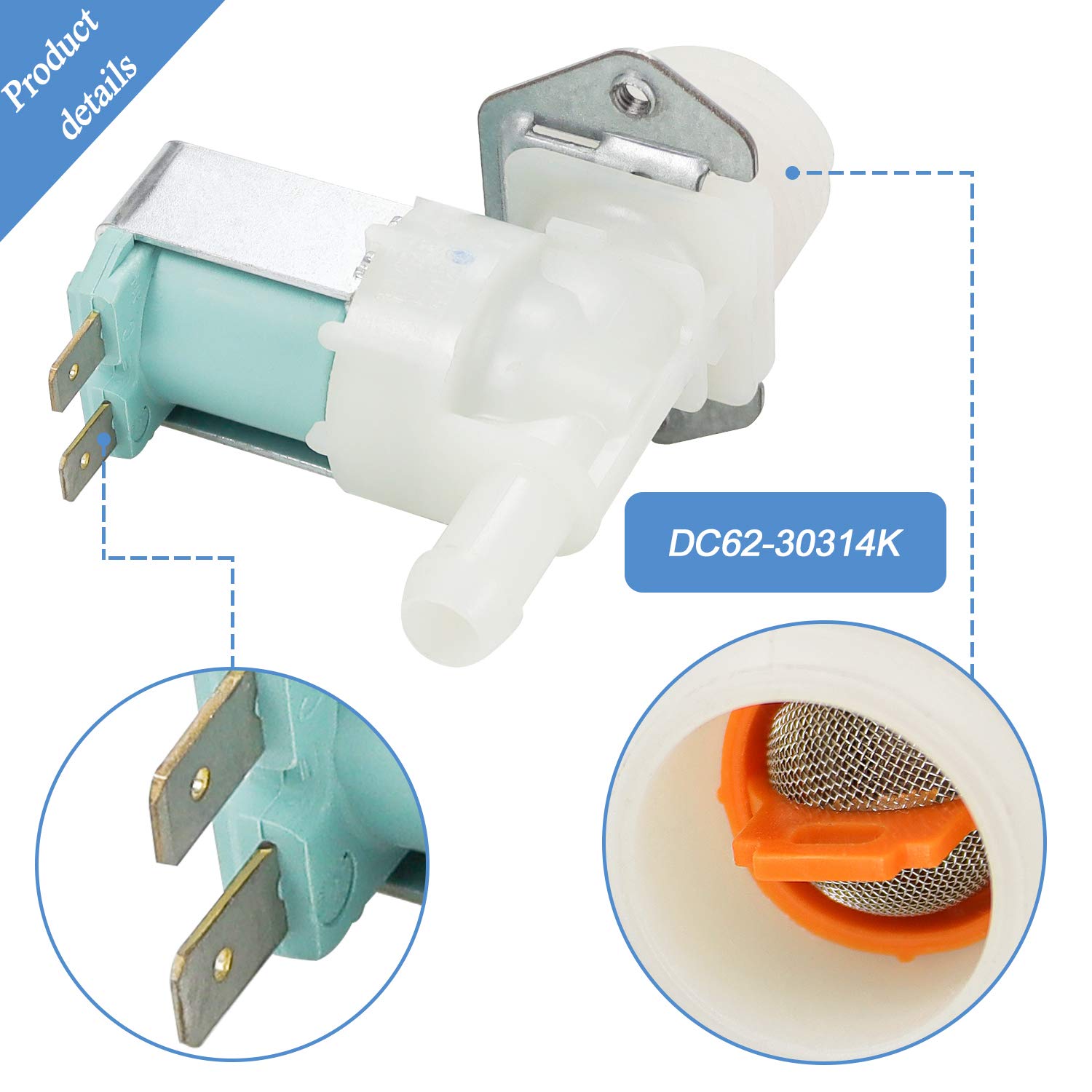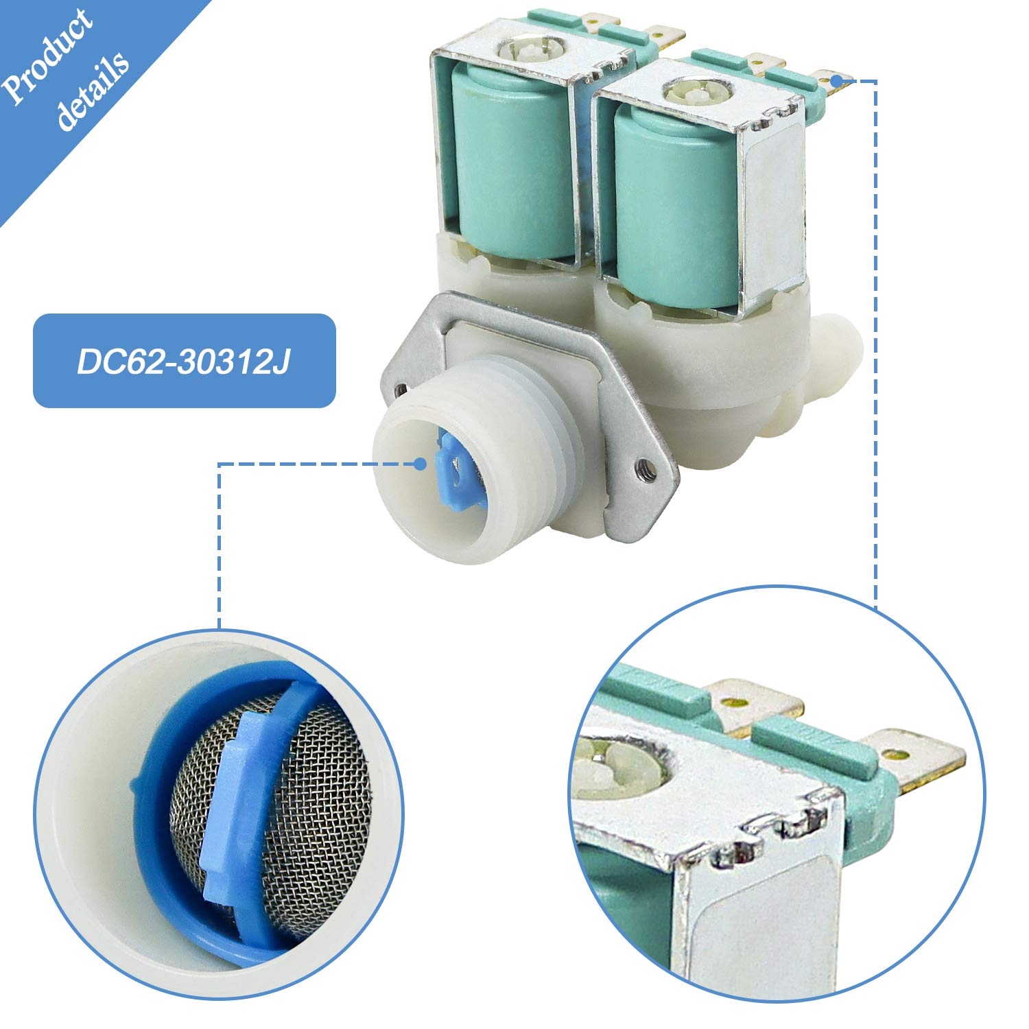 PERFECT FIT:our dc62-30312j & dc62-30314k washer valve set fit for Sa-msung K-enmore Washers.🟠DC62-30314K coil valve for hot water side,Directly replace 1810145 AP4204535 PS4209100 EAP4209100🔵DC62-30312J Cold Water Inlet Valve,Directly Replace DC62-30312H 2070376 AP4204532 PS4209090 EAP4209090.Fixes washer symptoms:①will not start②will not fill,leading to a 4E OE and SUDS error codes③not washing properly 4 leaking .