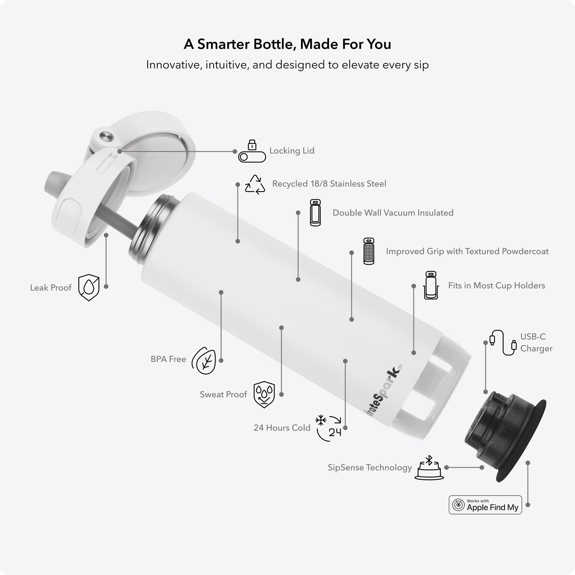 Stay hydrated like never before with the 21 oz HidrateSpark PRO 2, the world’s smartest water bottle made from premium recycled stainless steel. Double-wall vacuum insulation keeps your drink cold for up to 24 hours, while the SipSense Technology in the sensor tracks every sip and reminds you when it’s time to drink with a customizable 360-degree glow and optional sound alerts. Sync your water intake with the HidrateSpark App via Bluetooth to monitor your progress, set personalized goals, and even locate your bottle using Apple’s Find My Network. The large carry handle and narrow base make it cup-holder friendly and easy to carry wherever you go. Works with the chug or straw lid for ultimate versatility.