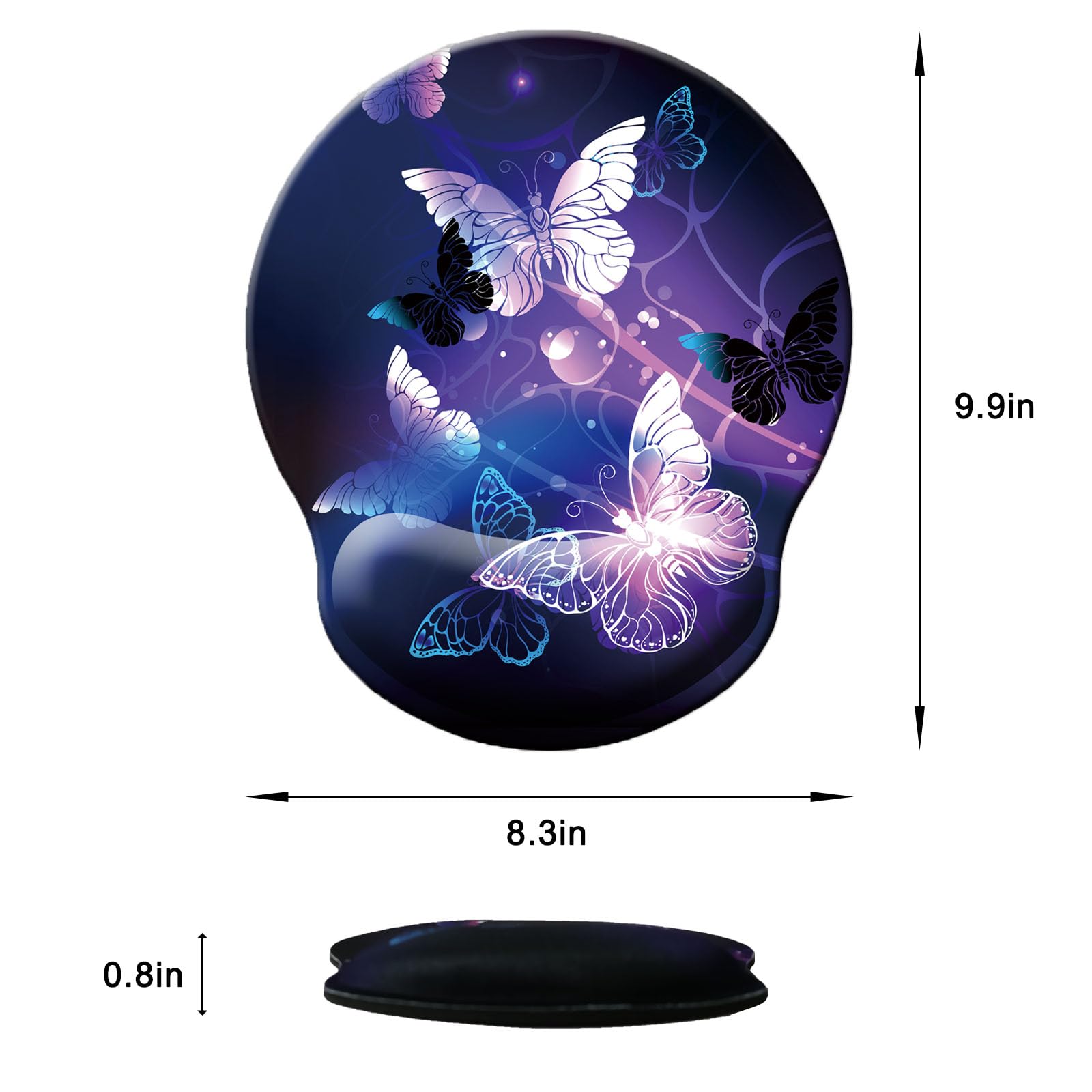 ERGONOMIC - Approximately 9.9 in x 9.1 in, 0.8 in thick. The reinforced edges are not easy to deform and damage, no curl up on edges. Ergonomic soft wrist rest mouse pad provide good touch and comfortable support for your wrists. Keep arms, wrists, and hands from getting sore when using computer for long time.