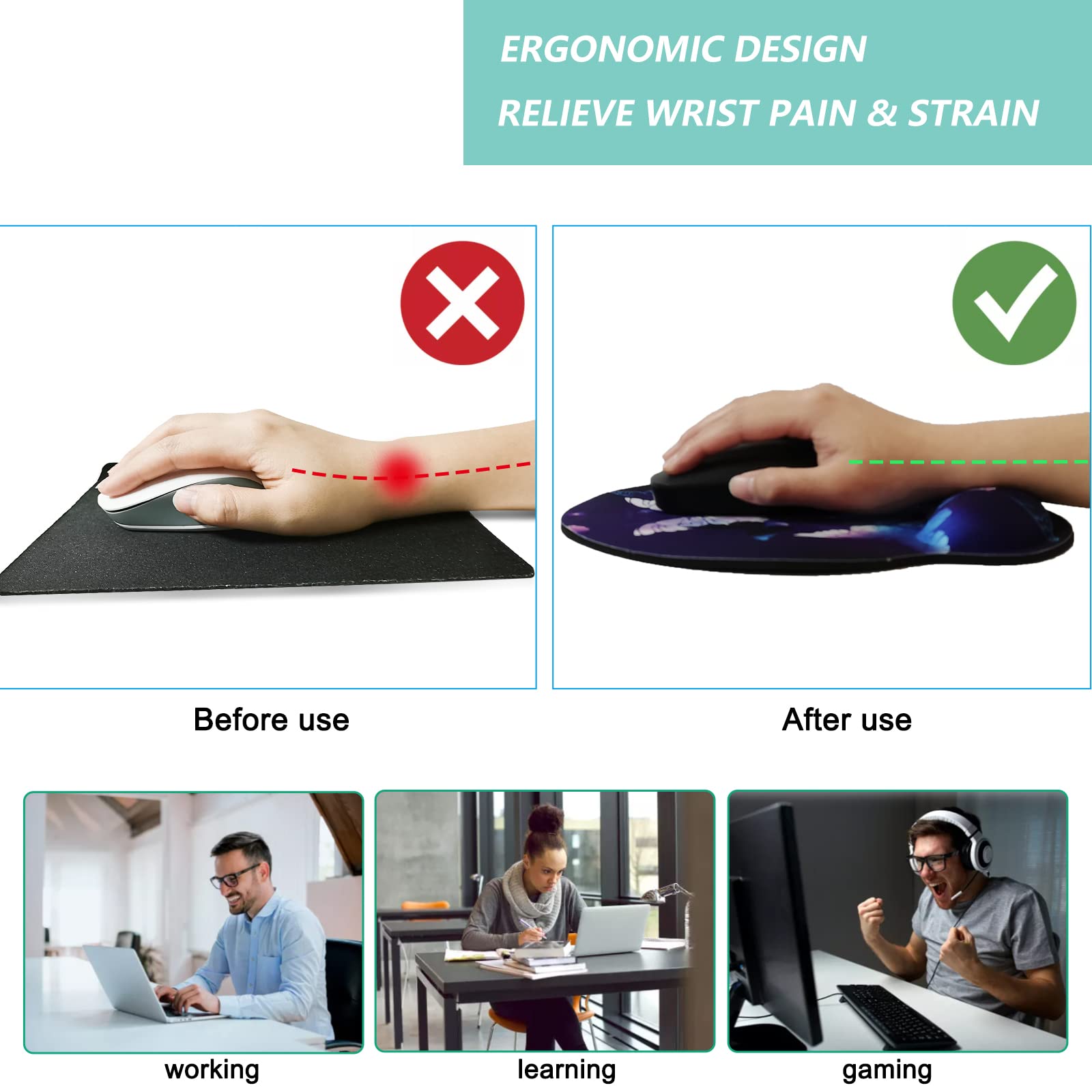 PROTECTION - Protect your wrist, shoulder by using our mousepad with wrist support. It can reduce fatigue, relieve pressure on your hand, wrist, elbow and shoulder, avoid carpel tunnel syndrome, and avoid excessive friction between wrist and desk.