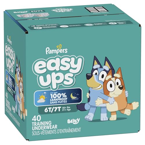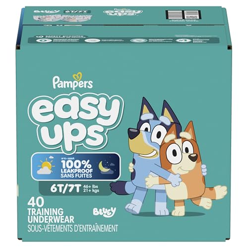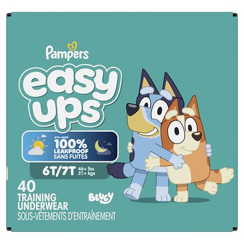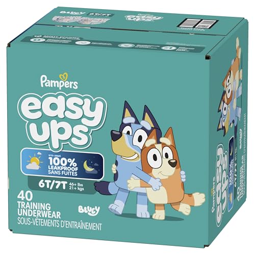 Ready to potty train with Bluey? Pampers Easy Ups Training Pants featuring Bluey makes it easy. They pair the feeling of real underwear with the protection of Pampers to make training easier for everyone. Give your child the confidence to take on potty training with a little more independence and a lot more fun. Easy Ups Training Pants feature stretchy sides and an underwear-like waistband for easy up and down, plus an ultra-absorbent core with LockAway Channel to help keep them dry day and night. With up to 2X better protection day and night*, Easy Ups deliver up to 100% leakproof protection. These hypoallergenic, dermatologist-approved training pants are made with 0% elemental chlorine, parabens, or latex** and backed by the Pampers Safety Promise. Fun Bluey designs motivate your toddler to potty train. Pampers Easy Ups are also available with Peppa Pig! Pair with Pampers Sensitive Wipes to help keep your toddler's skin healthy. Find your toddler's best fit in the following sizes: training pants 2T–3T (diaper size 4,15–34 lbs.), training pants 3T–4T (diaper size 5, 20–40 lbs.), training pants 4T–5T (diaper size 6, 23-50 lbs.), training pants 5T–6T (diaper size 7, 35–60 lbs.), training pants 6T–7T (diaper size 8, 46+ lbs.) *Urine leaks vs. leading competitor size 2T-3T ** No natural rubber Pricing based on MSRP; excludes Easy Ups Jumbo. Pricing at the sole discretion of the retailer