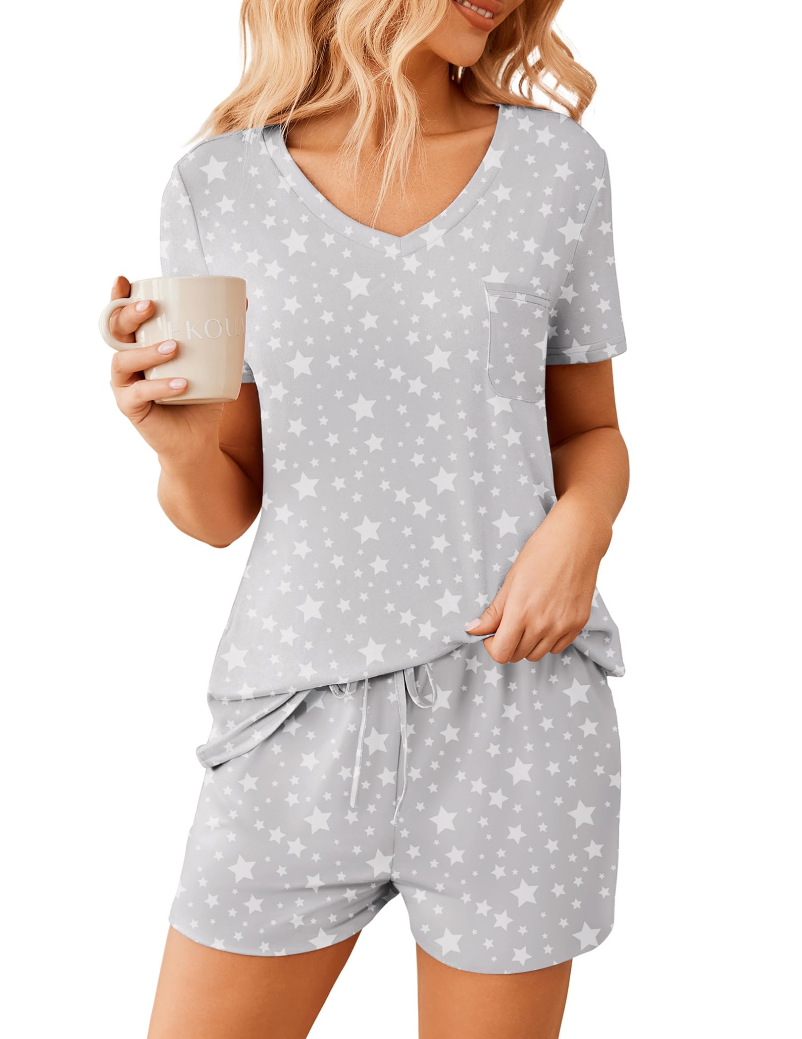 Material: 95% Polyester + 5% Spandex. Ekouaer womens short pajama sets are soft, lightweight, easy care, good elasticity, not easy to wrinkle, skin-friendly, breathable and comfortable