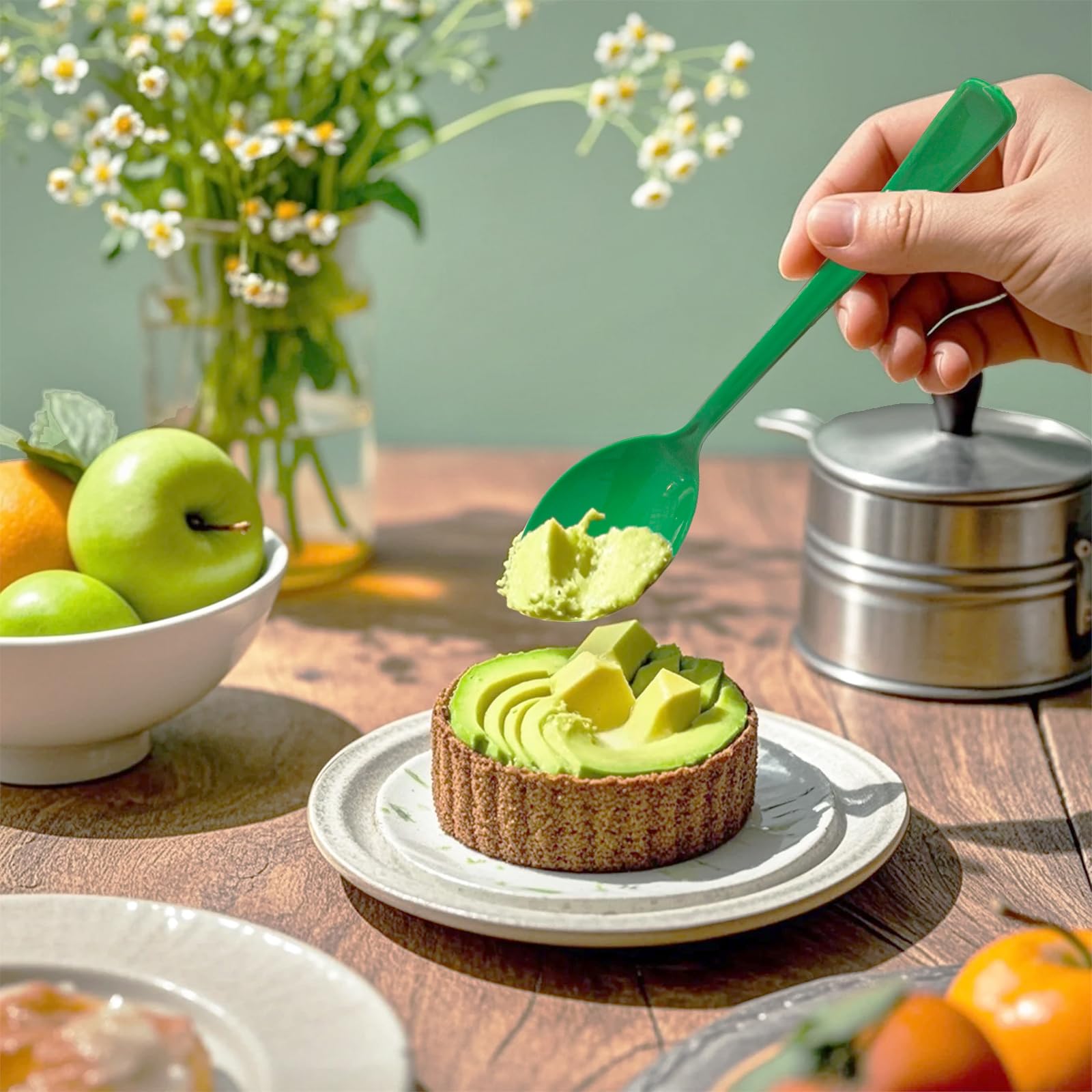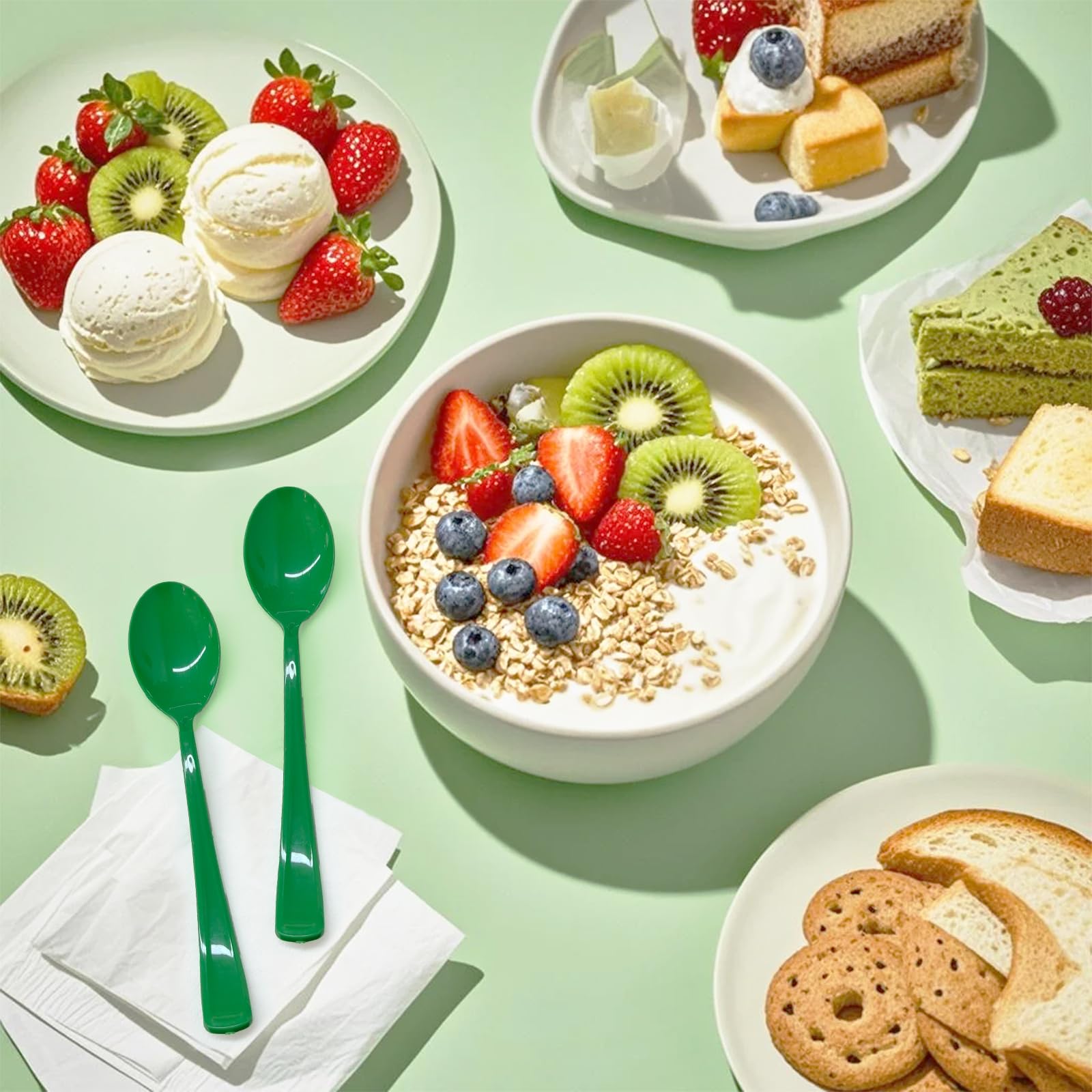 【Reliable Quality】: The green plastic spoons are made of food-grade plastic material, which is non-toxic and harmless and can be in direct contact with food. Thickly designed at the handle, it is less prone to breakage and deformity, and has excellent durability and reliability. High-temperature resistant and suitable for all types of food, Whether it's dessert, ice cream or snacks and appetizers,the green spoons meets customers' needs.
