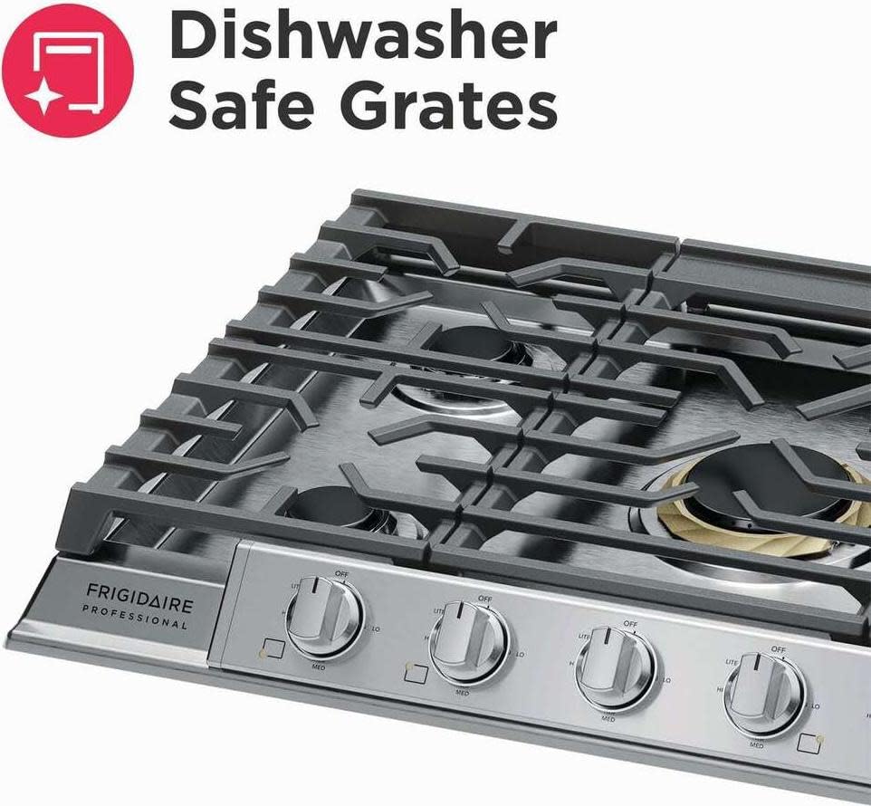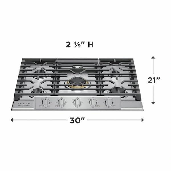 Features Even Temp Burner When using the Even Temp burner, heat is more evenly distributed across the element's surface, which reduces hot spots and cold areas in your pan. Five Burner Cooktop From a 5,000 BTU simmer burner for delicate foods to a powerful 18,000 BTU Even Temp burner, this five-burner cooktop is designed to handle all of your cooking needs. Backlit LED Knobs Backlit LED knobs light up so you know when your burner is on. Dishwasher Safe Grates Cleaning your cooktop is easier with our dishwasher safe grates and burner caps. Cast Iron Grates Moving heavy pots and pans across the cooktop is easier with continuous edge-to-edge cast iron grates. Frigidaire Fit Promise We promise that your new 30" Frigidaire Professional gas cooktop will fit your existing countertop cutout of the same width and configuration, or we will reimburse you for cabinet modification costs up to $1001 Front Control Design Adjust the cooking temperature without having to reach over hot items on the cooktop. Approved over Frigidaire Electric Wall Ovens Cooktops are approved for installation above any of our Frigidaire Wall Ovens. ADA Compliant Product complies with the Americans with Disabilities Act.2 Key specifications 2 7/16" Height 30" Width 21" Depth 27 1/4" Minimum Cutout Width 19" Minimum Cutout Depth 29 5/16" Maximum Cutout Width 20" Maximum Cutout Depth