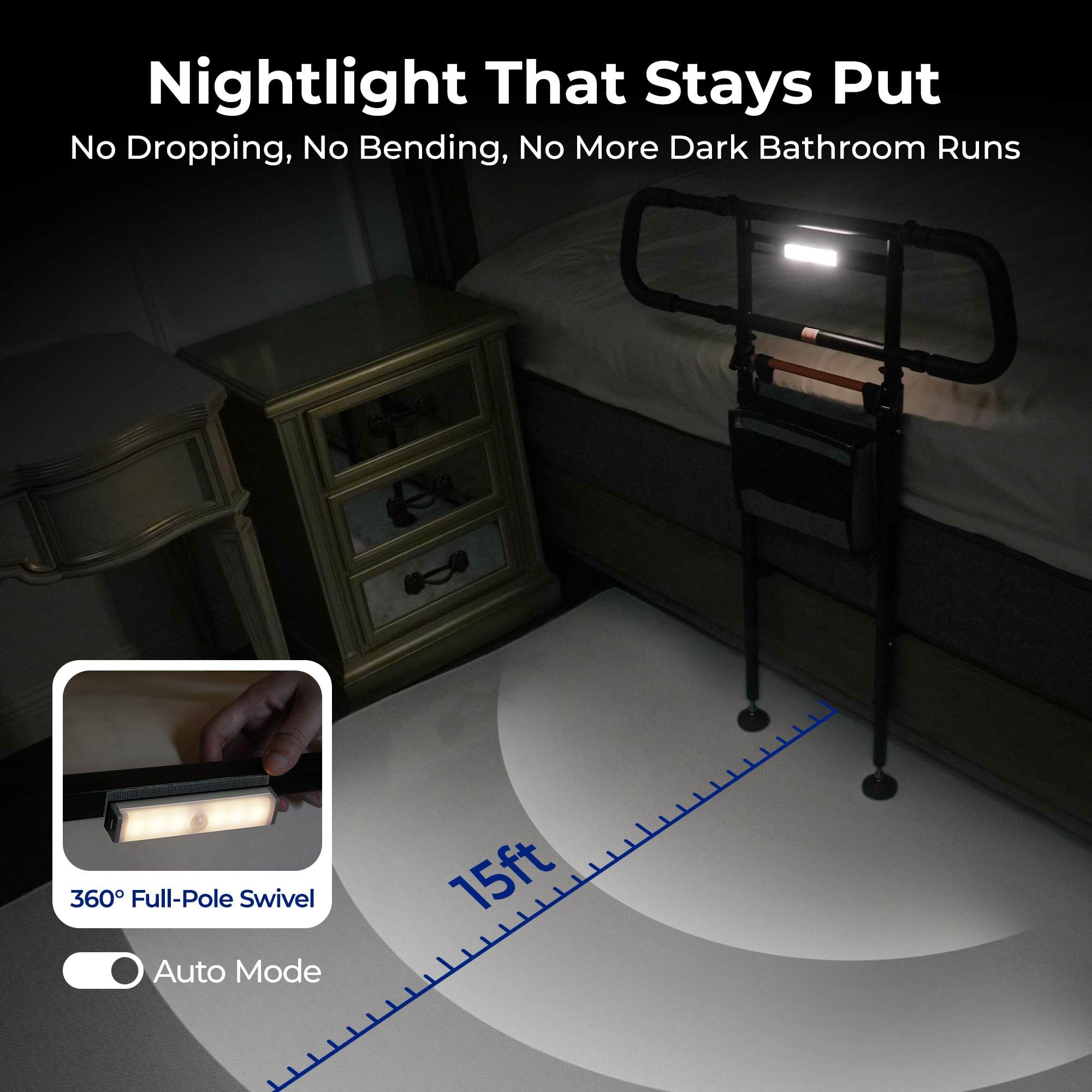 Stop Nighttime Falls Before They Start- Equipped with a 360° rotatable LED night light, providing soft illumination to guide nighttime movements without glare. LED motion light, and can also be instantly detached as a portable flashlight, ensuring safe navigation for the elderly at night. Comes with a storage bag, bedside essentials, always at your fingertips