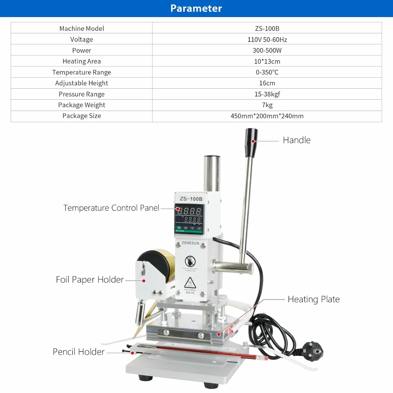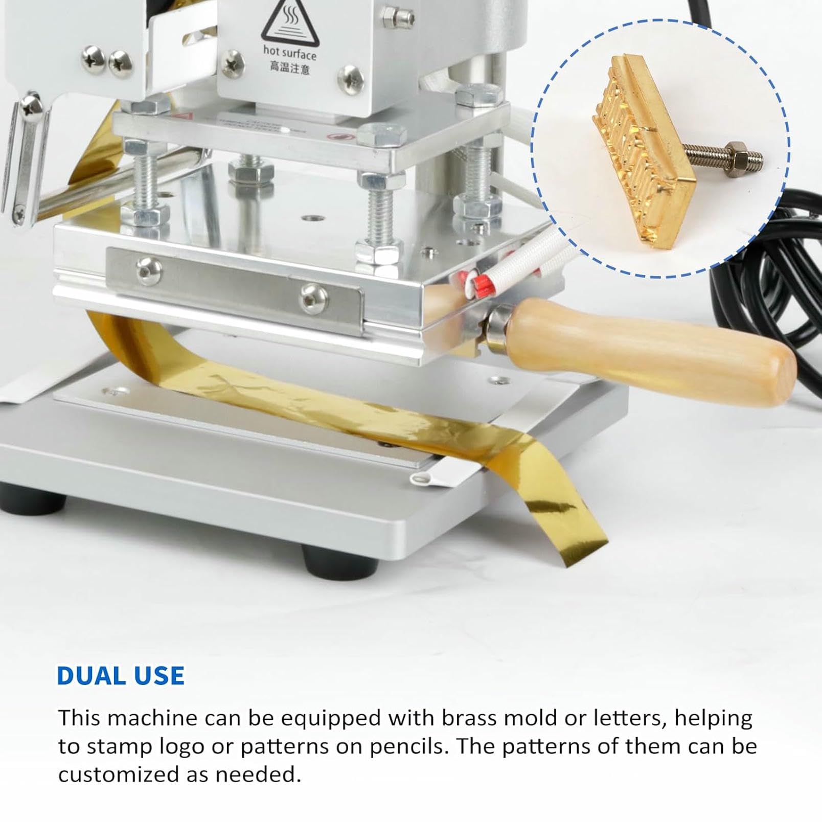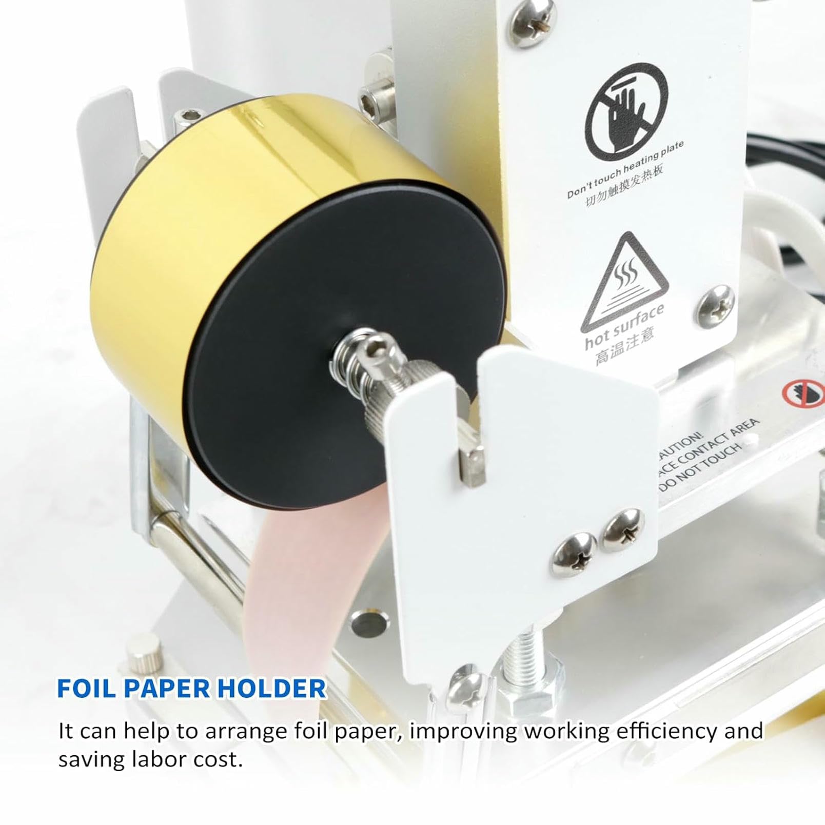 Parameter Hot Stamping Machine Packing List 1 machine 1 manual 2 foil paper(1gold and 1 silver) 1 bag accessories(thermocouple,fuse wire,test paper,hexagonal key,wrench) 1 pencil holder & 1 Pencil holder Product Details Digital temperature control Digital display temperature.The temperature is accurate to single digits with almost no errors.Heat quickly,press the button to set the temperature hot foil paper roll holder It can be put on the bracket directly by hot stamping paper, and the hot stamping is faster, more convenient and perfect Dual use Can be used with customize copper molds, and also stamping letters (the default T-slot is for 3mm and 6mm letter) Adjust machine height 2 screws can be adjusted to adjust the height of the heating plate to the workbench