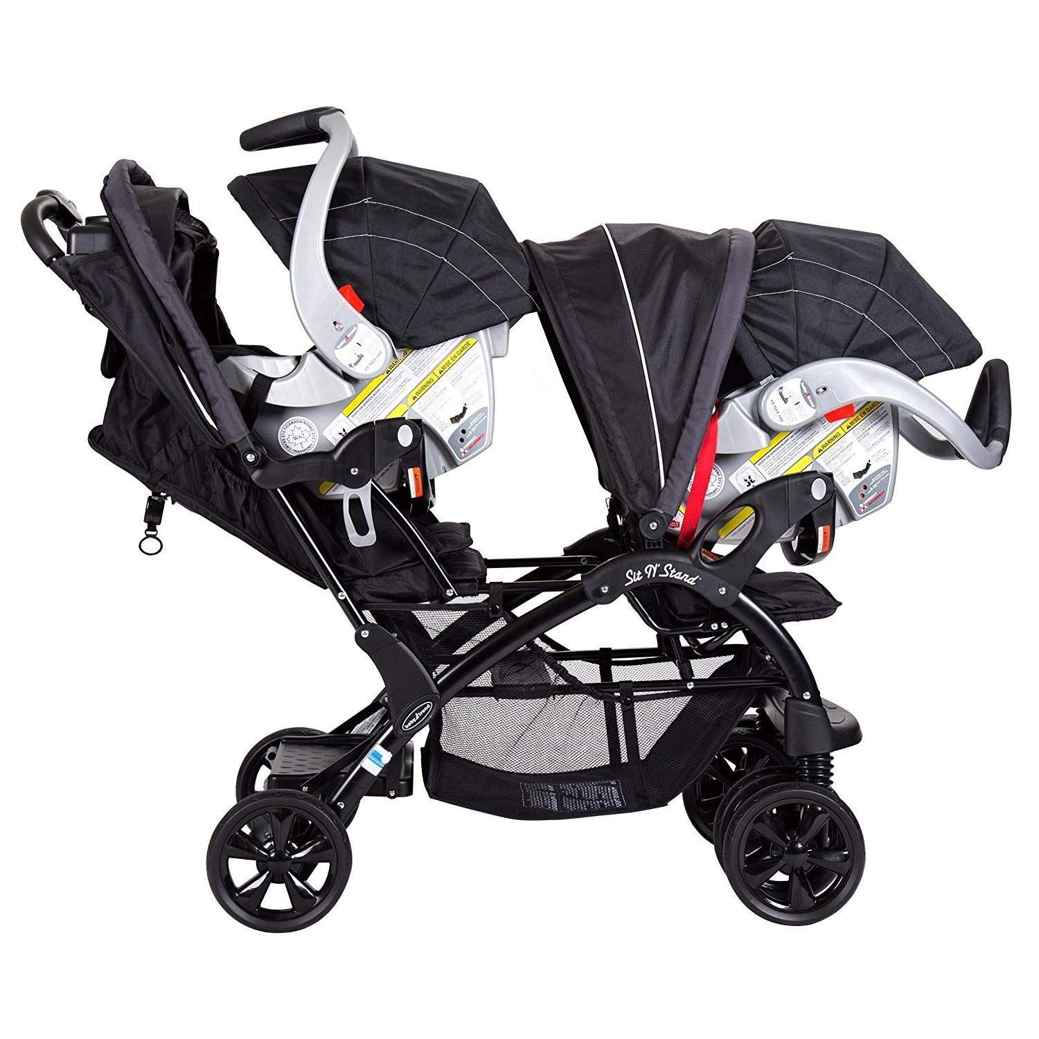 Experience the ultimate in versatility with the Sit Nâ Stand Double Stroller from Baby Trend. It comfortably seats two children, and the rear seat can be removed for use of the included jump seat or standing platform. The two ratcheting canopies provide excellent sun protection for both of your passengers. The parent tray features 2 cup holders and a covered storage compartment for small incidentals and the roomy storage basket holds larger items. Both full-sized seats are equipped with reclining seatbacks, child trays with cup holders, and 5-point safety harnesses. The padded jump seat also includes a 3-point safety harness. The 8" EVA tires provide a smooth, comfortable ride and the lockable rear wheels provide stability on command. After your excursion, the Sit Nâ Stand folds compact for convenient transport or storage.