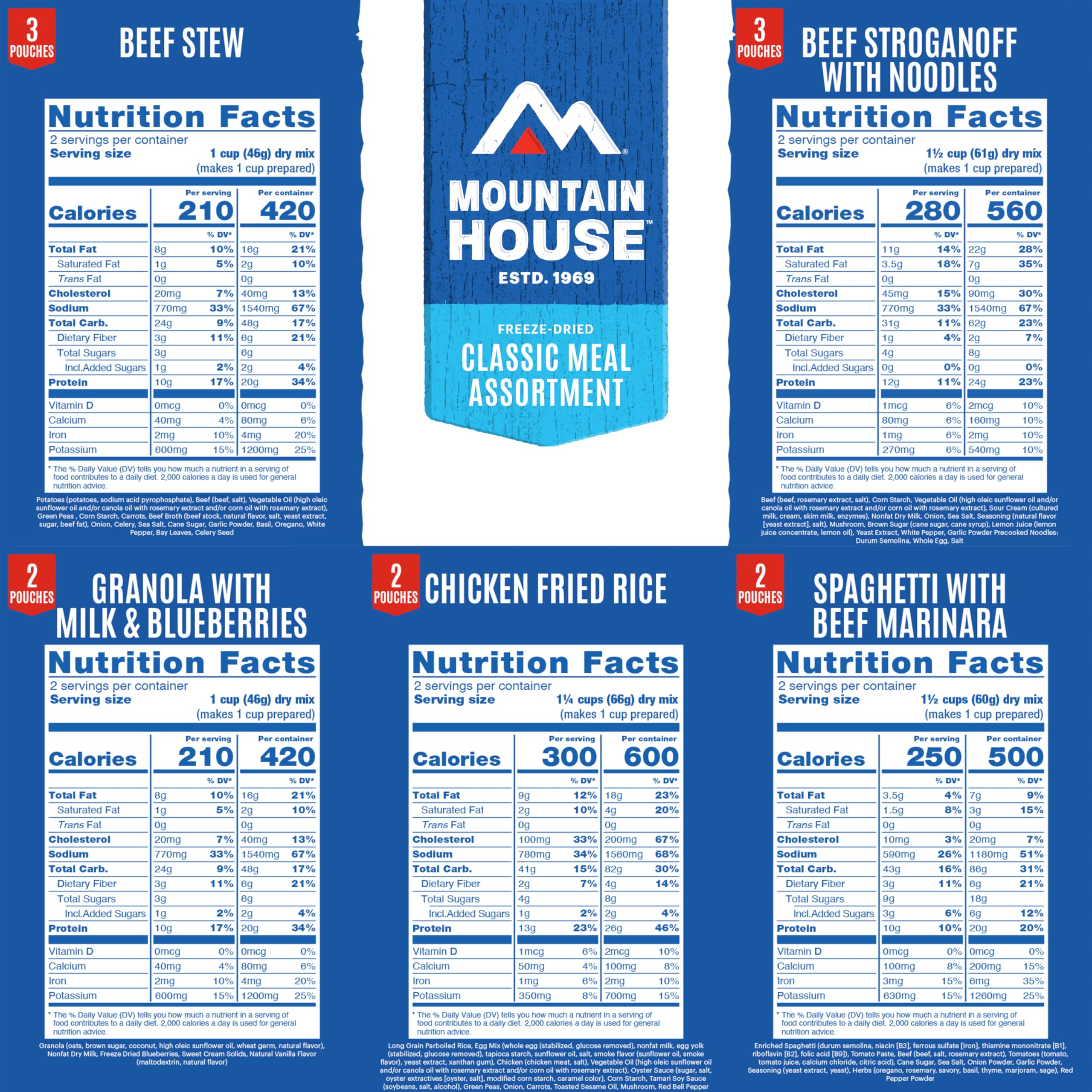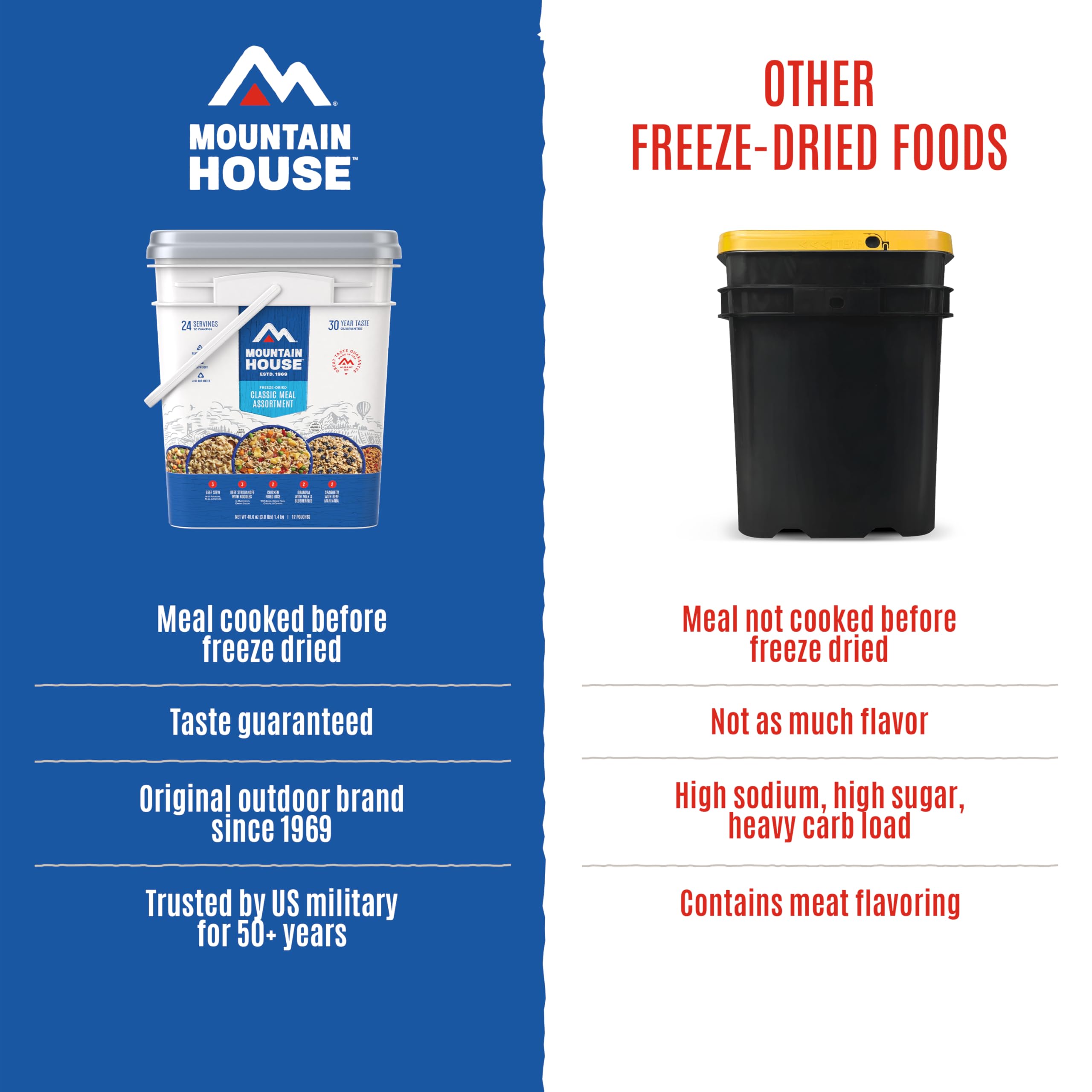 HIGH-QUALITY INGREDIENTS – Mountain House meals are made with high-quality ingredients, never any fillers. Bucket contains 12 total pouches (24 total servings), freeze-dried to lock in nutrients and freshness: (3) Beef Stew, (3) Beef Stroganoff with Noodles, (2) Granola with Milk & Blueberries, (2) Spaghetti with Beef Marinara, and (2) Chicken Fried Rice.