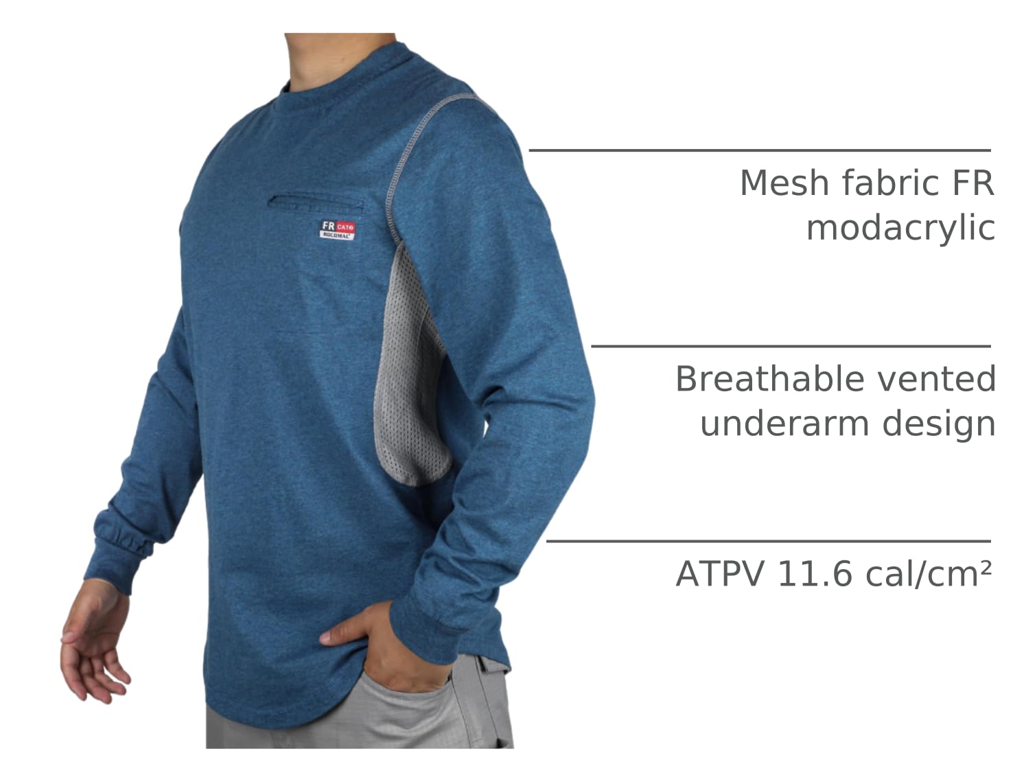 Breathable Vented:Main fabric 6oz FR 100% cotton jersey smooth fit,mesh fabric 6oz natural inherent FR Modacrylic,breathable vented underarm design for summer hot days.Hidden chest slit pocket.Eyecatch FR tag on pocket.