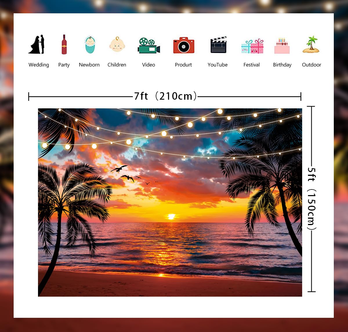 【Size】: Our hawaii sunset beach themed backdrop is measuring approximately 7 x 5 ft (2.1 x 1.5 m); This backdrop is perfect for creating hawaiian party and summer party decorations kit; Add a special sense of ceremony to the upcoming holiday