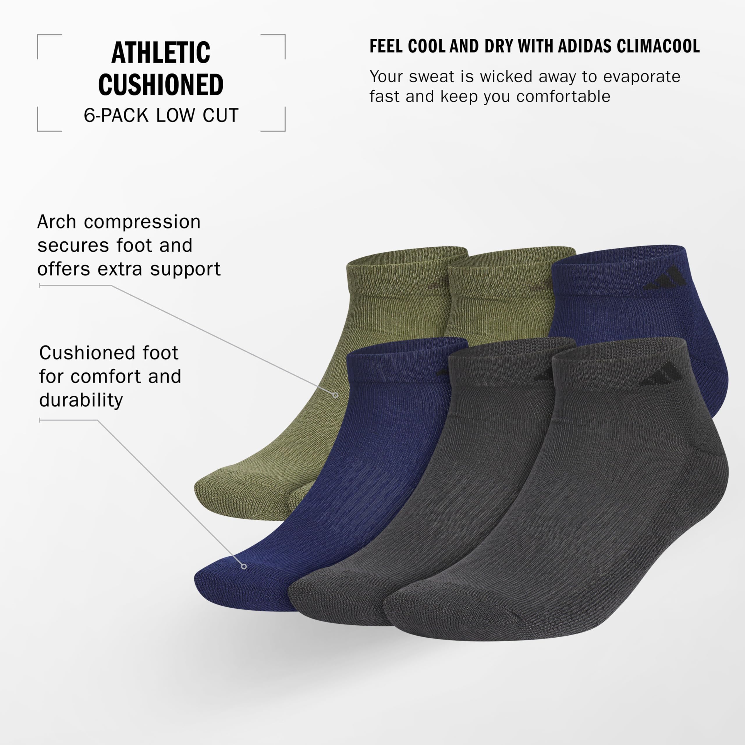 Description Quality, comfort, and durability is what you are looking for in your everyday sock and the adidas 6-pack delivers on all of your needs. now, with the addition of arch compression, this sock delivers a secure fit and gives you the best sock to handle your day to day.