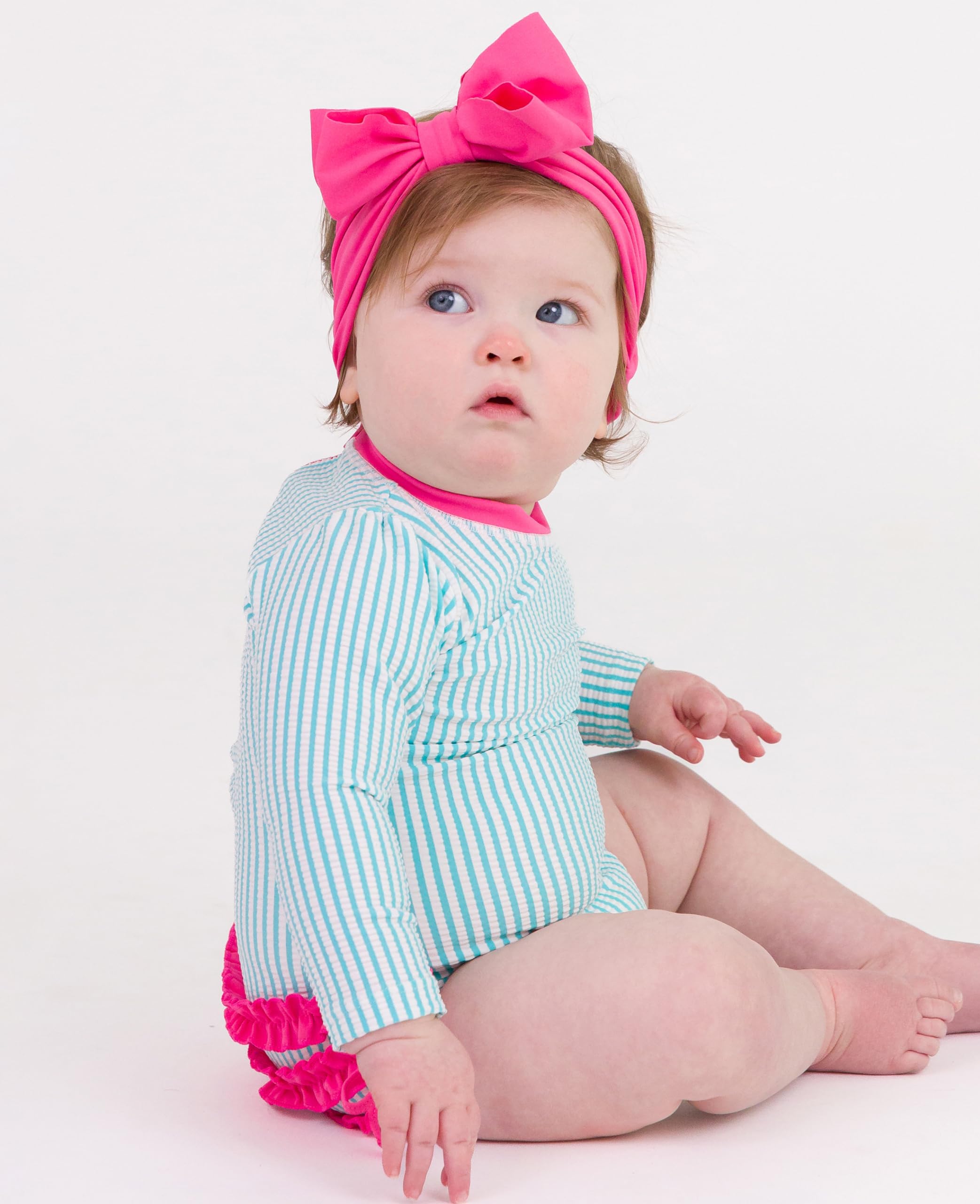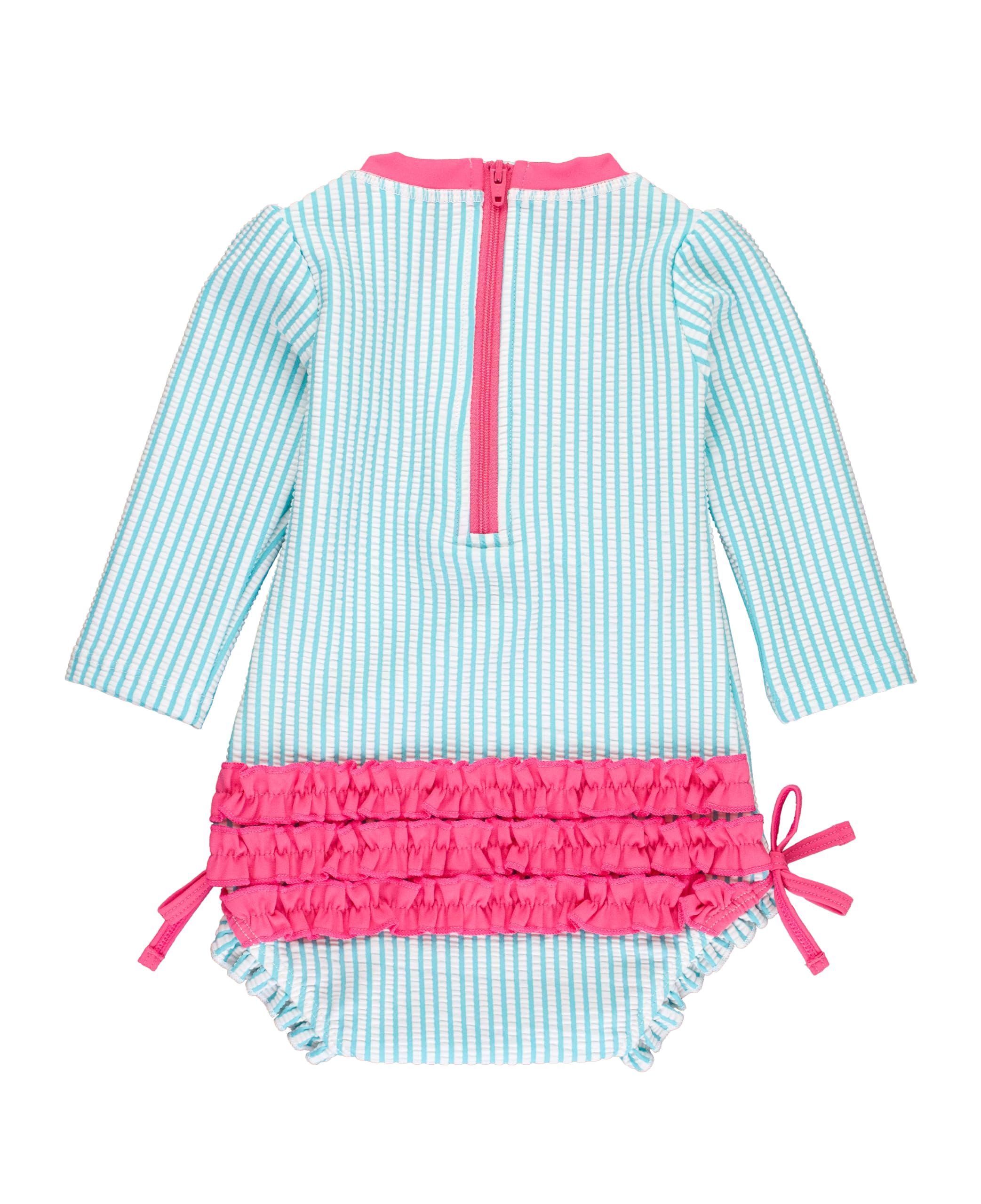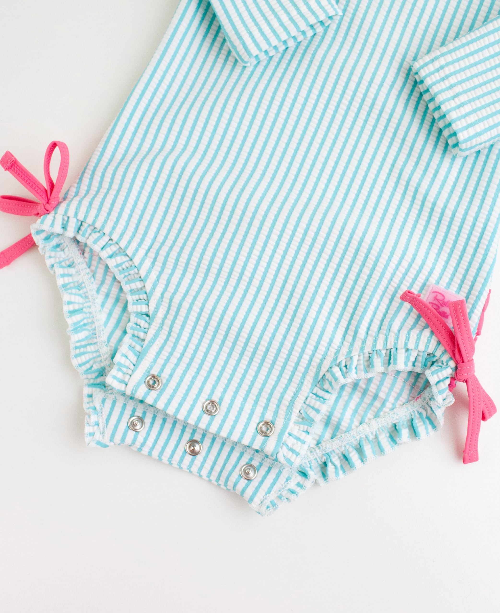 Description Made with a high quality UPF 50+ sun protected fabric, this unlined one piece seersucker bathing suit will keep safe in the sun all day long. Plus, the nickel-free snaps and back zipper make changing a breeze!