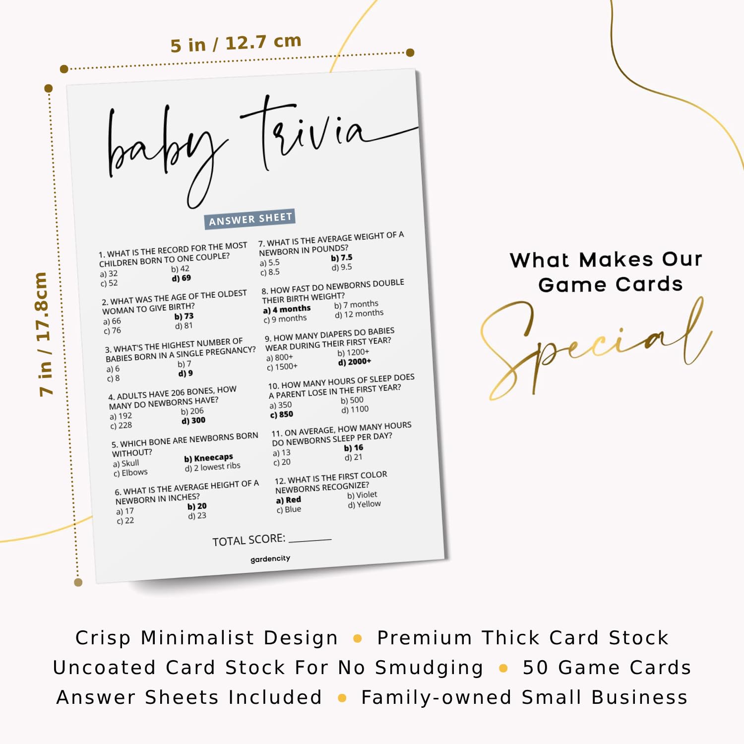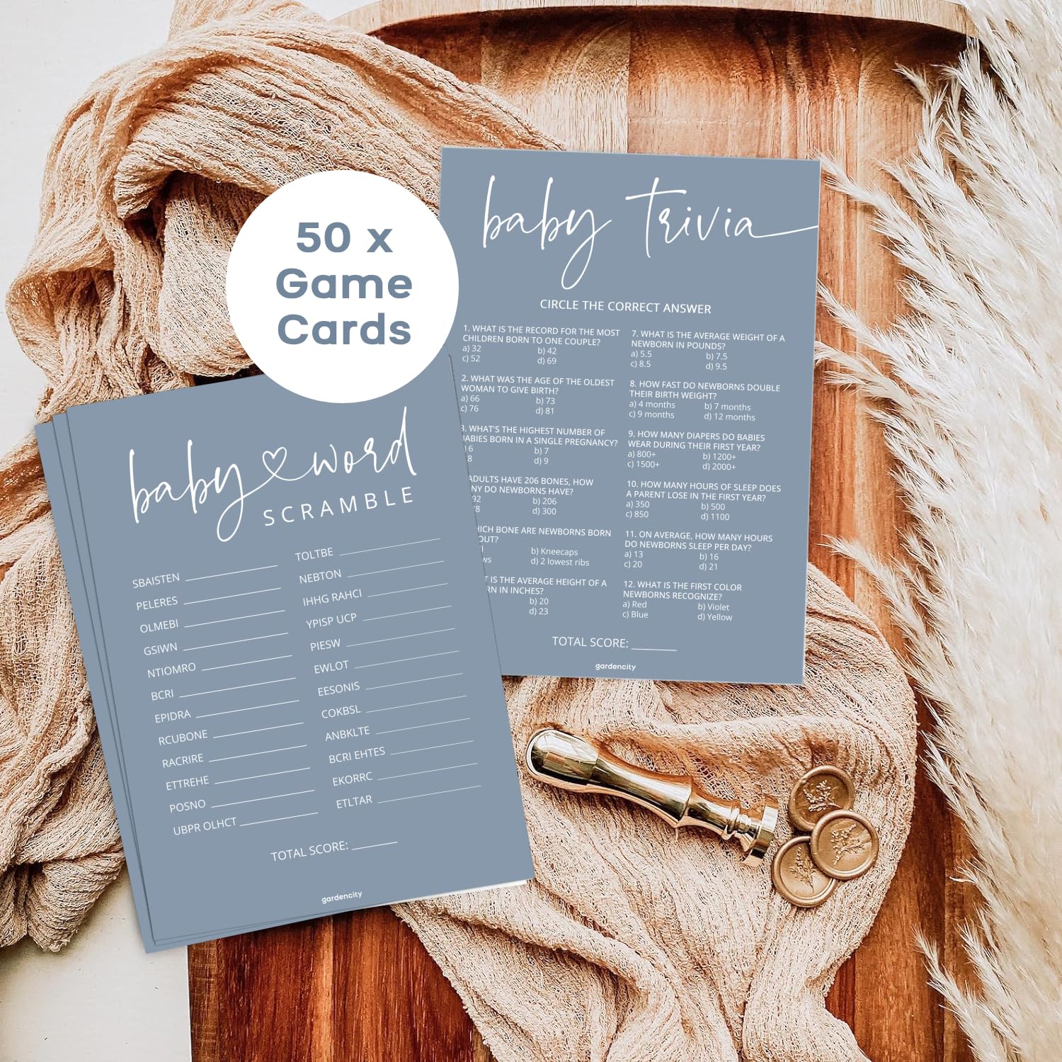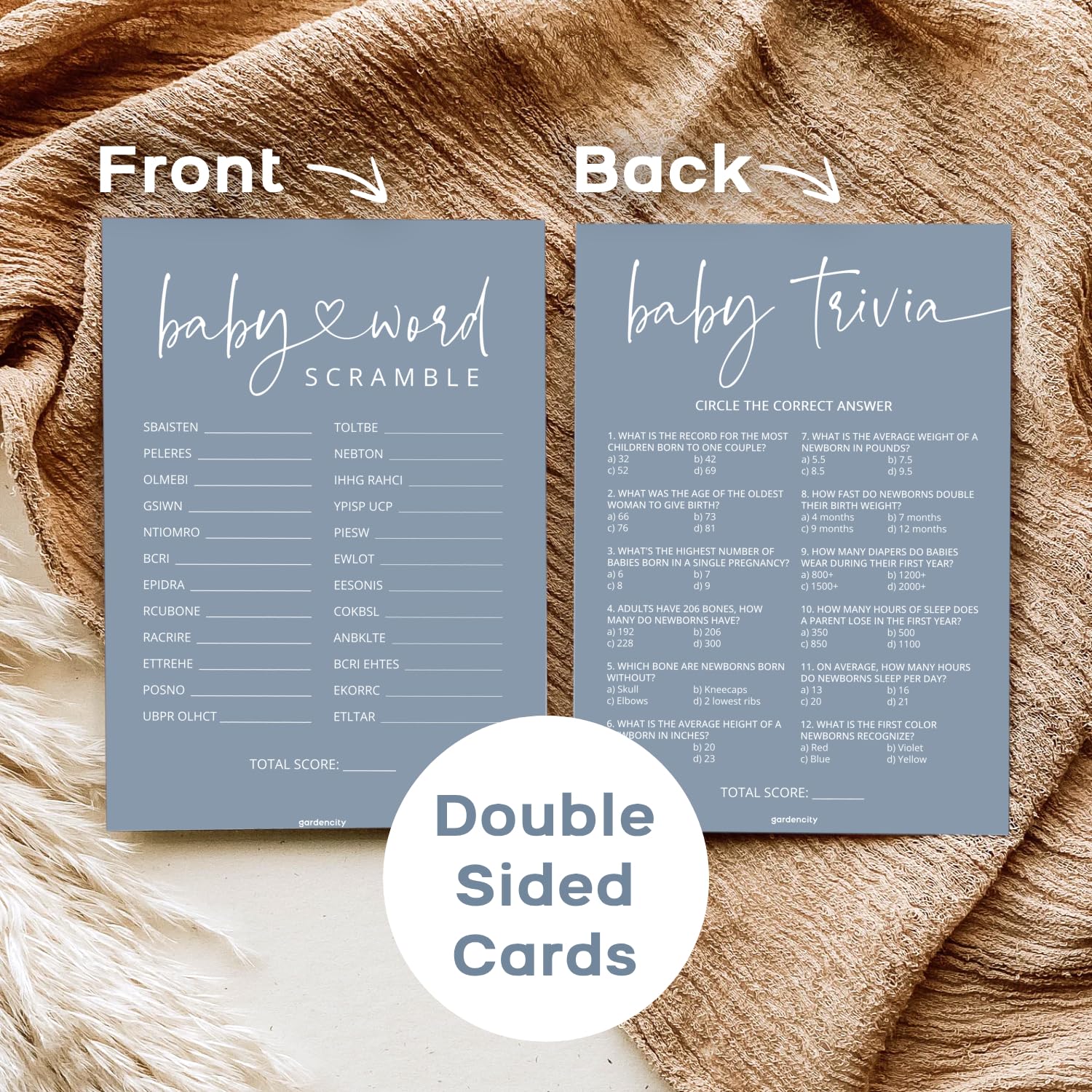 DOUBLE THE FUN: Includes two of the most popular baby shower games on 50 double-sided game cards and an answer sheet with instructions. Our Baby Trivia and Word Scramble games add fun and laughter to any baby shower event.