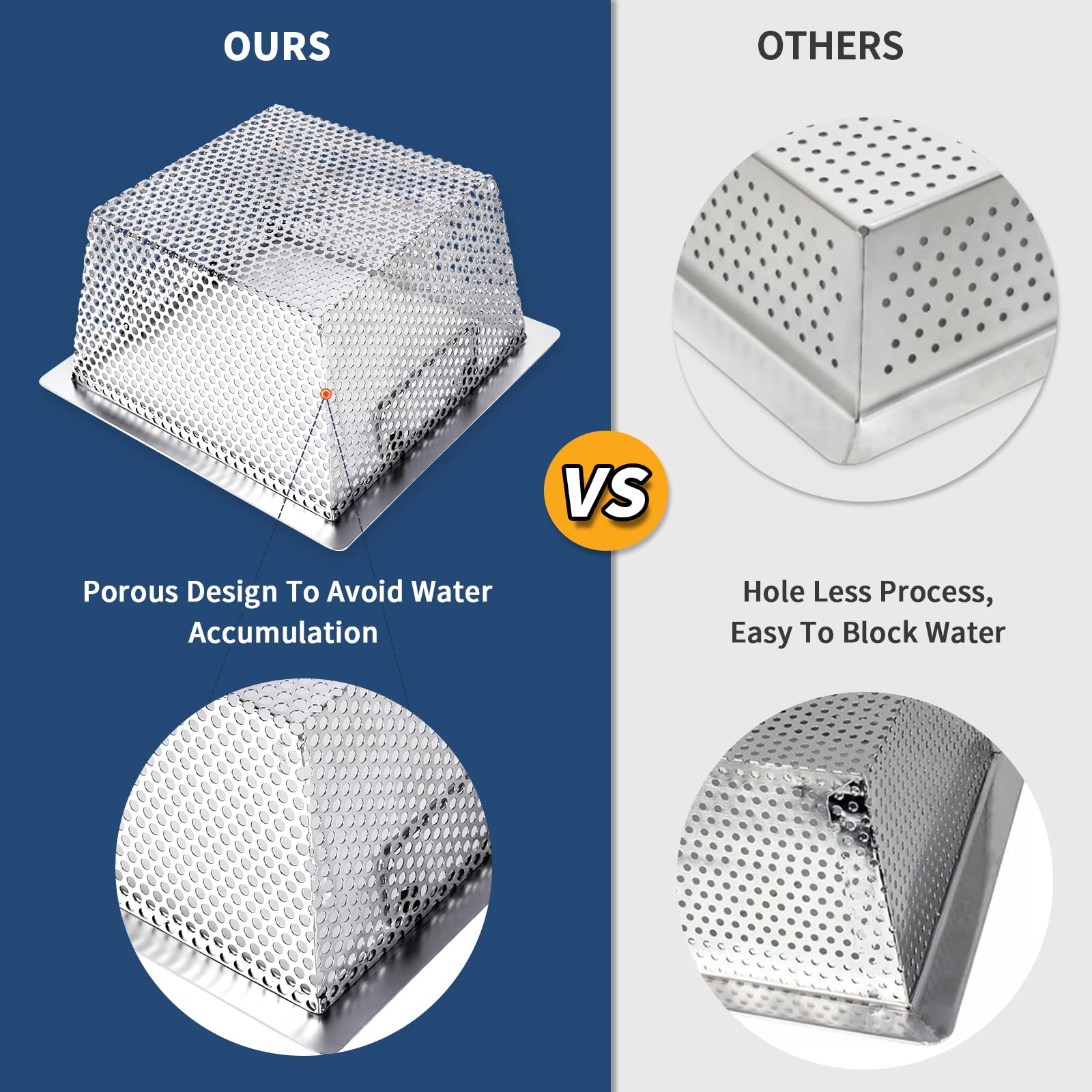 Increased Drainage Area: We have enhanced the density of drainage holes across the entire floor sink strainer while reducing drainage obstructions at welded corners. The larger drainage hole area ensures rapid expulsion of large water flows, preventing water accumulation issues, making it particularly suitable for high-water-usage areas such as bathrooms and kitchens