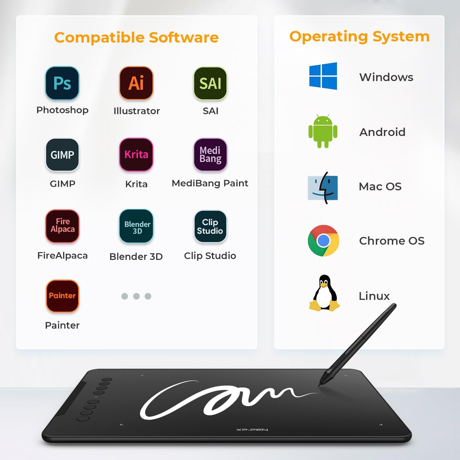 Digital Drawing Tablet: Strong Compatibility-The Deco 01 V3 is compatible with Windows 7 (or later), Android 10.0 or later), mac OS 10.13 (or later), Chrome OS 88 (or later) and Linux. Also compatible with many major designer software such as Photoshop, $Al, Painter, llustrator and Clip Studio, etc.*Please update your Windows to version 11 or Mac OS to version 12 first