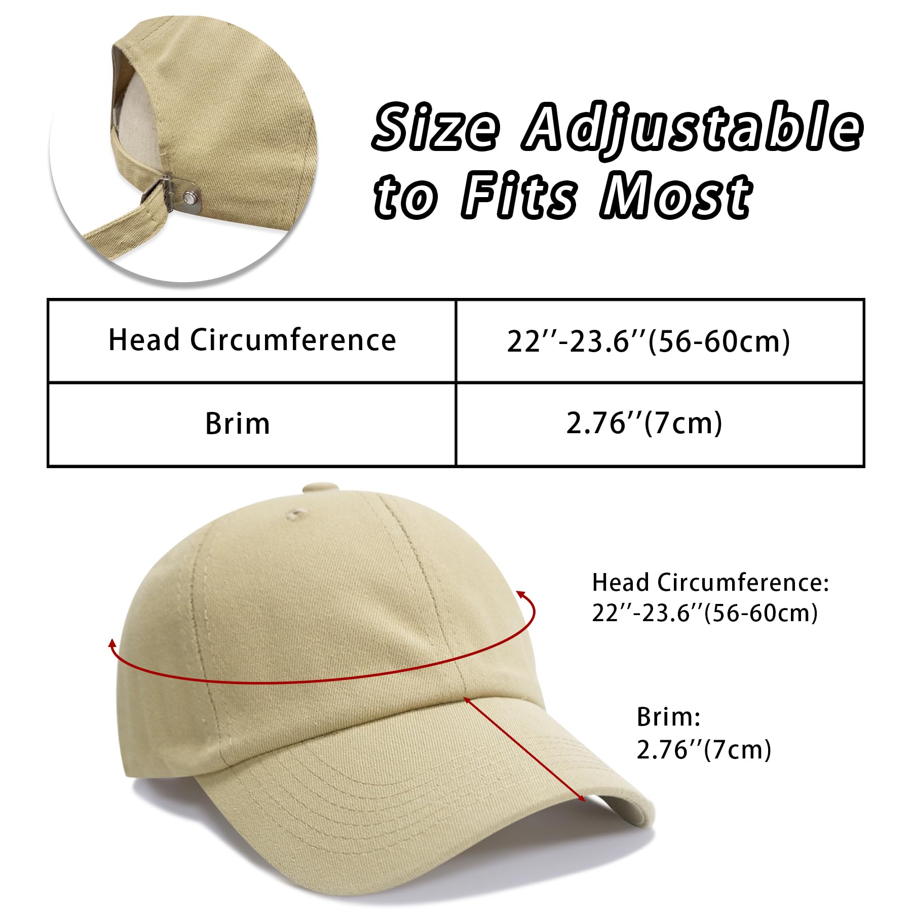 Description Low Profile UNCONSTRUCTED Plain baseball cap, classic and timeless style. The hat is comfortable for you to wear when doing activities Adjustable Size - One Size Fits Most: There is an adjustable button on the back of the baseball cap, which can be adjusted to a fitted size(21.2”-23.6”), the brim of the hat is 2.76”. Rear opening design fits women's low ponytail comfortably Adjustable metal button back closure, great fit for most head sizes ensure comfort at all times. The baseball cap is lightweight and has tightly stitching and can be used for more time The baseball cap is a stylish minimalist design, it is suitable for both men and women, comfortable and breathable, and easy to wear Wide Applicable Occasion: The unisex design makes it fits for men and women for everyday, sports, fishing, travel, outdoor activities, outing, etc