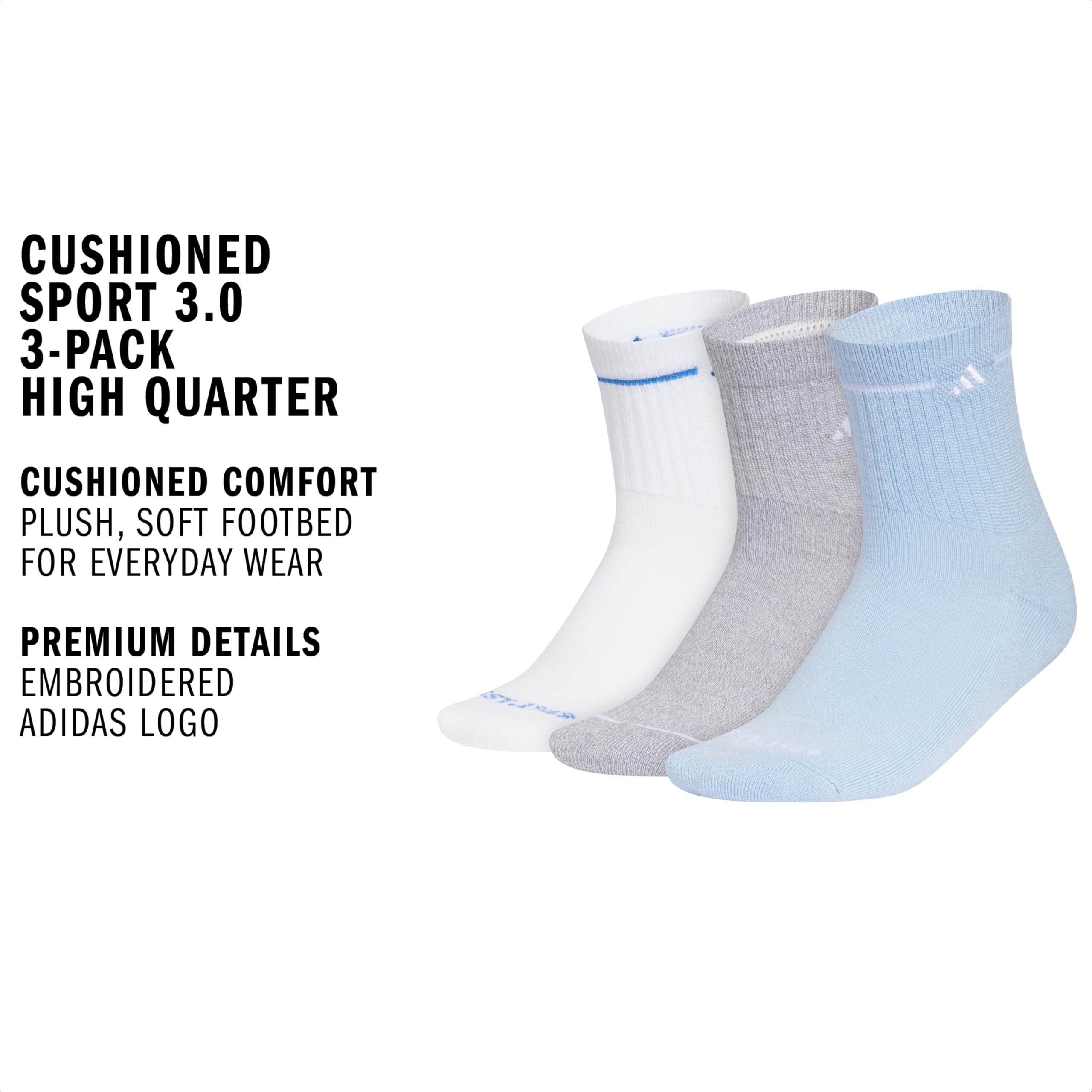 Description These women's cushioned quarter-high socks go long on comfort. Thoughtful details like extra arch support and moisture-wicking yarns help you power through your personal records. Simple adidas logos root your style in sport. Includes three pairs, so you have options.