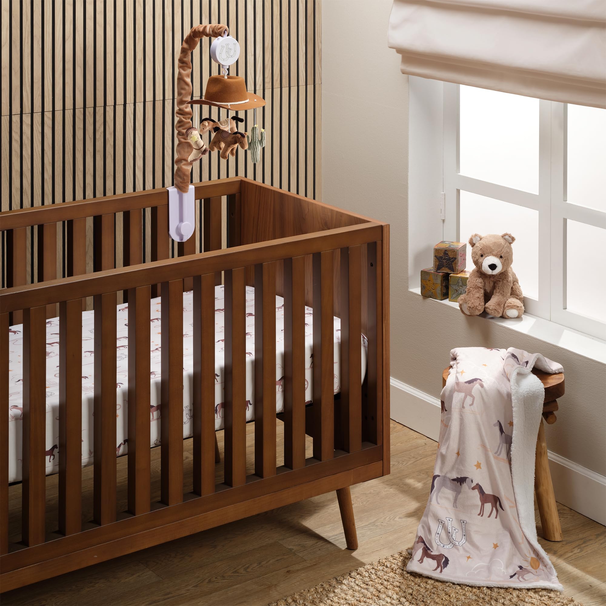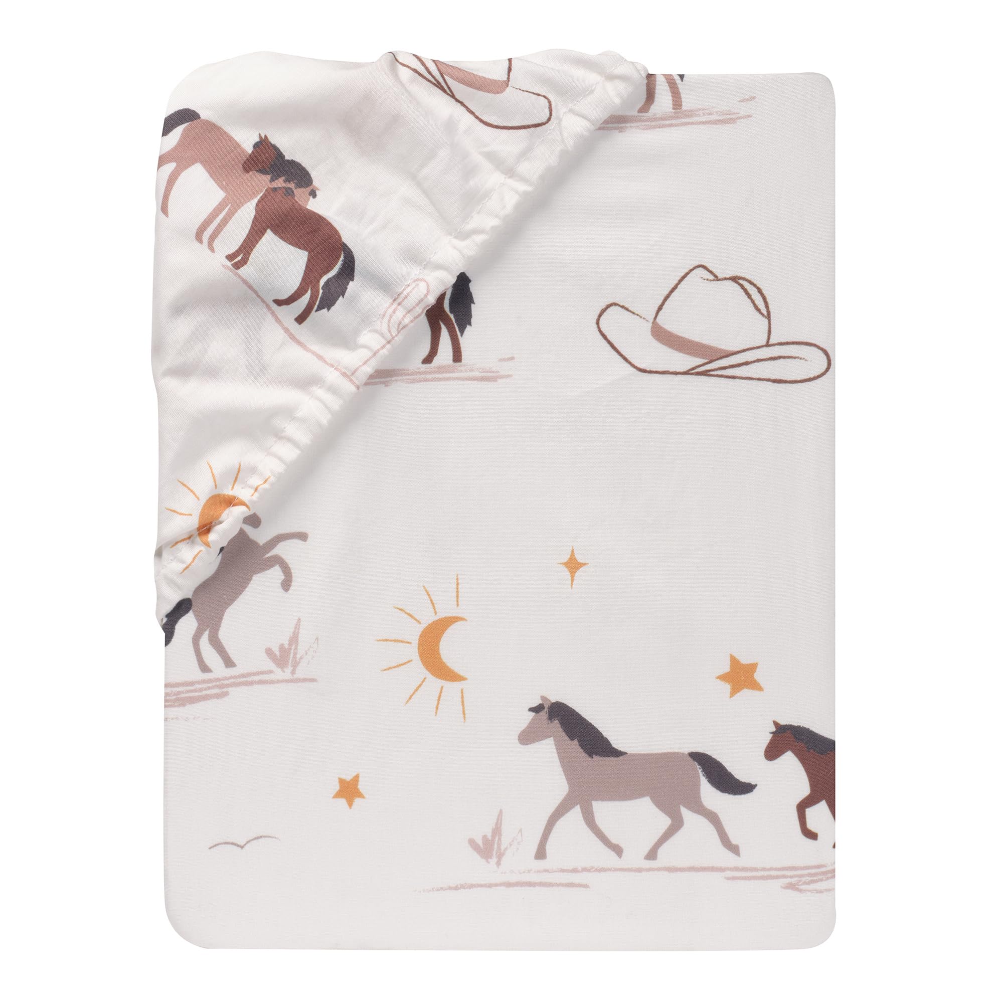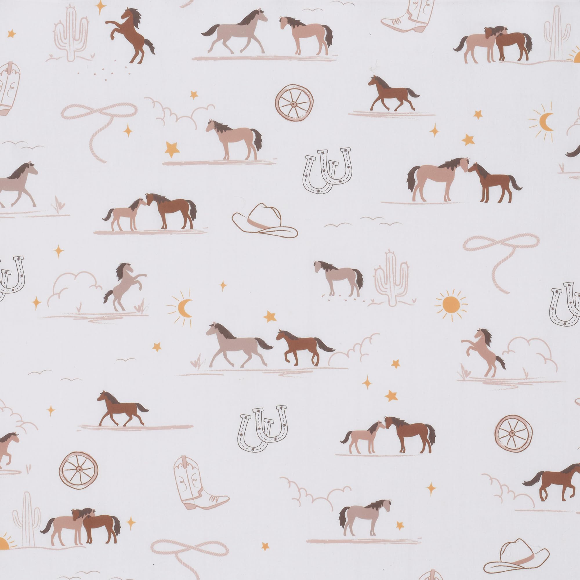 Features playful horses, cowboy hats and boots, wagon wheels, cacti, sun, moon, and clouds