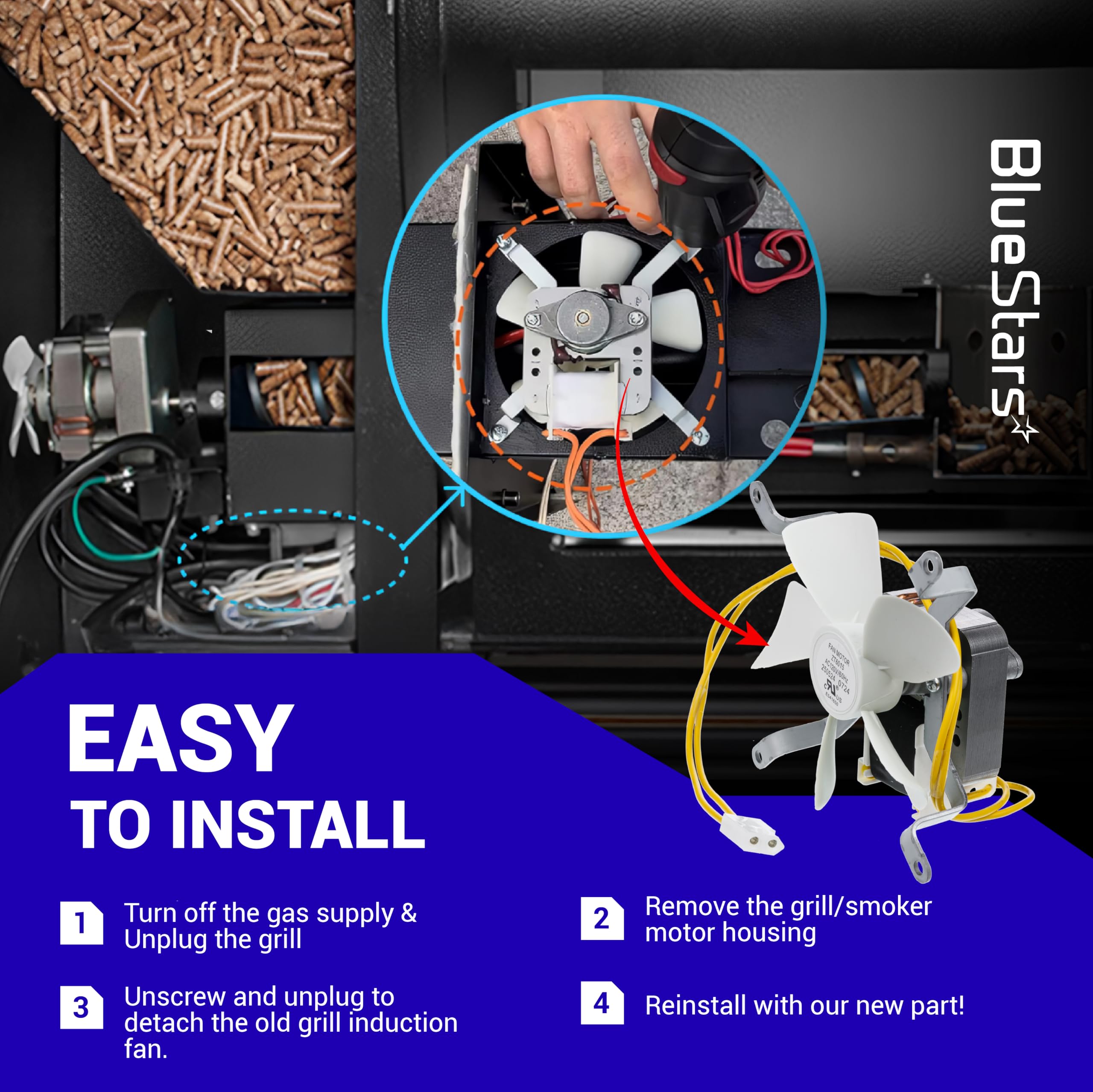 EASY TO INSTALL: Before attempting any repairs, ensure the gas supply is turned off and the stove is unplugged. Please wear work gloves and be careful while installing to ensure safety. Simply remove grill/smoker motor housing, then unscrew and unplug to detach the old induction fan. Reinstall with our new part!