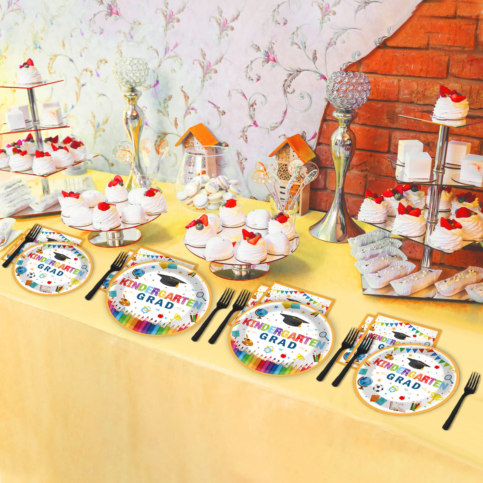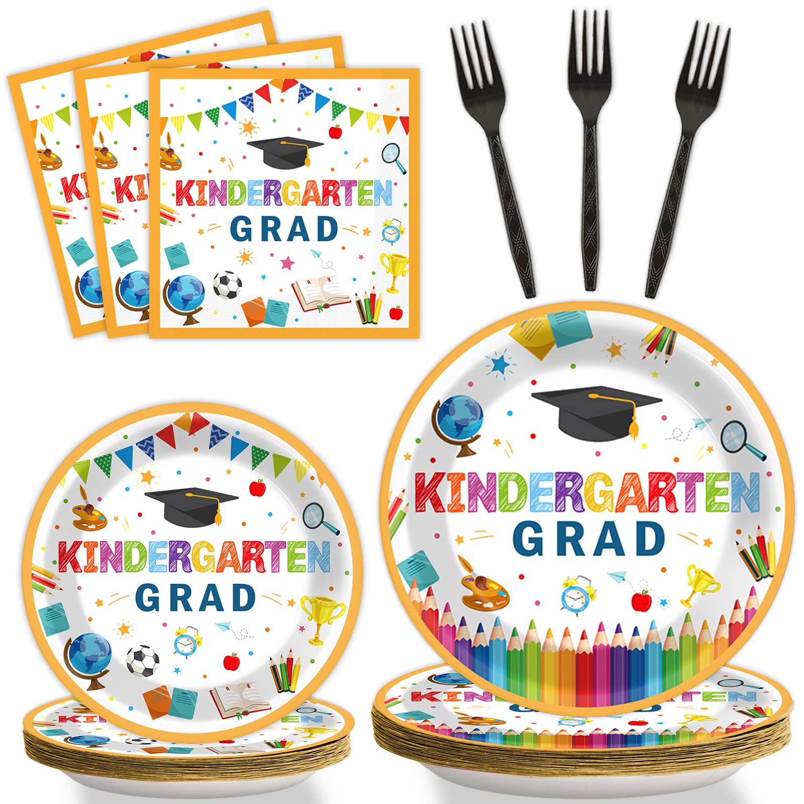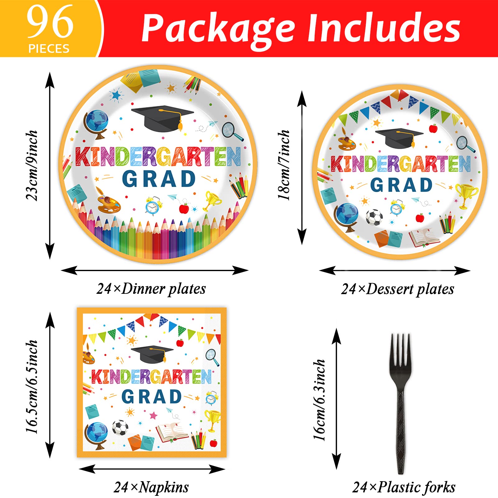 What you will get: You'll receive 24 9" kindergarten graduation party paper plates, 24 7" kindergarten graduation paper plates, 24 6.5" kindergarten graduation napkin replacers, and 24 plastic black forks, each set serves 24 people guests