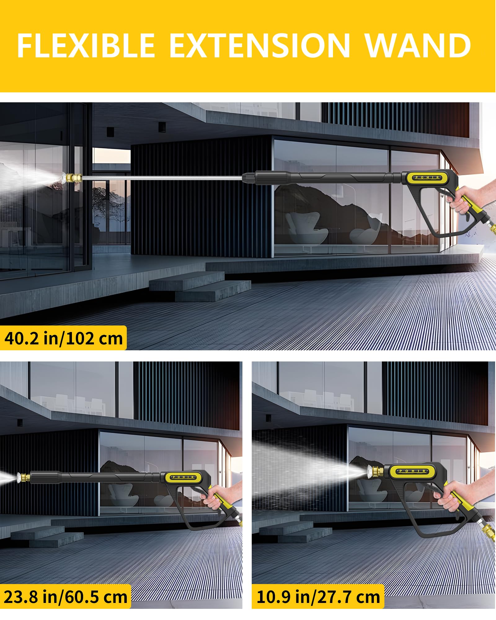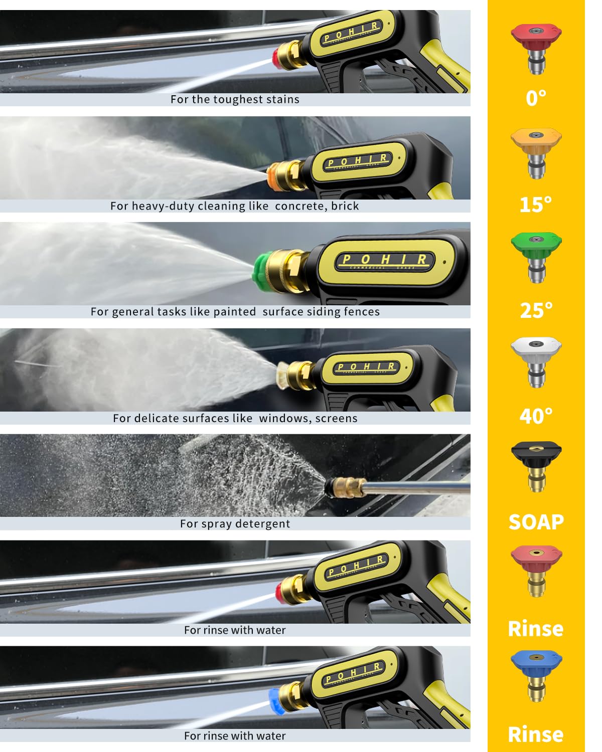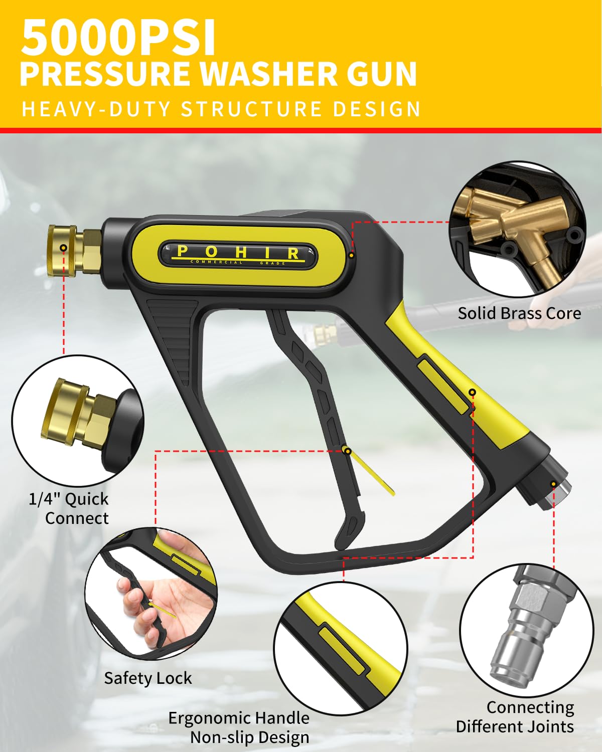 【5000 PSI PRESSURE WASHER GUN】 POHIR pressure washer gun max.5000 PSI with a water flow rate of 12 GPM. With extension wands, full length up to 40", easy to adjust the length to clean hardly and deeply