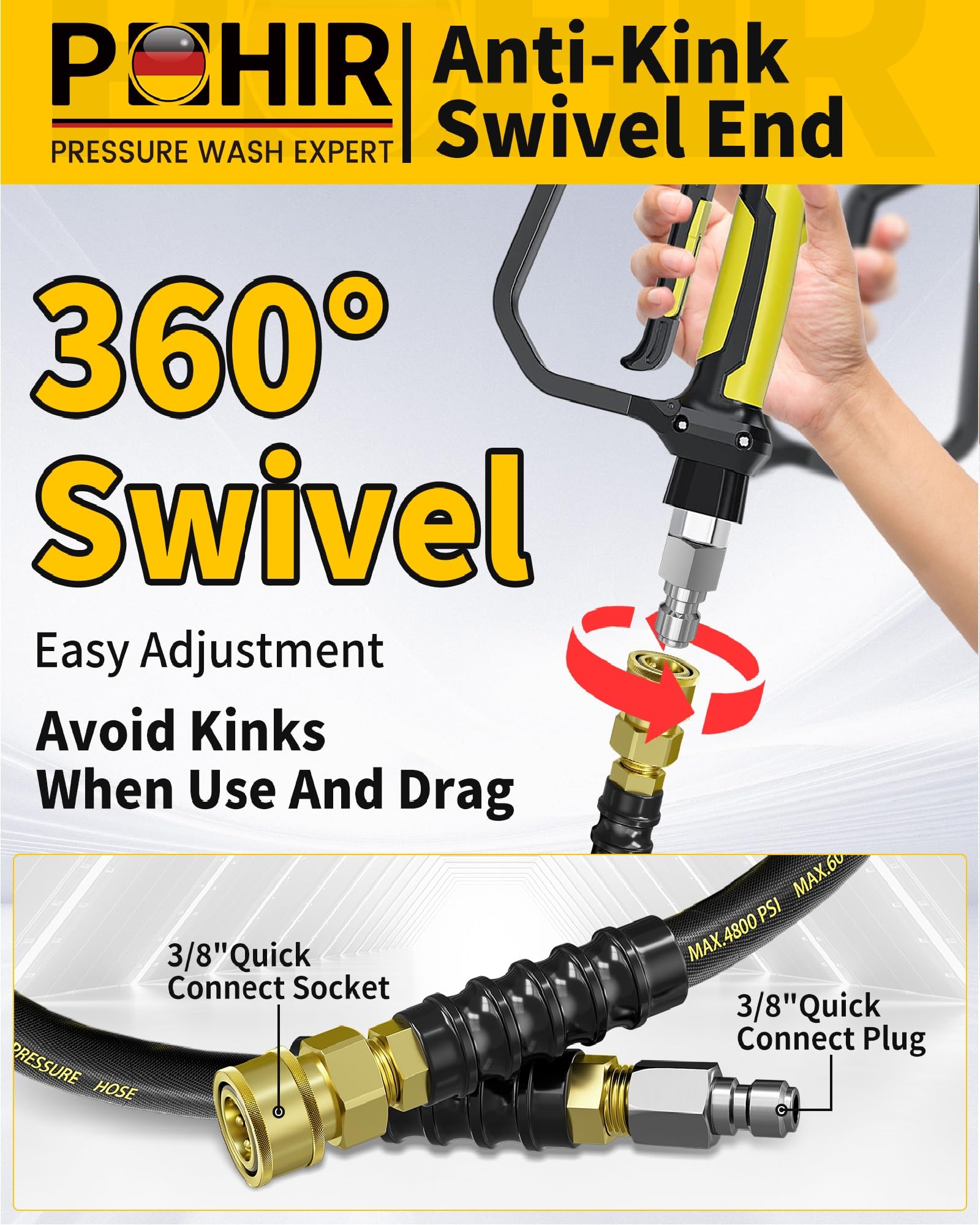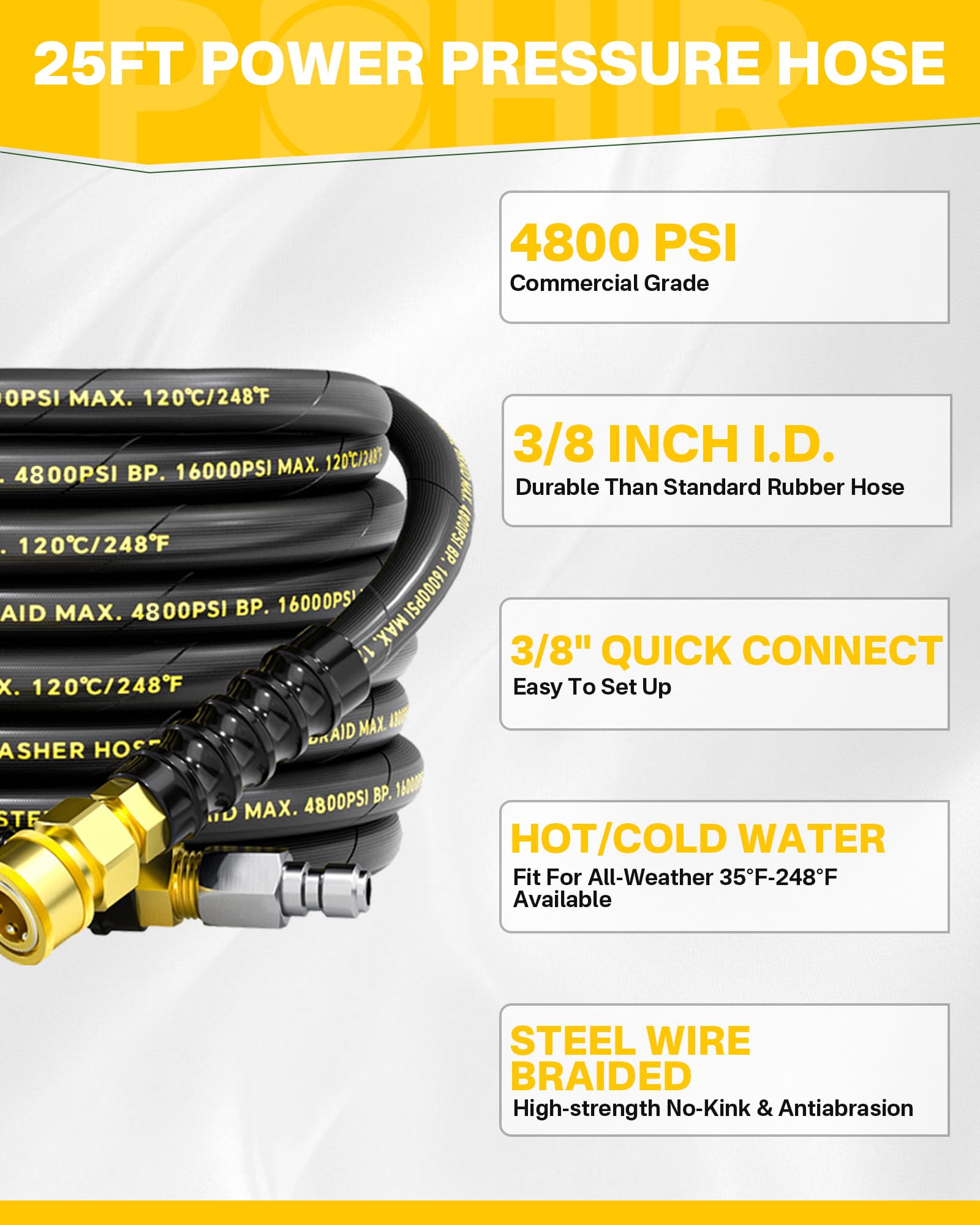 【3/8'' DIAMETER PRESSURE WASHER HOSE】Max Working pressure: 4800 PSI to 16000 PSI burst pressure, MAX.120℃/248℉. It fits most gas-powered or electric pressure washer, suitable for household residential cleaning & commercial use