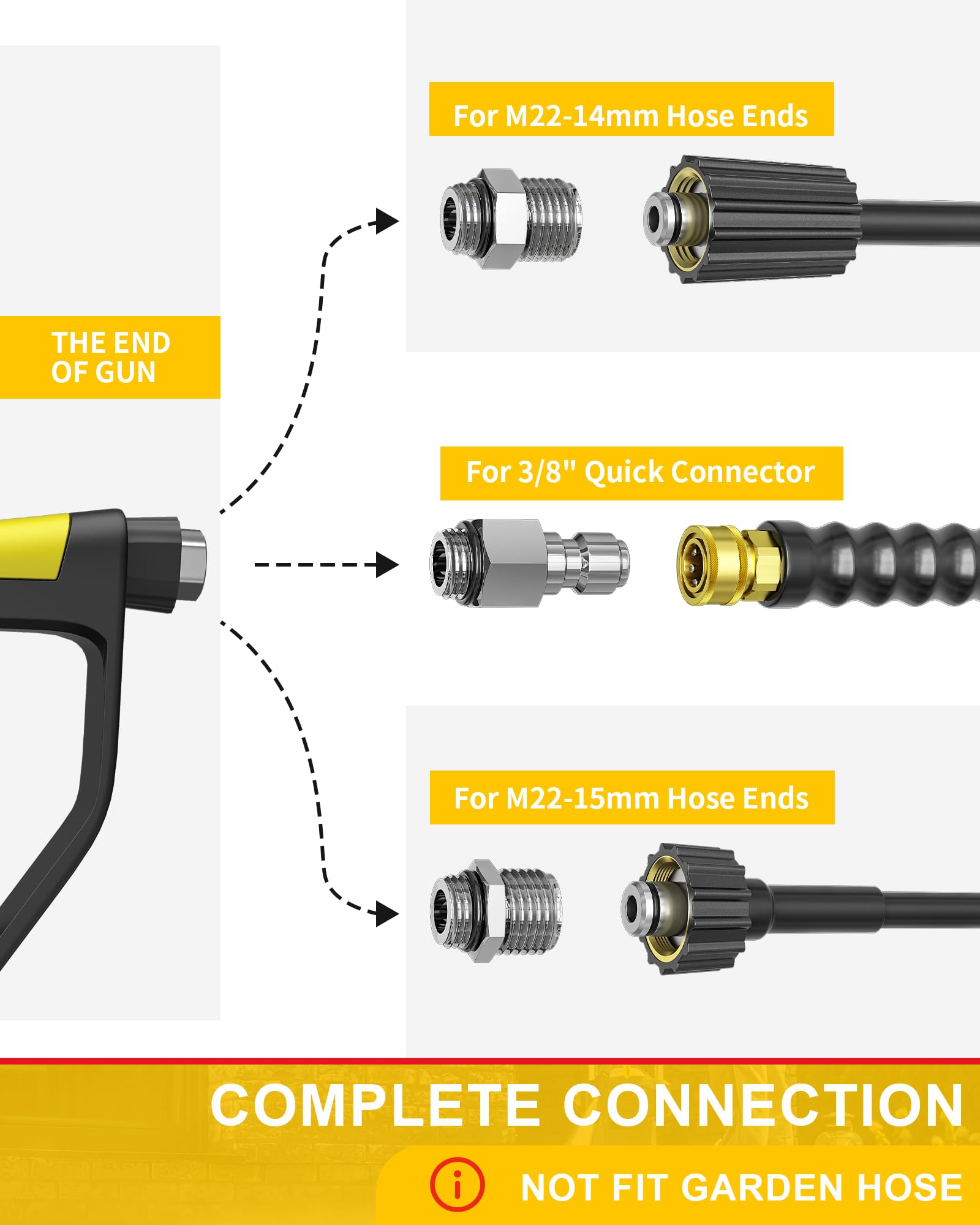 【SWIVEL QUICK CONNECT NO-KINK】Includes a 3/8" swivel quick connector, M22-14mm / M22-15mm coupler, and 5 spray nozzle tips, providing a complete set for power pressure washing, perfectly used with the foam cannon and other accessories,suitable for commercial, home, or professional use