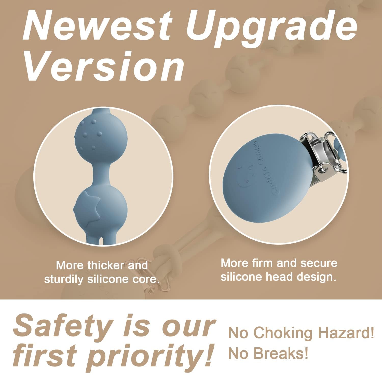 FOOD GRADE SILICONE: The beads of our pacifier clip are made from 100% pure food-grade silicone—a material we carefully pick for its dependable safety, letting you use the clip with total ease