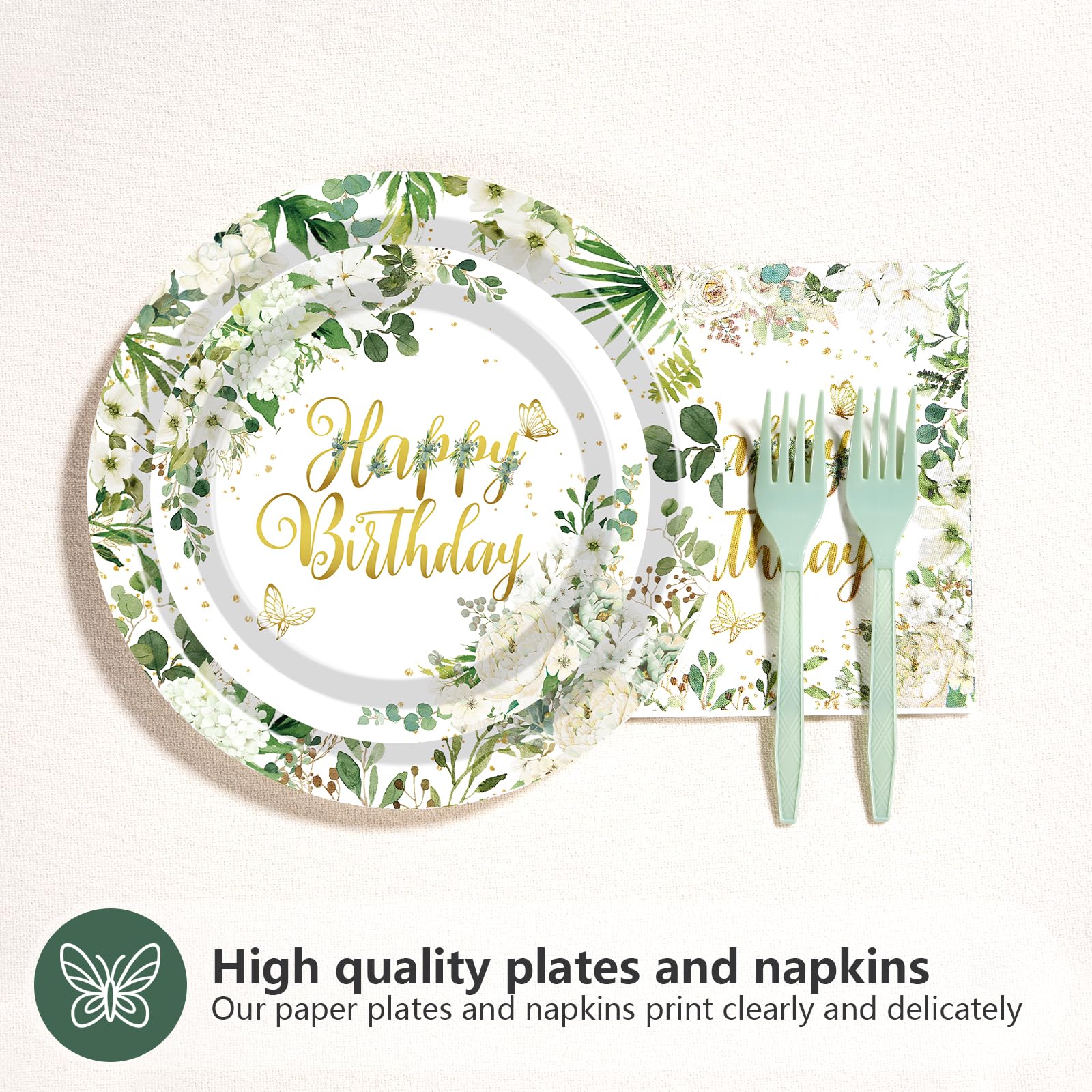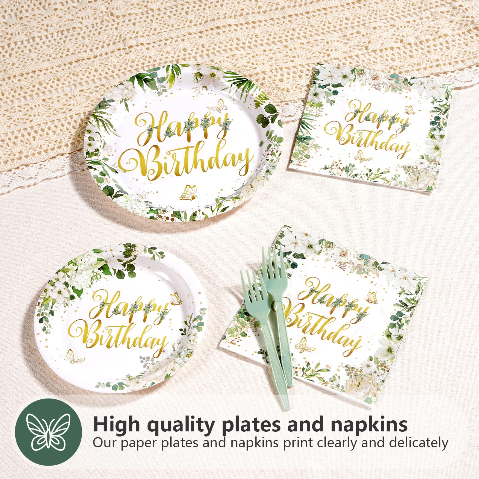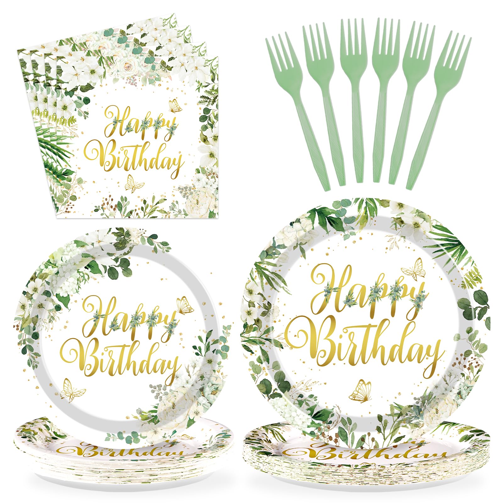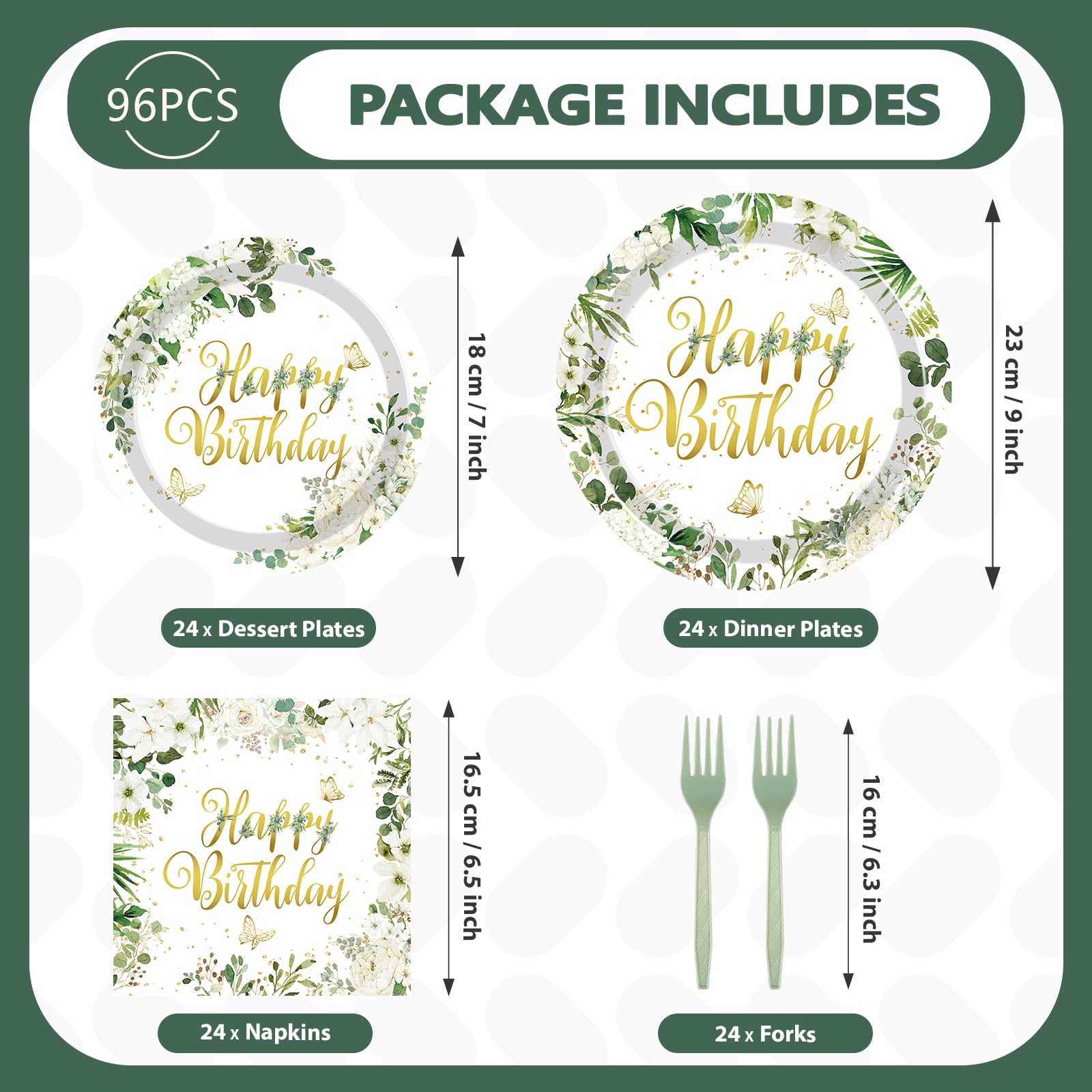 Elegant Birthday-Themed Design: Crafted with a delicate sage white floral pattern and bold "Happy Birthday" lettering, this dinnerware set elevates your celebrations. The 9-inch and 7-inch plates feature a cohesive design for a polished tablescape, while the 6.5-inch napkins add a matching decorative touch. Durable paper material ensures vibrant colors stay intact, resisting leaks and grease during meals. Ideal for birthdays, family gatherings, or themed parties