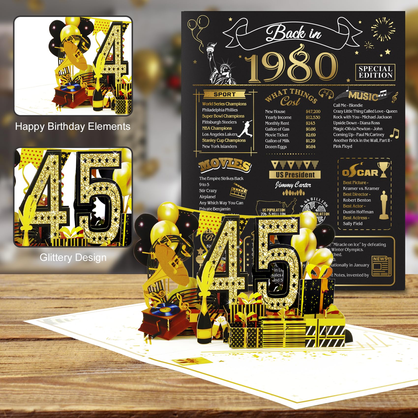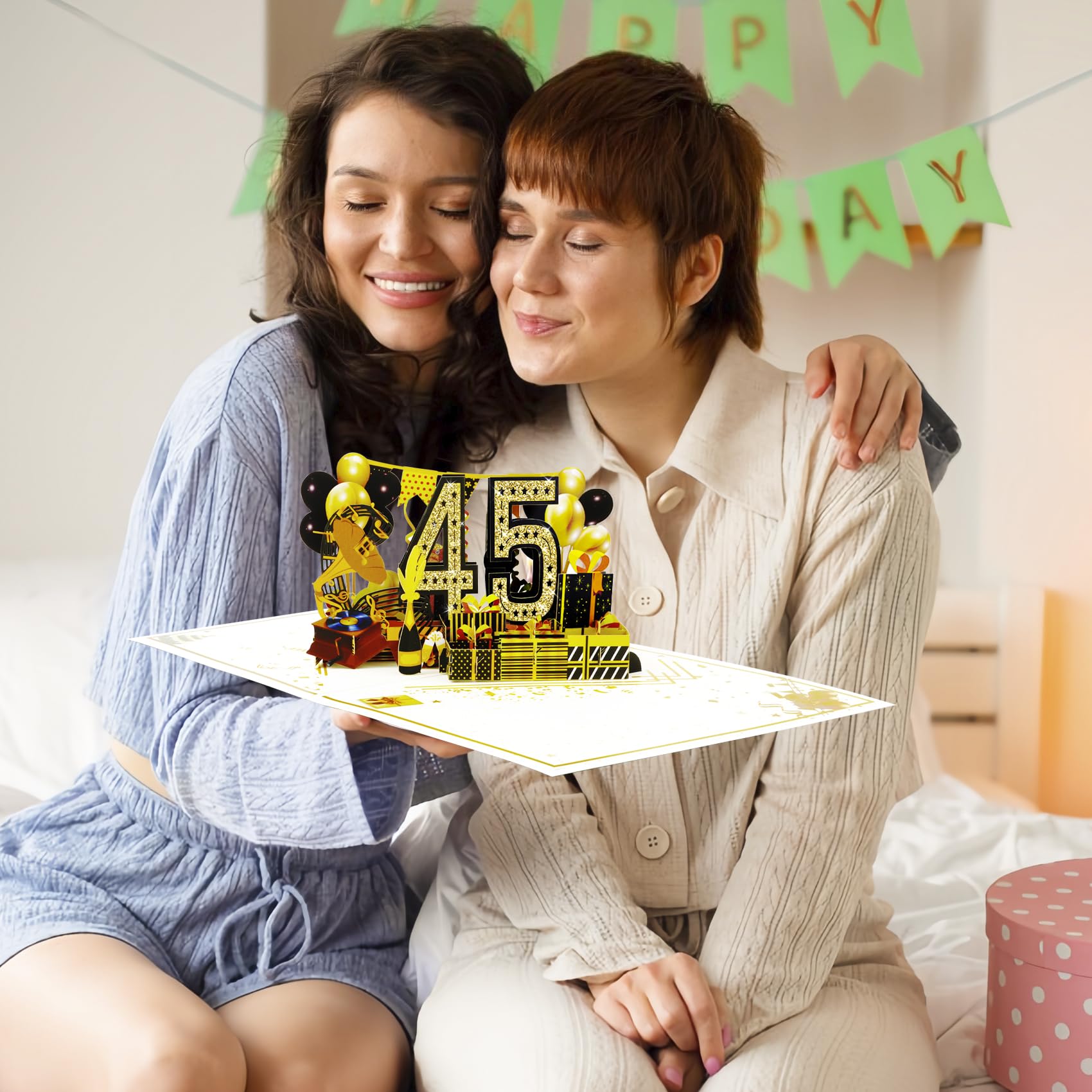 45th Birthday Pop Up Card: This cute 45th birthday pop up card is mini-masterpiece displays a beautiful 3D pop-up design.It can be popped up of features “45” with balloons and gift box. Ideal Creative Gifts for party. Makes your birthday or anniversary party’s decorations stand out