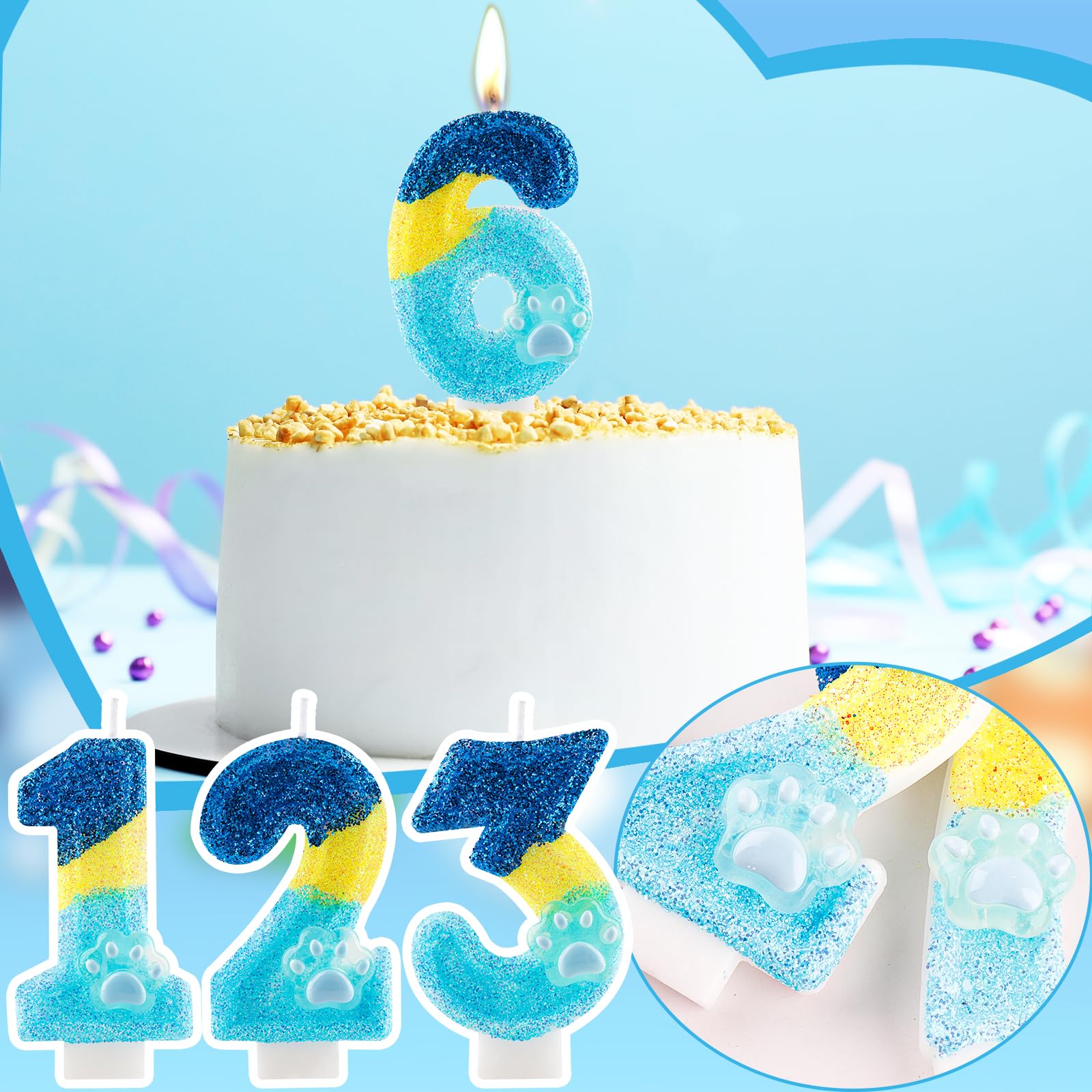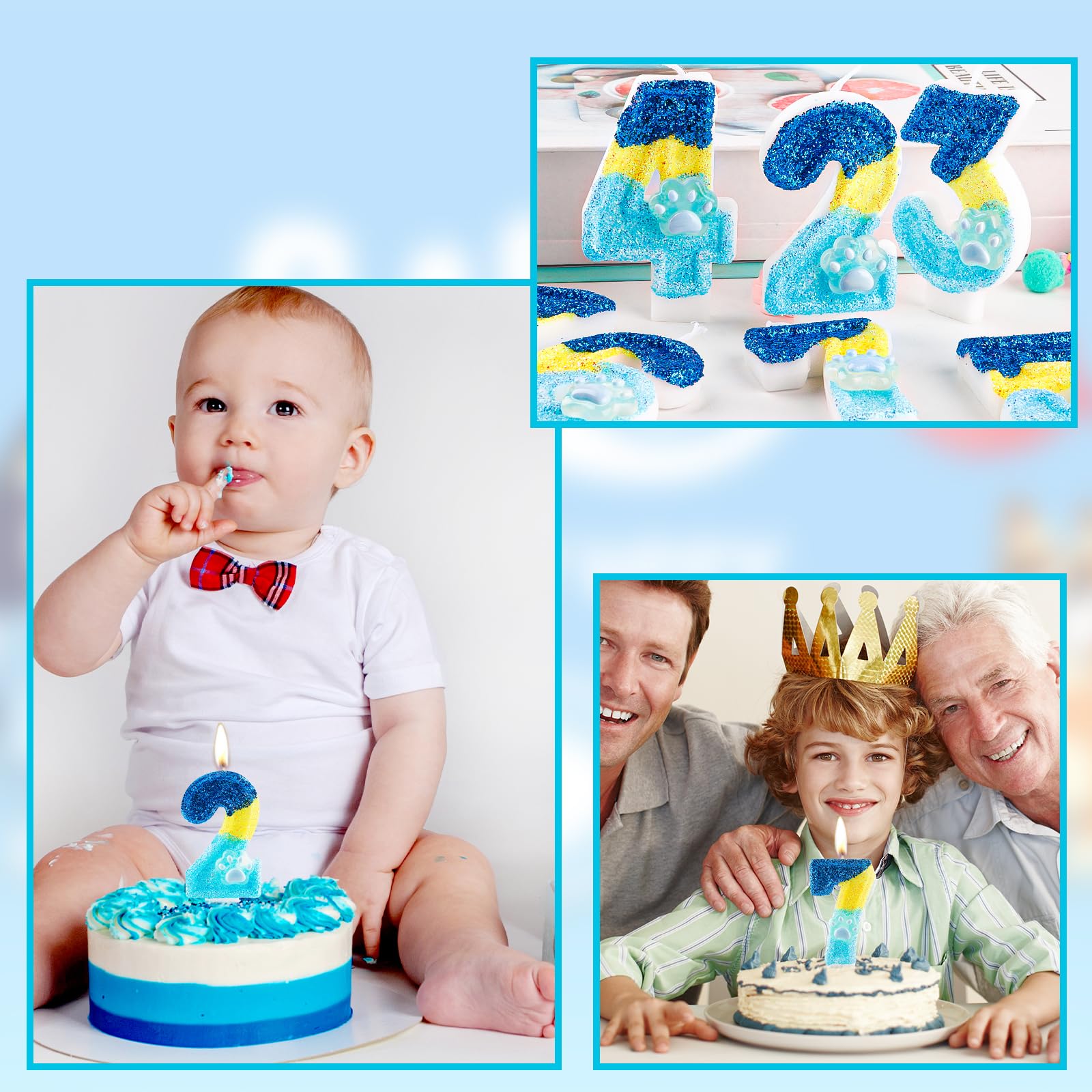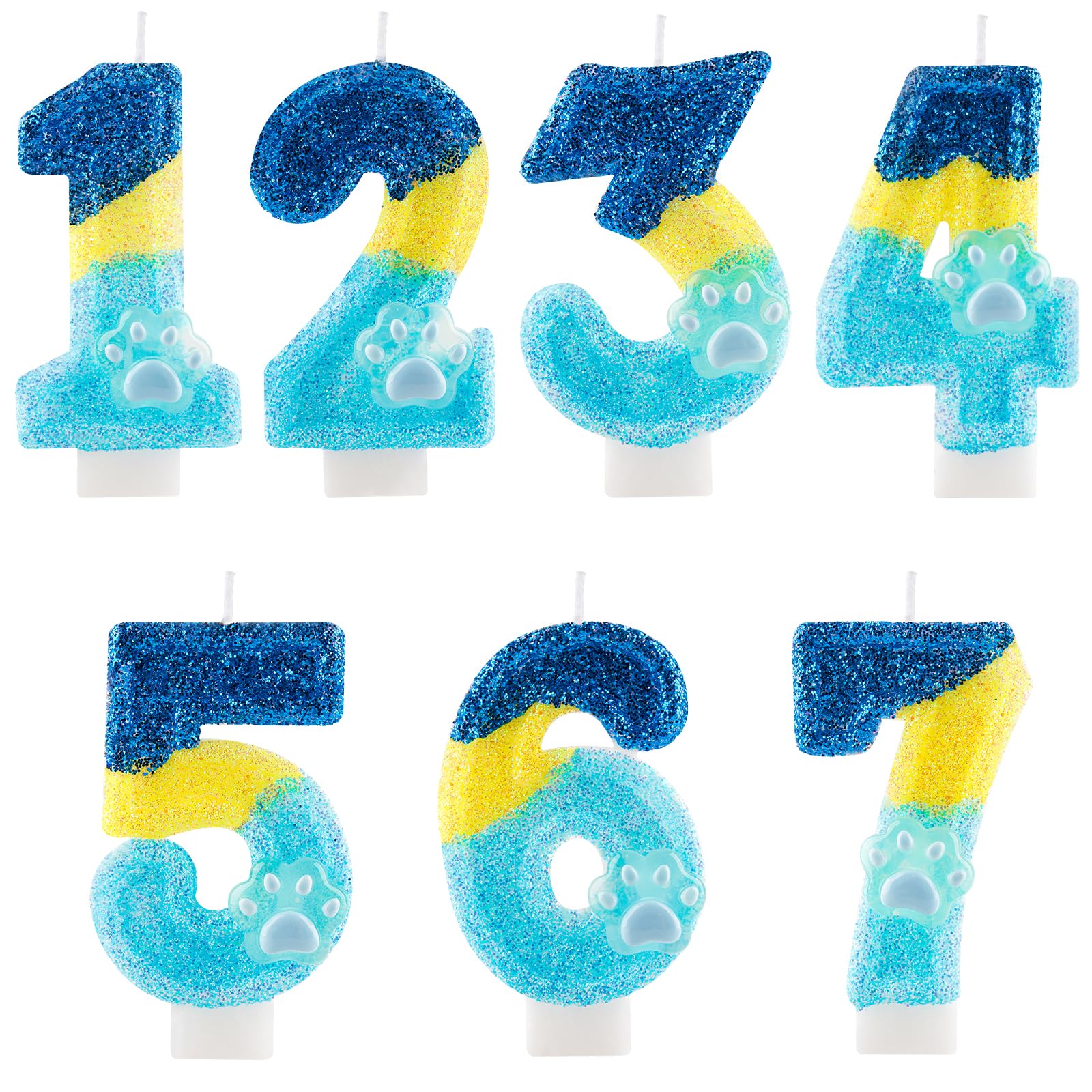 【BLUE DOG PAW BIRTHDAY DECORATIONS MULTI-USAGE 】: This glitter number candle is in blue yellow colors, bright and shining in the dark. And it matches with party decorations of various themes and colors easily. It is not only for children's birthdays but for adult pets dogs birthdays. Ideal cake decoration for many occasions, such as boys girls birthdays, baby showers, anniversaries,dogs cats birthday party, blue theme party, must-have items for party cake