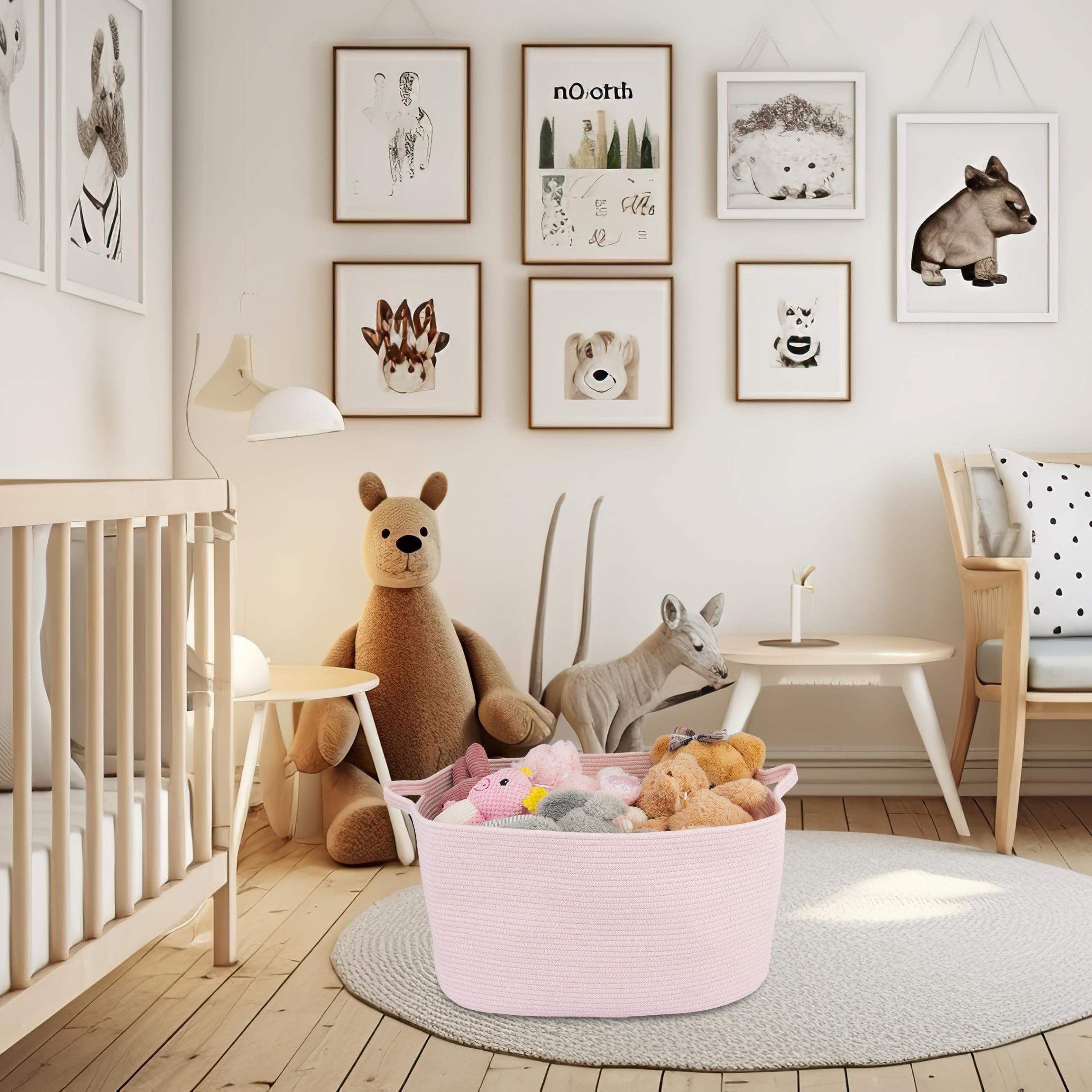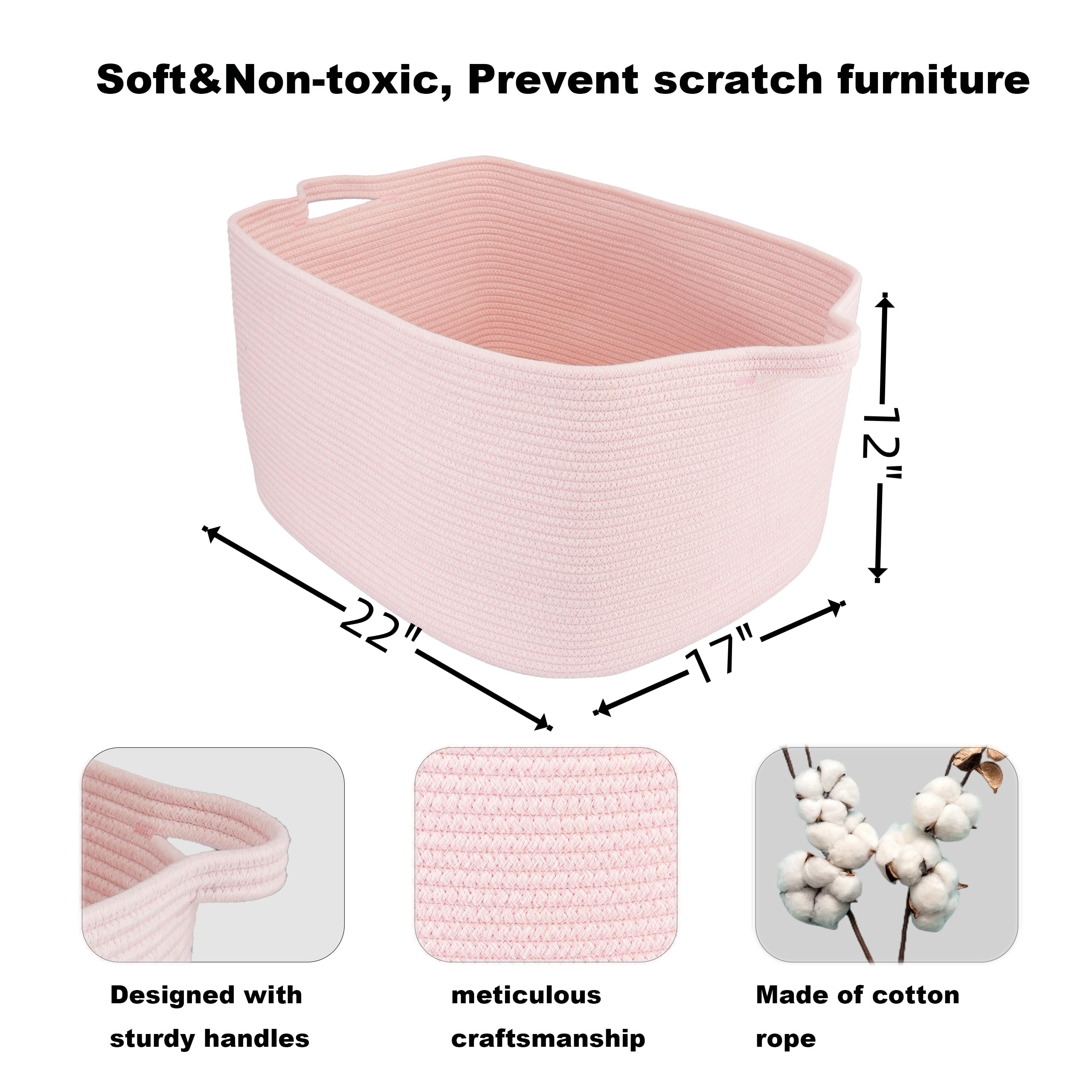 Toy storage basket for kids with handles: This rope basket is features long and sturdy handles for easy mobility. this large rectangle rope basket is perfect for storing toys and doubles as a pet toy basket, suitable for dog toy storage. It also serves as a convenient toy basket for kids or baby nursery basket. Crafted from soft cotton rope, the cloth basket ensures safety with no sharp edges, preventing scratches on your furniture or floors.